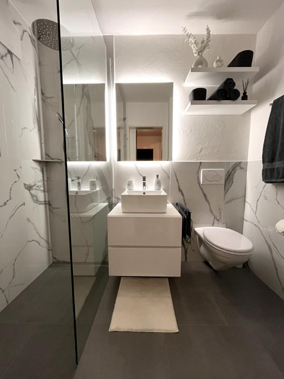 Bathroom with rain shower, WC and washbasin.
