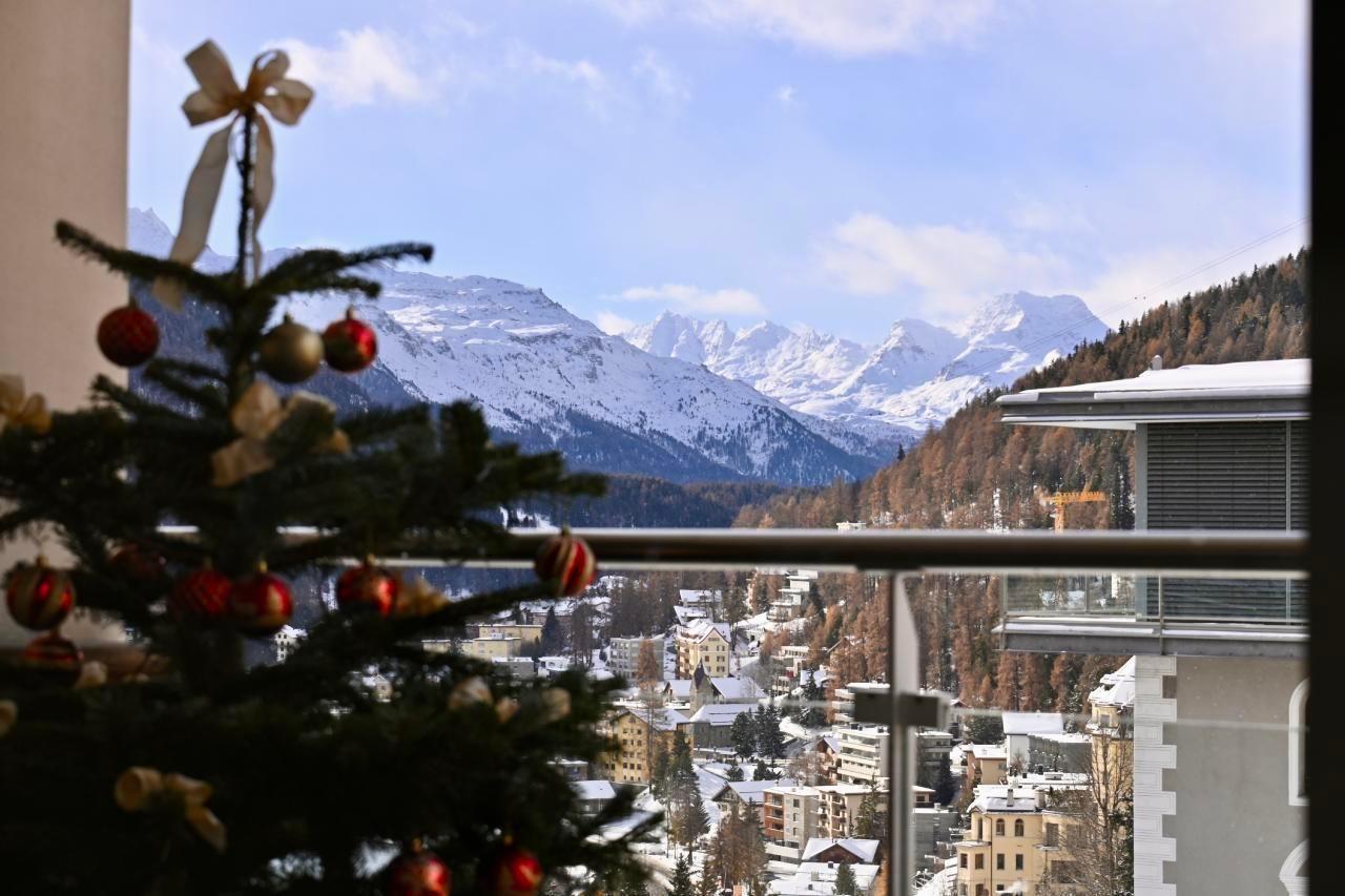 From the balcony you have a spectacular view of the Engadine mountains, the lake and St. Moritz. In the evening, when the sun goes down, this view is particularly beautiful, especially when the lights of St. Moritz come on.