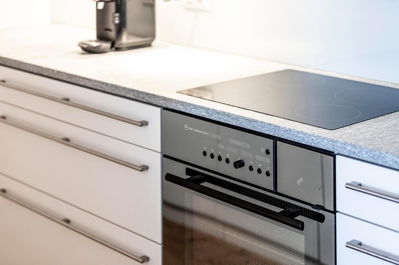 The kitchen is equipped with a dishwasher and a steam oven from Zug as well as a fridge with freezer compartment.