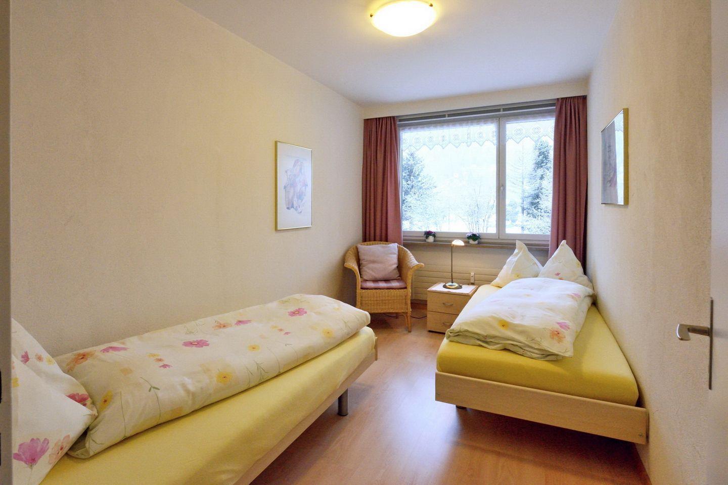 Die Ferienwohnung verfügt über ein Schlafzimmer mit einem Doppelbett sowie ein Schlafzimmer mit zwei Einzelbetten. Im Wohnzimmer finden Sie eine gemütliche Sofaecke mit TV sowie eine weitere Schlafmöglichkeiten in Form von einem 1.60er Schrankbett. Die Wohnung hat ein Badezimmer mit Dusche/WC sowie ein weiteres separates WC. Die Küche ist komplett eingerichtet und mit modernen Geräten ausgestattet. Eine Essecke steht ebenfalls zur Verfügung. Vom Balkon haben Sie eine schöne Panoramasicht auf Corviglia/Piz Nair.