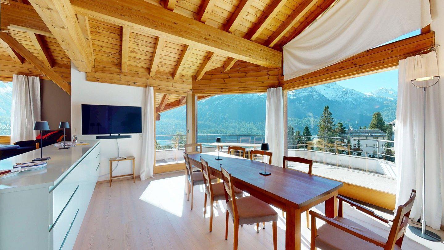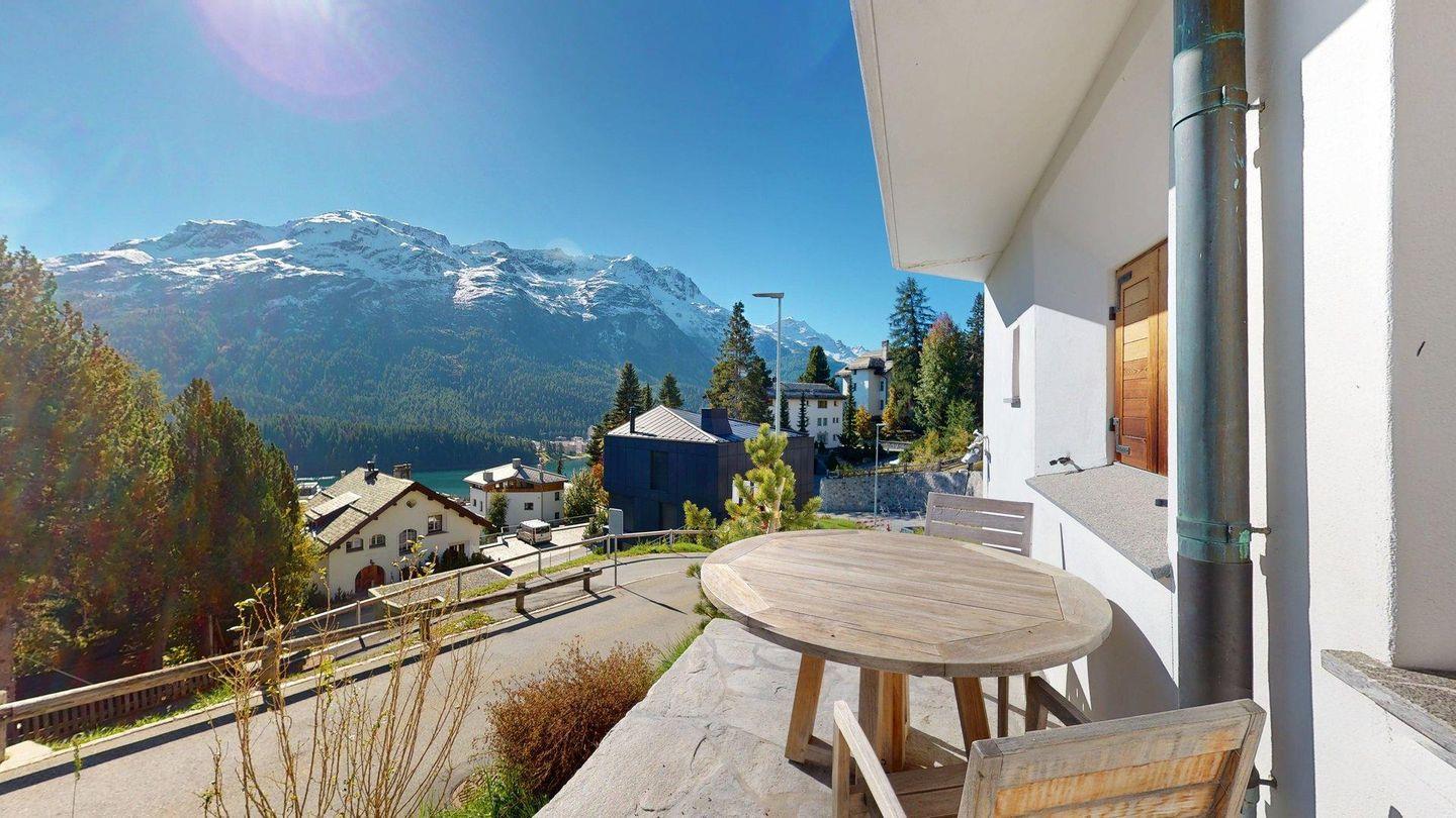 Das grosszügige, lichtdurchflutete Wohn- und Esszimmer bietet einen atemberaubenden Ausblick auf die Engadiner Bergwelt und öffnet sich zu einem sonnigen Balkon – der perfekte Ort, um entspannte Stunden zu geniessen. Die geschlossene, modern ausgestattete Küche lädt zu kulinarischen Momenten ein und ist bestens ausgestattet.