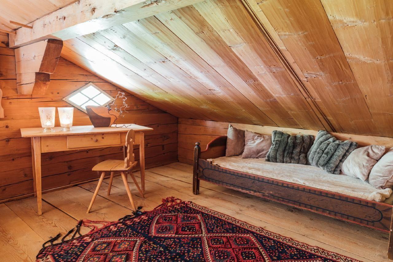 The outdoor area of the BLACHTY impresses with its south-west facing meadow plot with a natural stone terrace and lovingly arranged stones. Here you can enjoy the picturesque view over the valley or admire the sight of grazing cows in spring and autumn. The charm of this unique holiday home is further enhanced by its picturesque mullioned windows and authentic wooden architecture, allowing you to immerse yourself in another time.