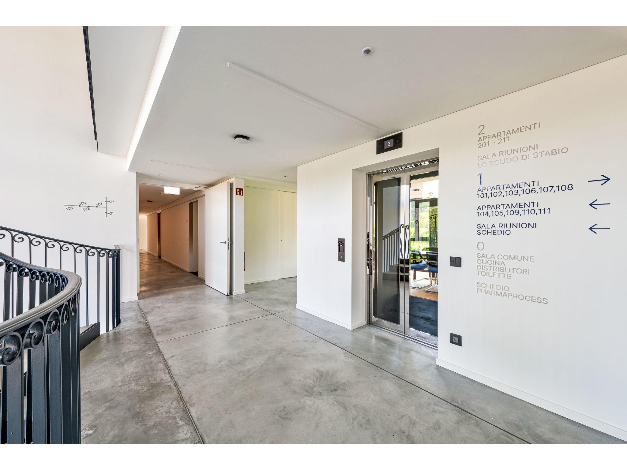 Stabio 20 km from Lugano Centro: Modern, comfortable aparthotel "Lo Scudo di Stabio", 350 m a.s.l., 2 storeys, detached, built in 2022, surrounded by meadows and vineyards. 15 apartments in the residence. In the resort 1 km from the centre of Stabio, on a main road, north-east facing position. For shared use: property 1'000 m2, large, beautiful garden lawn and plants. In the house: reception, lounge with TV, WiFi, lift, storage room for bicycles, central heating system, air conditioning. Linen change daily (suppl. charge extra). Towel change daily (suppl. charge extra). Room cleaning daily on request (extra). Motor access to the house. Parking on the premises. E-charging station. Supermarket 1 km, bar 550 m, bus stop 1 m, railway station "Stabio" 1.2 km. Nearby attractions: Fossilienmuseum Arzo 4.8 km, Chicco d'Oro Kaffee Museum 5 km, Villa Braghenti 8 km, La Vecchia Stazione 8 km, Torre Pezza 9 km, Madonna di San Bernardino 9 km. Well-known lakes can easily be reached: Lago di Lugano 5 km. Hiking paths: Monte San Giorgio 9 km, Monte Generoso, Valle di Muggio. Outdoors: Picnic area, outdoor furniture, garden. Common area with shared lounge/TV area, snack vending machines, vending machines, coffee and tea making facilities. Business services: Conference and event rooms. Scudo di Stabio combines flexible hospitality with ongoing sustainability: 22 furnished apartments (35–50 m²), complemented by common areas such as a 130 m² common room and a 26 m² meeting room. The approach is holistically sustainable: load-bearing structures primarily made of wood with a prefabricated frame, natural insulation materials, a green roof and highly efficient systems to reduce energy consumption and emissions throughout the entire life cycle. The exposed cork facades integrate photovoltaic modules on the south and west sides, combining energy production with the architectural identity. Soft mobility is supported by electric car charging stations, a bicycle service station and secure bike storage on the ground floor. The complex is the first building in Ticino to be SNBS certified and has obtained the Minergie-P-ECO certification (no. TI-011-P-ECO) and the Swisstainable - Level II label, demonstrating its ecological, social and economic quality. It was also selected/recognized at the 2022 Active House Awards, highlighting its focus on user comfort (light, air, well-being) and energy efficiency.