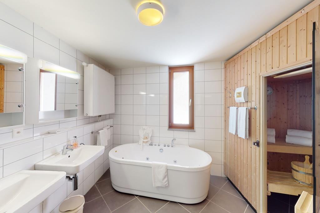 The holiday apartment has 1 bedroom with 2 single beds each 1 bedroom with 3 single beds each a bathroom with bath, shower, whirlpool, sauna, toilet and washbasin a separate toilet with washbasin a fully equipped kitchen with Nespresso capsule machine a balcony with lake- and mountain view Interior & technical equipment