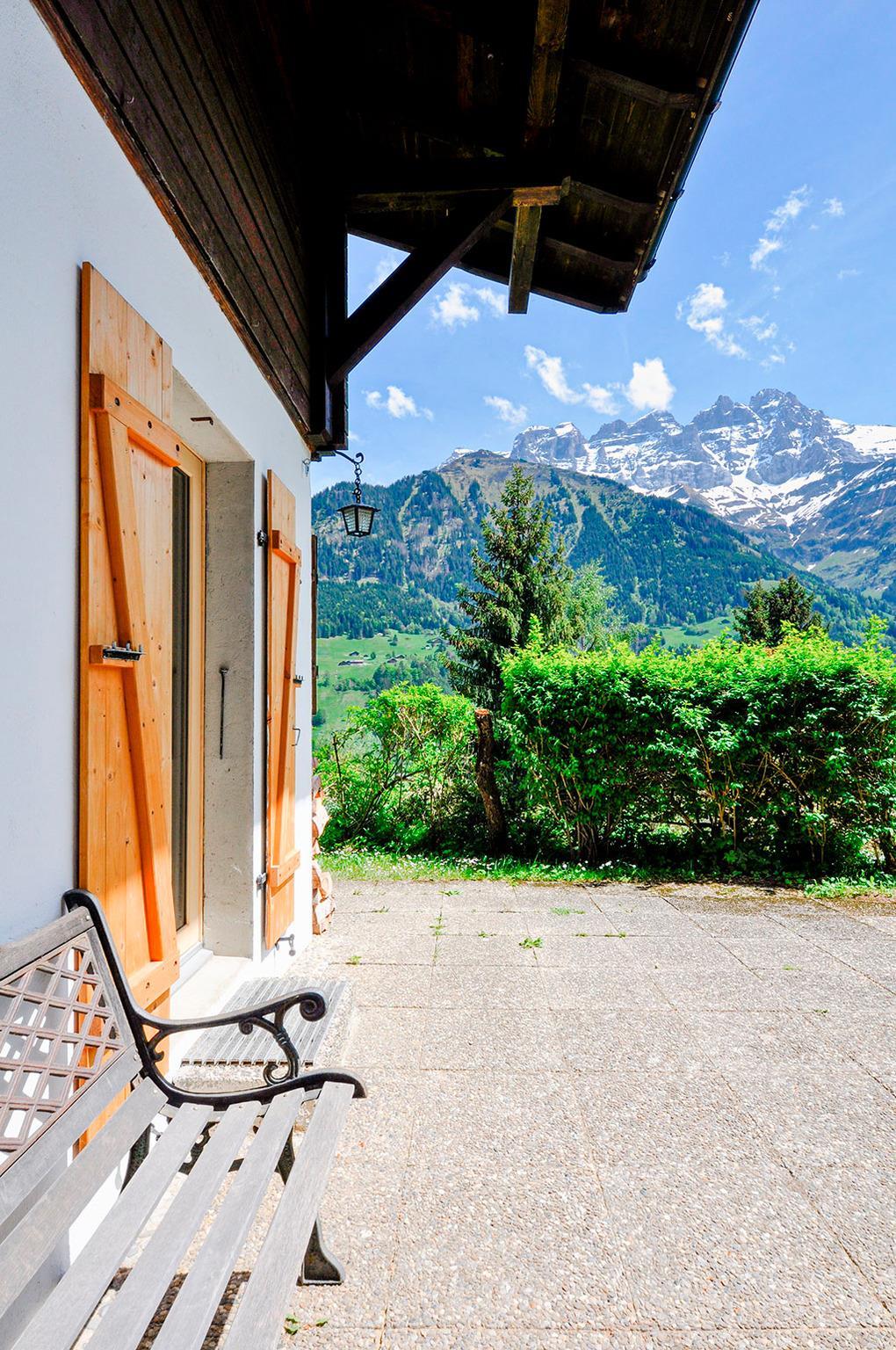 Ort: Val d'Illiez. Ruhige Lage am oberen Ortsrand mit schönem Blick über den Ort und auf die imposante Bergkette "Dents du Midi". Ortsmitte 400 m. Champéry mit Sportzentrum und Gondel (Sommerbetrieb) 3 km. Bahnhof, Kleinzug nach Champéry 500 m.