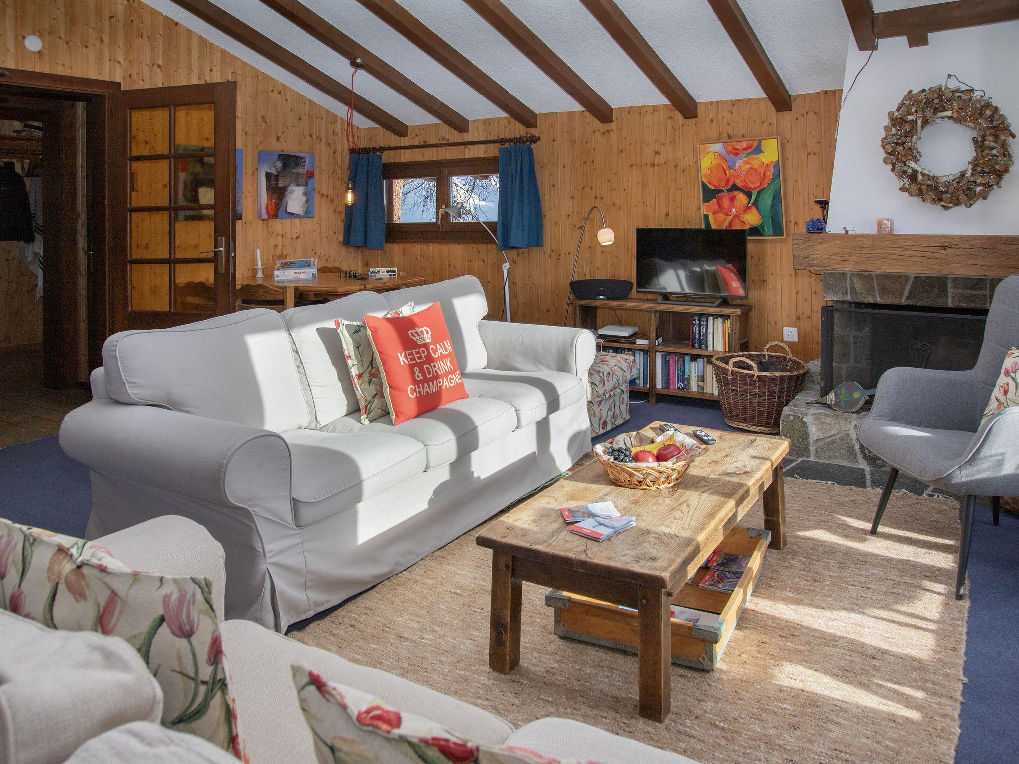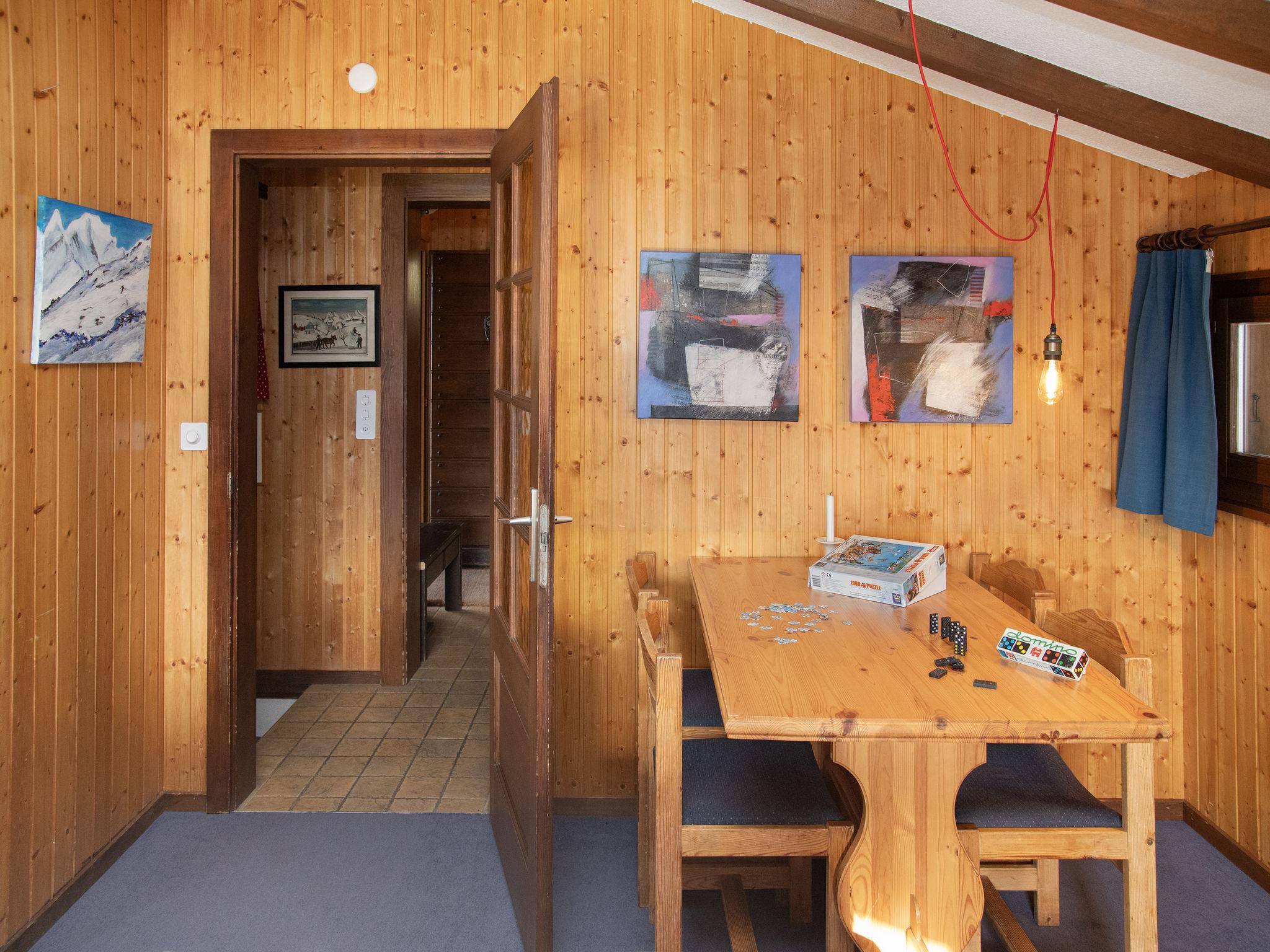 "5 Ecorces", 5-room chalet on 3 levels, south facing position. Comfortable and cosy furnishings: living/dining room with open-hearth fireplace and cable TV. Exit to the balcony. Open kitchen (4 hot plates, oven, dishwasher, kettle, electric coffee machine, Capsules for coffee machine (Nespresso) extra, fondue Set (cheese)). 2 showers/WC, sep. WC. Electric heating. On the lower ground floor: 2 rooms, each room with 2 beds (90 cm, length 200 cm), hand-basin. Exit to the terrace. 1 room with 1 bed (90 cm, length 200 cm). 1 room with 2 beds (90 cm, length 200 cm). Carpet. Balcony, south facing position, terrace. Balcony furniture. Very beautiful view of the mountains, the countryside and the resort. Facilities: washing machine. Internet (WiFi, free). Parking (1 car) at 50 m. Please note: non-smokers only.