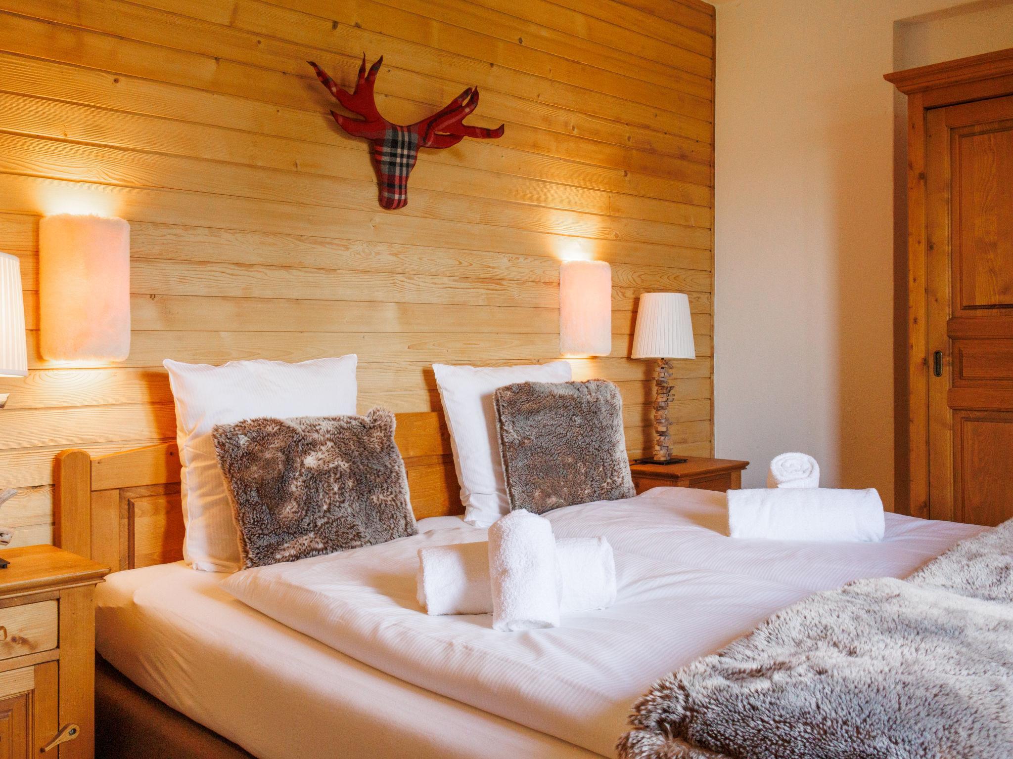 "Victoria", 9-room chalet on 3 levels. Comfortable and stylish furnishings: living/dining room with open-hearth fireplace, dining nook and bar. Exit to the terrace, to the veranda. Large kitchen (oven, dishwasher, toaster, kettle, microwave, freezer, electric coffee machine, fondue Set (chinoise, cheese)). Sep. WC. Upper floor: 5 rooms, each room with 2 beds (90 cm, length 200 cm), shower/WC. Exit to the balcony. 1 room with 2 beds (90 cm, length 200 cm), bath/WC. 1 room with 1 bed (90 cm, length 200 cm), shower/WC. Exit to the balcony. 2nd upper floor: 1 room with 2 beds (90 cm, length 200 cm), shower/WC. Exit to the balcony. Terrace 100 m2, large garden 300 m2. Terrace furniture, barbecue. Very beautiful view of the mountains and the resort. Facilities: children's high chair, baby cot for up to 3 year olds, hair dryer. Internet (WiFi, free). Please note: non-smokers only.
