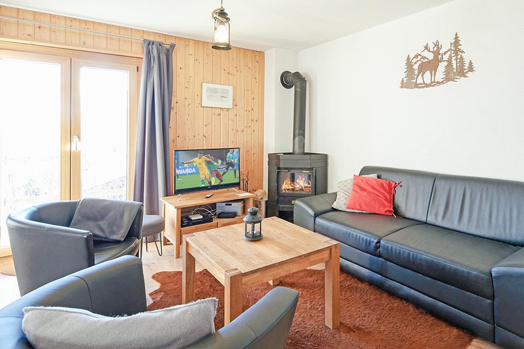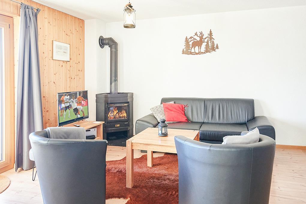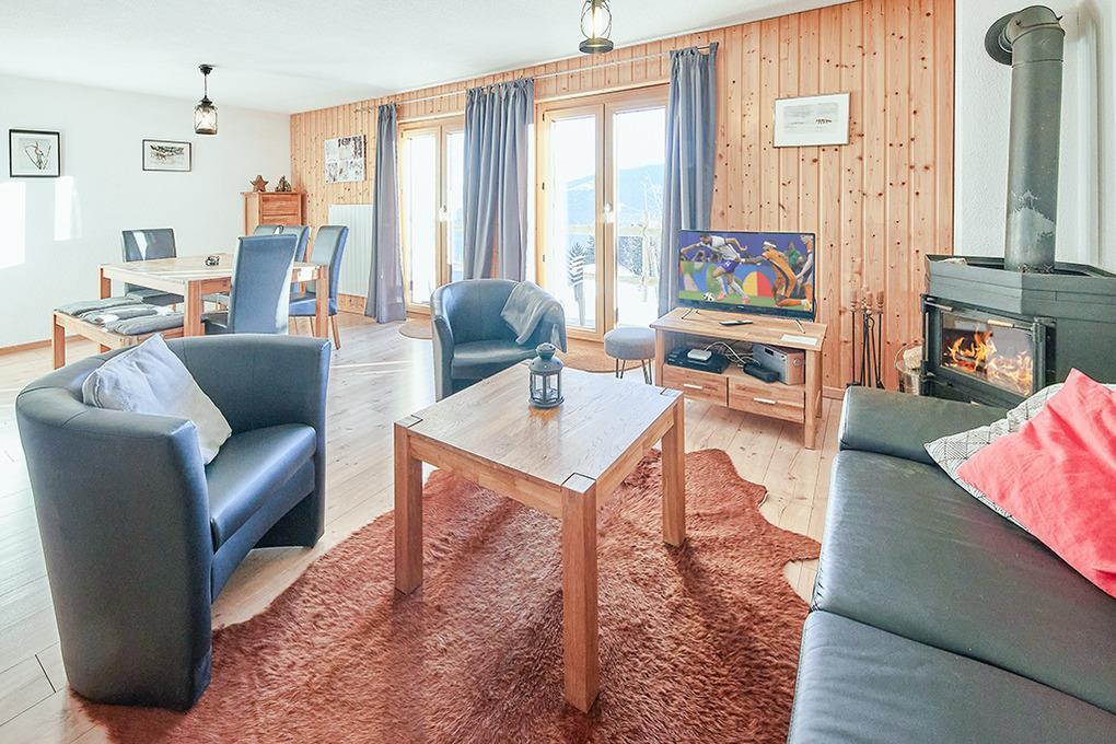 Haus: Schönes Chalet mit Kaminofen. 5-Zimmer-Reihenhaus mit 100 qm Wohnfläche über 2 Etagen. Gemütliche Einrichtung, typisches Chalet-Flair mit schöner Holzvertäfelung im ganzen Haus. Internetzugang über W-Lan. Zentralheizung. Nichtraucherhaus. Balkon, Terrasse mit Sitzmöbeln, schönem Bergblick.
