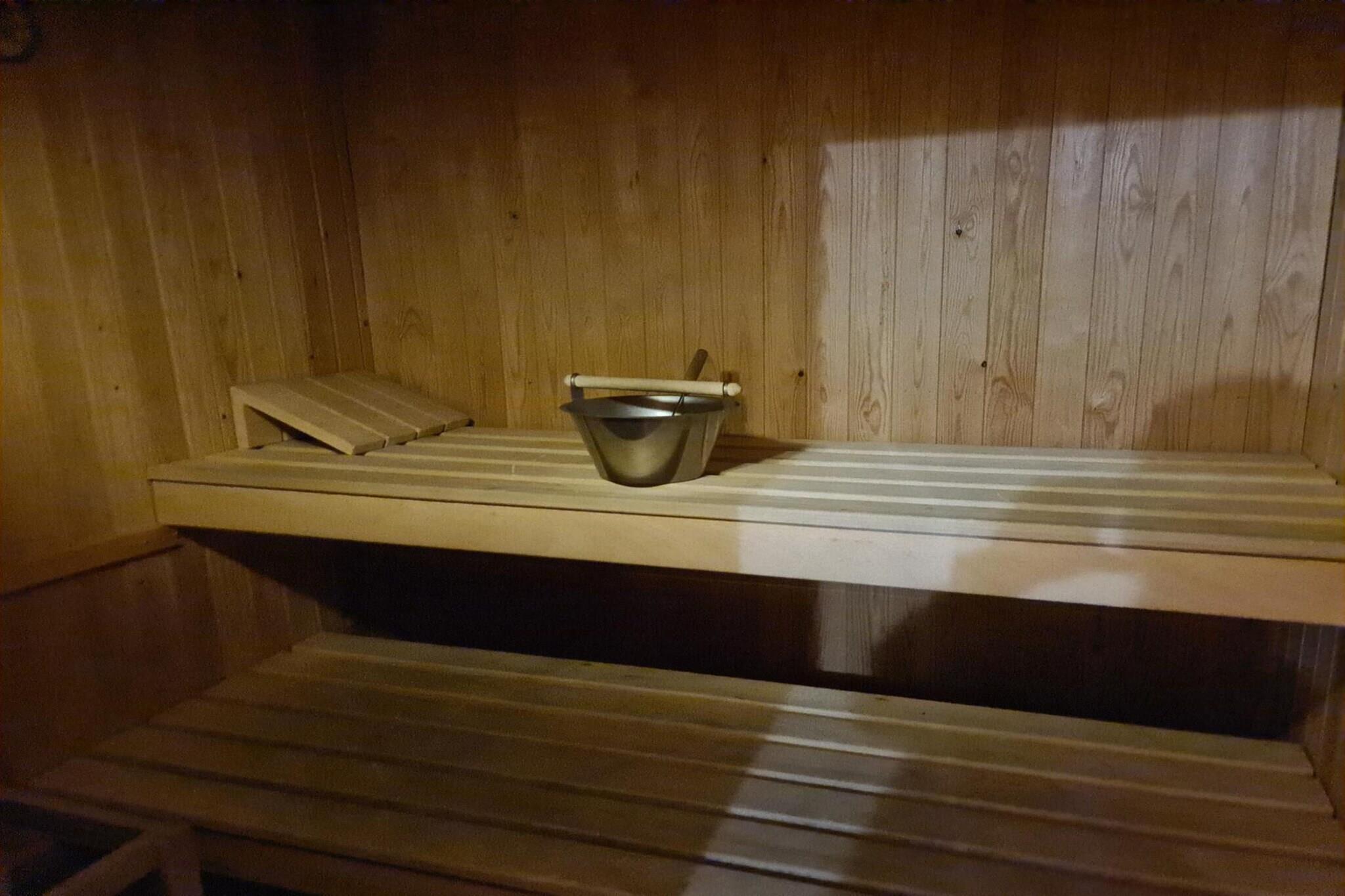 Ground floor: (Living room(TV, decorative fireplace, radio), open kitchen(electric kettle, coffee machine, oven, microwave, dishwasher, fridge, freezer, dishes and cutlery(Bowls, chopsticks, plates, cups, etc.)), bedroom(double bed(140 x 200 cm)), bedroom(single bed(90 x 200 cm), single bed(90 x 200 cm)), bedroom(single bed(90 x 200 cm)), bedroom(single bed, double sofa bed), bathroom(shower), bathroom(shower, washbasin, toilet), toilet(toilet), balcony) tumble dryer, sauna(private), washing machine, heating(central), terrace, garden, garden furniture, parking, swimming pool(shared with other guests)