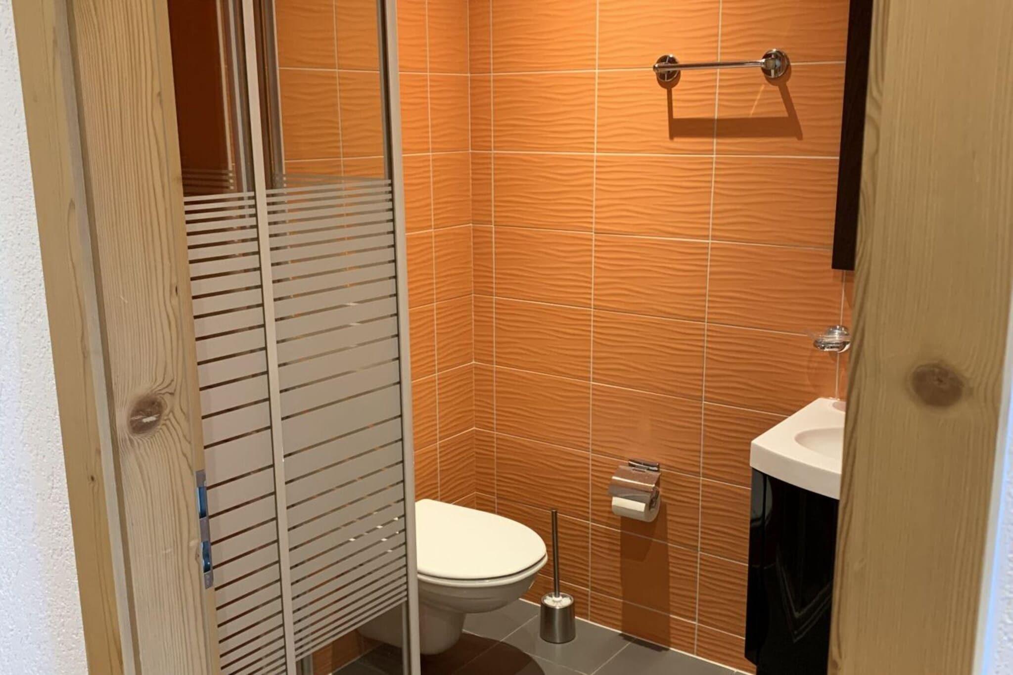 Ground floor: (open kitchen(electric kettle, toaster, coffee machine(cups, espresso, filter), oven, microwave, dishwasher, fridge, freezer, Juicer, dishes and cutlery(Bowls, chopsticks, plates, cups, etc.)), Living/bed room(double sofa bed(140 x 200 cm), bunk bed(90 x 200 cm), TV(cable, flatscreen, satellite), dining table, seating area, DVD player, wireless music system, radio), Bedroom with bathroom(single bed(90 x 200 cm), single bed(90 x 200 cm), bath tub, shower, washbasin, toilet, hairdryer), bathroom(shower, toilet), Internet access, terrace) ski storage, sauna, washing machine, heating(central), garden furniture, parking, swimming pool(shared with other guests), lift, Laundry Package incl.