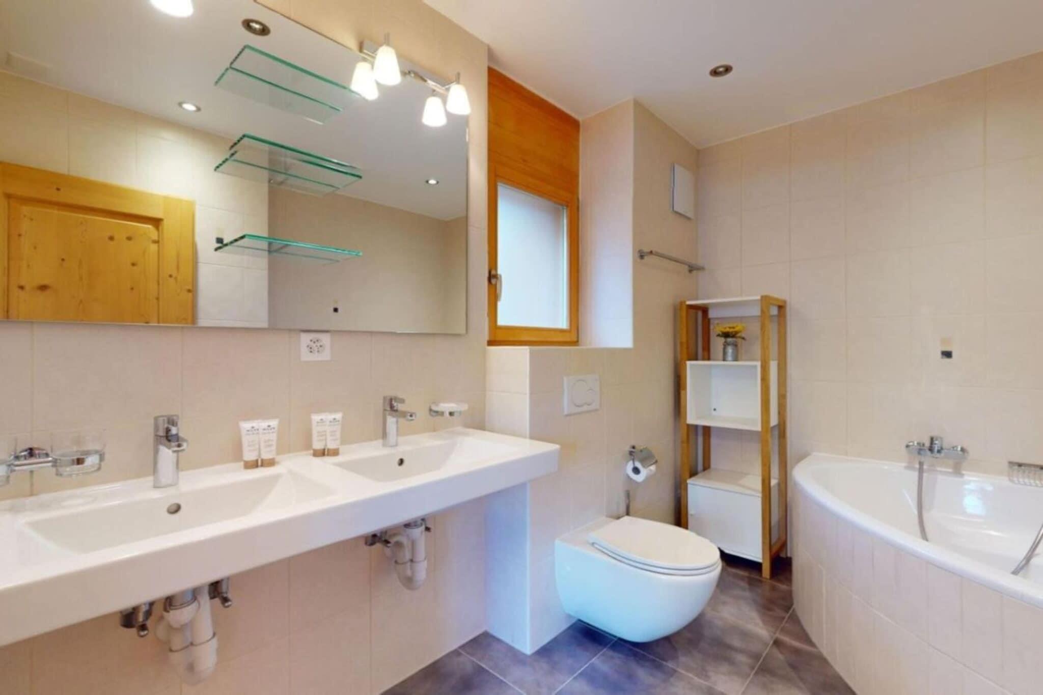 On the 1st floor: (Living room(double sofa bed(140 x 200 cm), TV(cable, flatscreen, satellite), dining table, fireplace, seating area, DVD player, radio, stereo unit), open kitchen(electric kettle, toaster, coffee machine(filter), oven, microwave, dishwasher, fridge, freezer, Juicer, dishes and cutlery(Bowls, chopsticks, plates, cups, etc.)), bedroom(single bed(90 x 200 cm), single bed(90 x 200 cm)), Bedroom with bathroom(single bed(90 x 200 cm), single bed(90 x 200 cm), bath tub, shower, washbasin, toilet, hairdryer), bathroom(shower, toilet), balcony) ski storage, sauna, washing machine, heating(central), garden furniture, parking, swimming pool(shared with other guests), lift, Laundry Package incl.