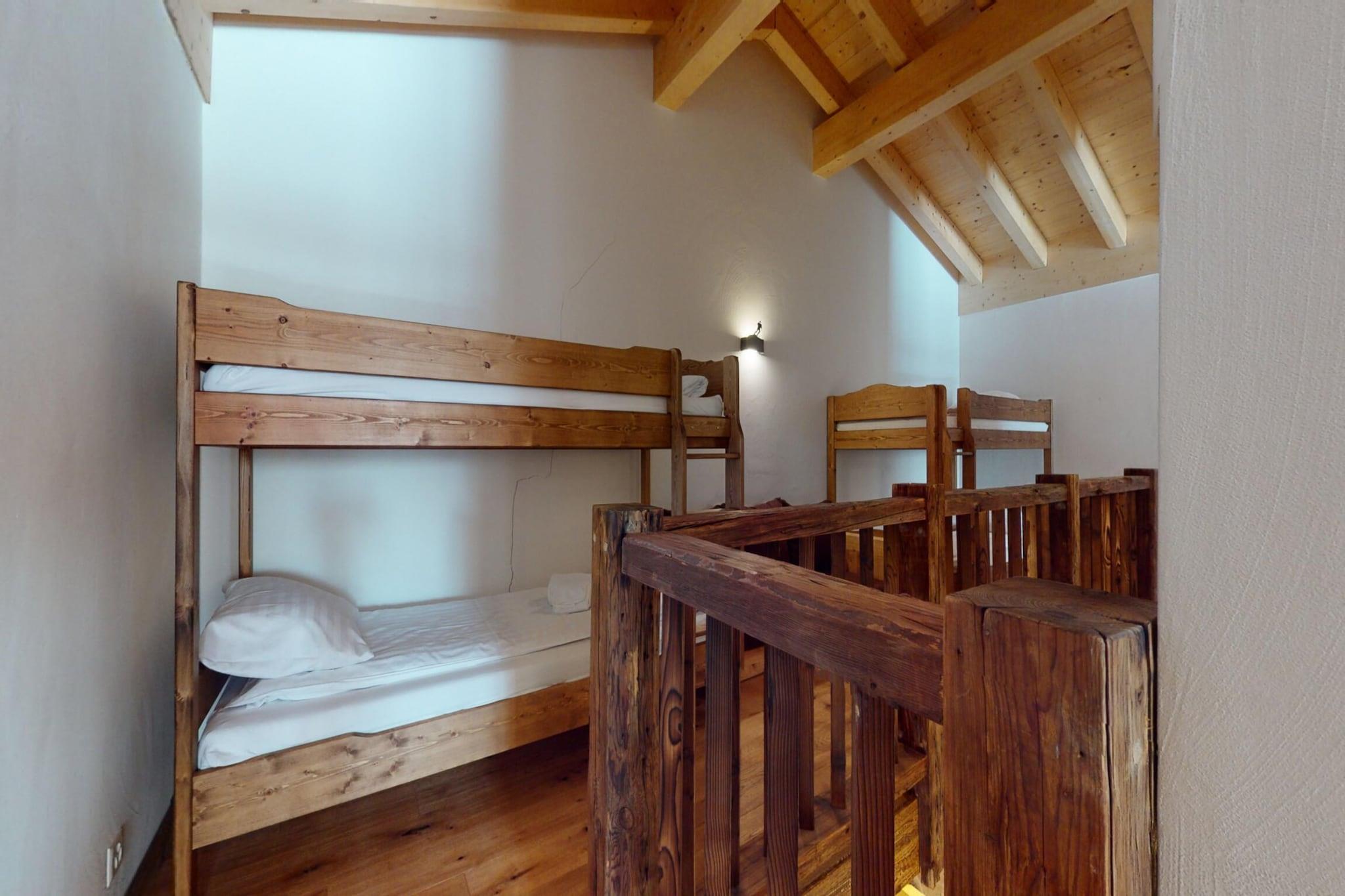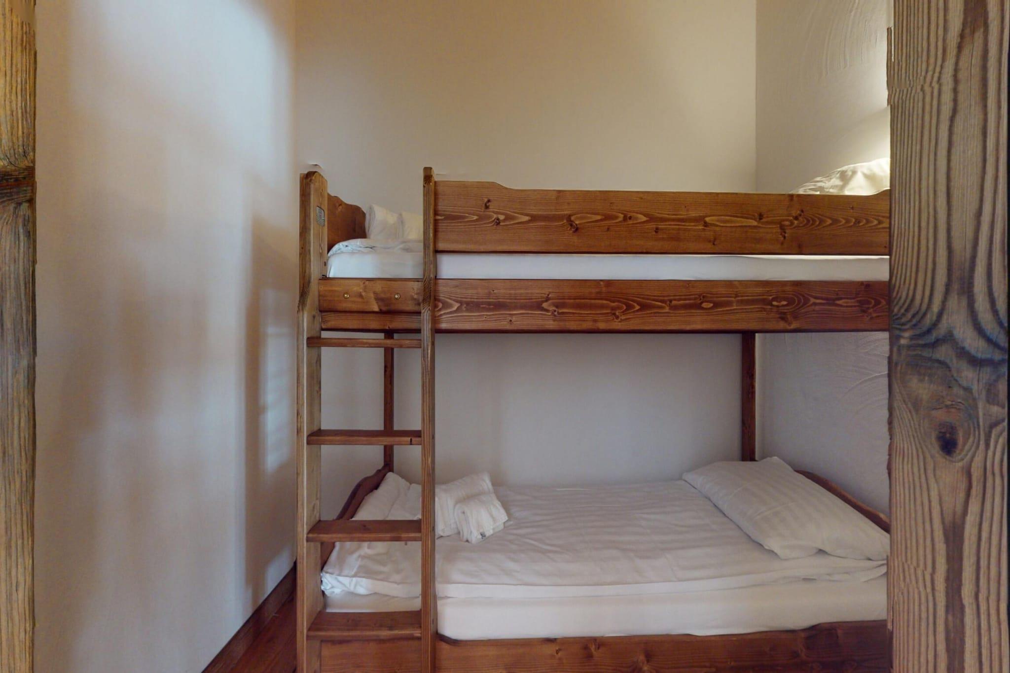 On the 3rd floor: (Living room(double sofa bed, TV(cable, flatscreen, satellite), dining table(10 persons), radio), open kitchen(electric kettle, oven, microwave, dishwasher, fridge-freezer, dishes and cutlery(Bowls, chopsticks, plates, cups, etc.), Cooking basics(Pots and pans, oil, salt and pepper)), bedroom(single bed(90 x 200 cm), single bed(90 x 200 cm)), bedroom(single bed(90 x 200 cm), single bed(90 x 200 cm)), bedroom(single bed(90 x 200 cm), single bed(90 x 200 cm)), bedroom(single bed(90 x 200 cm), single bed(90 x 200 cm)), bedroom(bunk bed), bathroom(shower, washbasin, toilet), bathroom(shower, washbasin, hairdryer), bathroom(bath tub), mezzanine(bunk bed, bunk bed, bunk bed), Internet access) ski storage, washing machine, balcony, heating(central), garden furniture, swimming pool(shared with other guests), lift