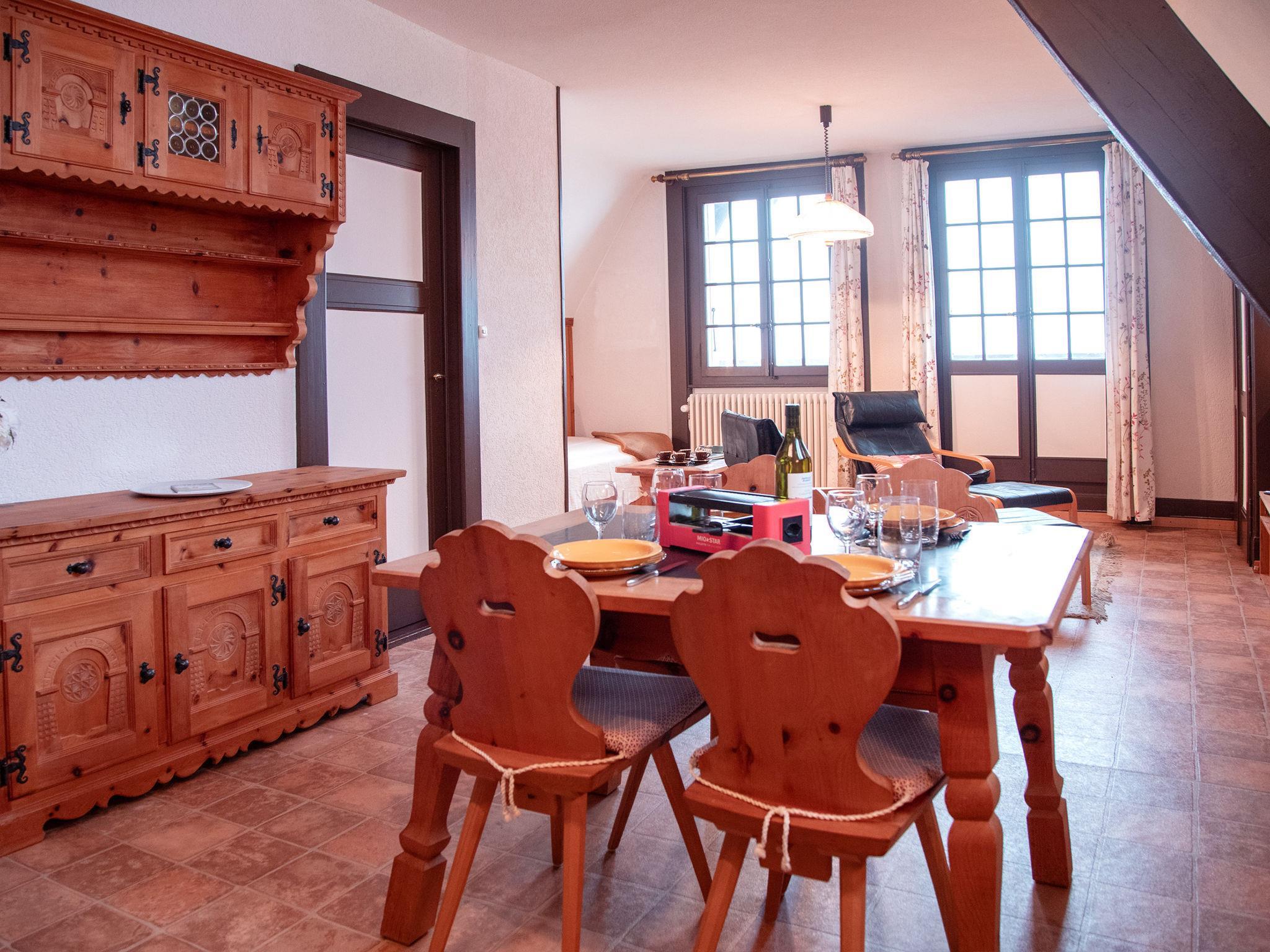 "Plan Névé 5", 2-room penthouse 58 m2 on 3rd floor, south facing position. Simple and practical furnishings: living/dining room with 2 pull-out beds (2 pers. 2 x 90 cm), dining table and TV (flat screen). Exit to the balcony, south facing position. 1 room with 2 beds (90 cm, length 200 cm). Small, open kitchen (oven, 4 ceramic glass hob hotplates, toaster, kettle, electric coffee machine, Capsules for coffee machine (Nespresso) extra, raclette grill, fondue Set (cheese)). Shower, sep. WC. Balcony, south facing position. Balcony furniture. Very beautiful panoramic view of the mountains. Facilities: hair dryer. Parking (1 car). Please note: no lift.