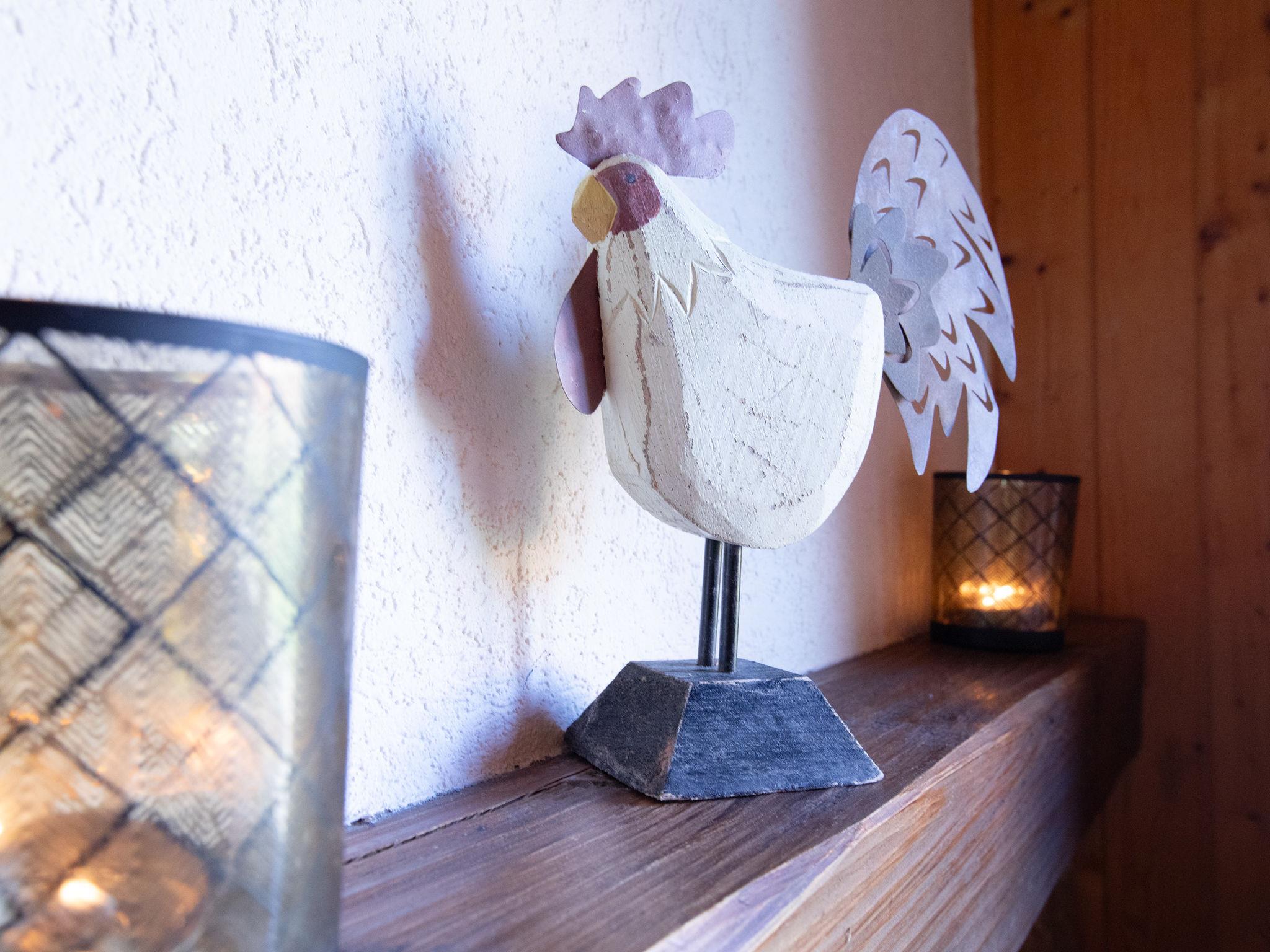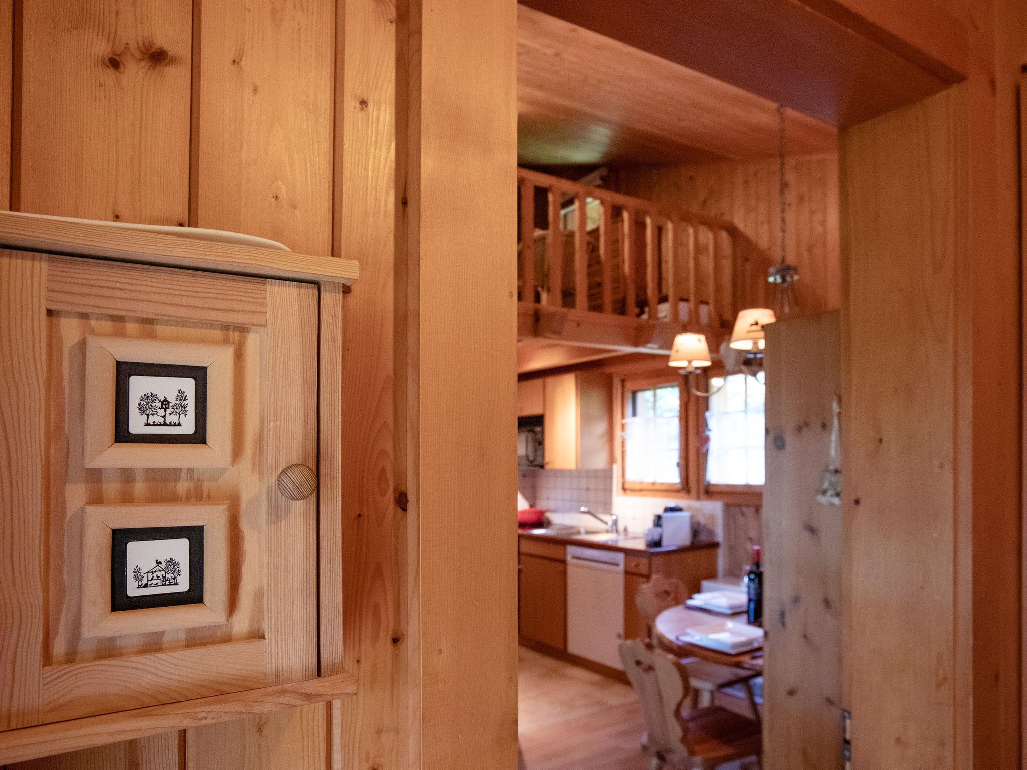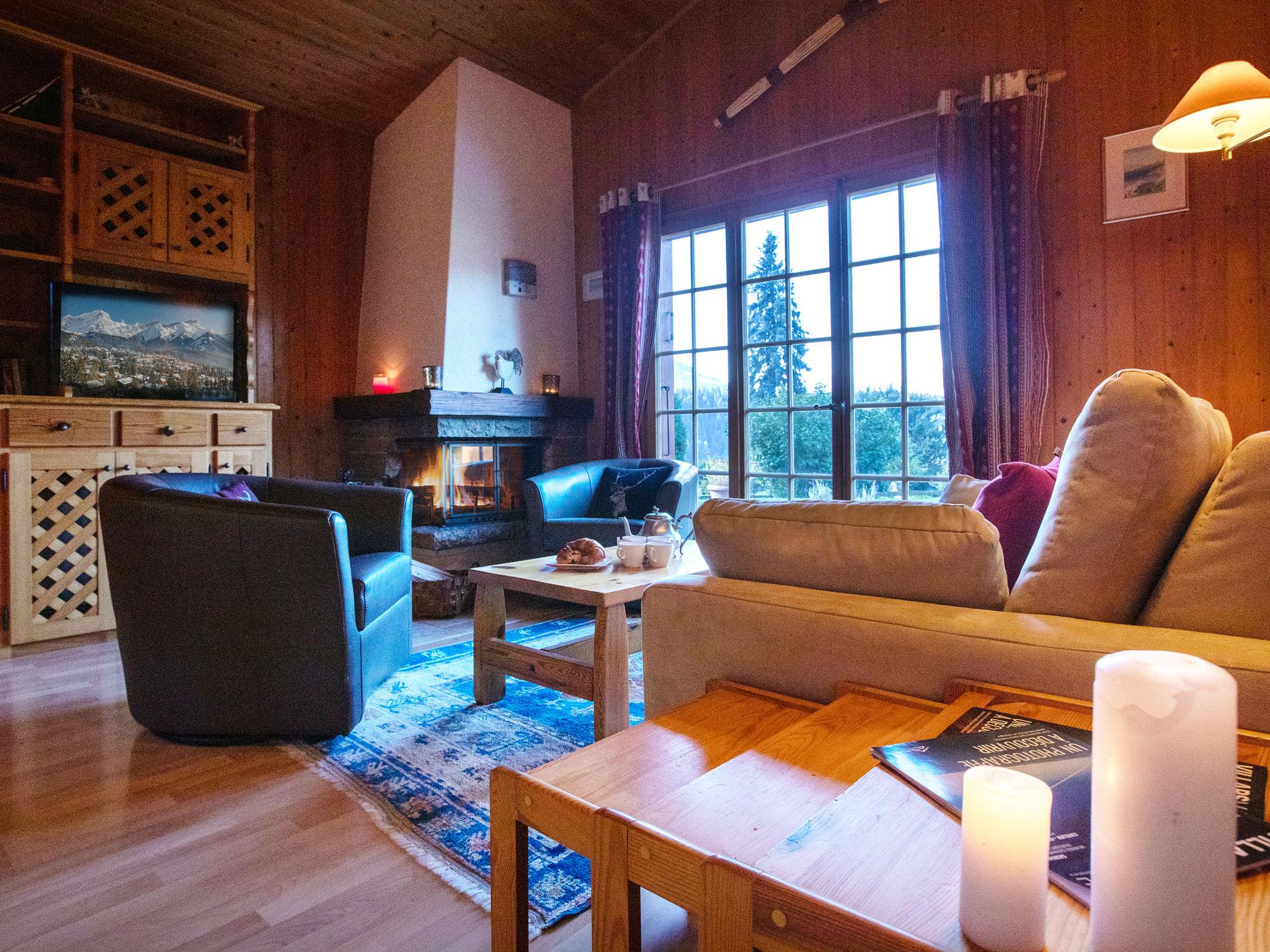 "Chalet Lorila", 3-room chalet 60 m2, south facing position. Simple and practical furnishings: living/dining room with open-hearth fireplace, dining table and TV (flat screen). Exit to the terrace. 1 room with 1 x 2 bunk beds. 1 double bedroom with 1 french bed (140 cm, length 180 cm). Open kitchen (oven, dishwasher, 4 ceramic glass hob hotplates, toaster, kettle, microwave, electric coffee machine, Capsules for coffee machine (Nespresso) extra, raclette grill, fondue Set (chinoise, cheese)). Bath/WC. Electric heating. Upper floor: (steep stair) open gallery, ceiling height 40 - 150 cm with 1 sleeping facility (140 cm, length 200 cm). Terrace 15 m2, large garden 800 m2, lawn. Terrace furniture, barbecue. Beautiful view of the mountains. Facilities: washing machine. Parking (2 cars) at 15 m. Please note: TV only FR. Instead of an enclosed bedroom, some sleeping areas are located in an open-plan area (gallery, alcove, etc.).