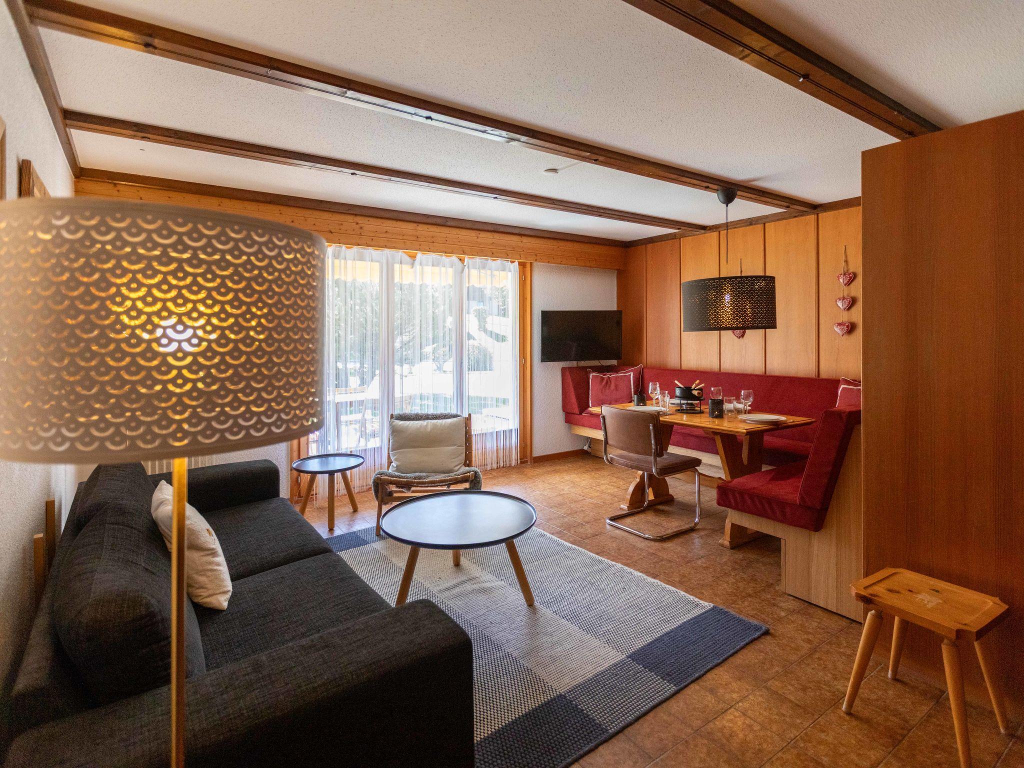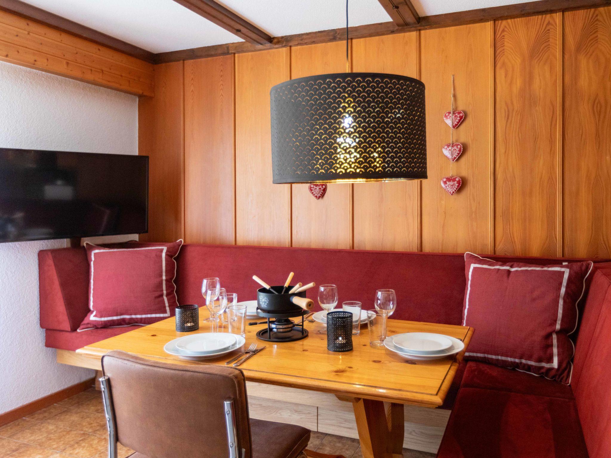 "Opale 4", 2-room apartment 55 m2, on the ground floor, south facing position. Partly renovated in 2022, practical furnishings: living/dining room 25 m2 with panoramic window with dining nook and cable TV (flat screen). Exit to the terrace. 1 room with 1 x 2 bunk beds (80 cm), 1 french bed (160 cm, length 200 cm). Exit to the terrace. Open kitchen (3 hot plates, oven, dishwasher, toaster, kettle, freezer, electric coffee machine, raclette grill, fondue Set (cheese)). Shower/WC. Terrace. Terrace furniture. Partial view of the mountains. Facilities: hair dryer. Internet (WiFi, free). Garage space n 21.