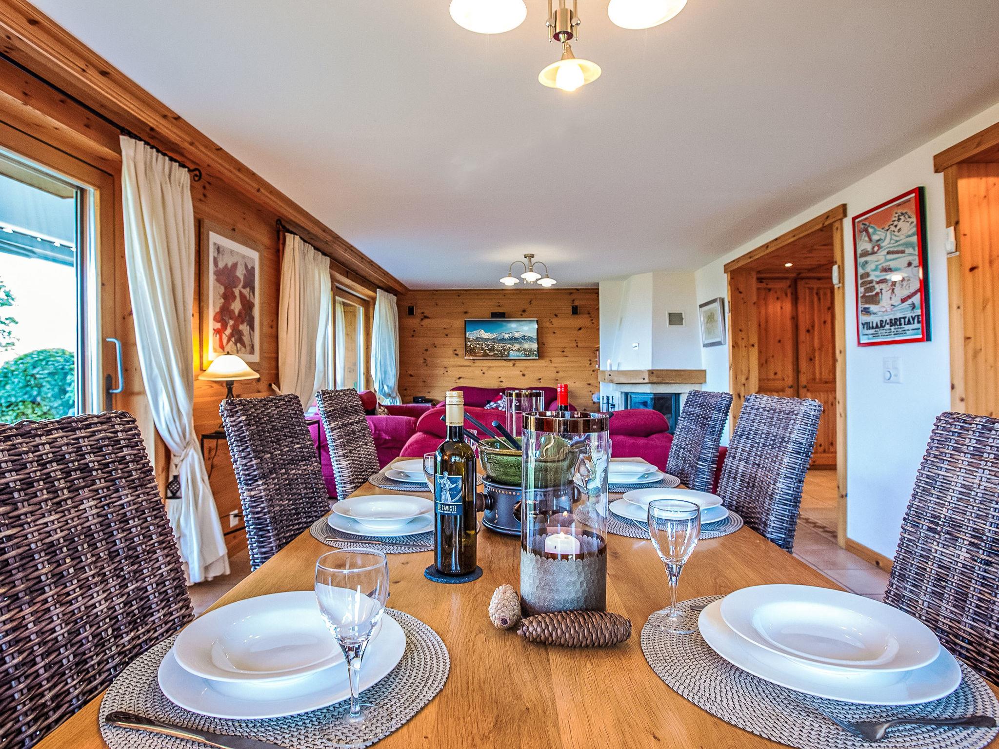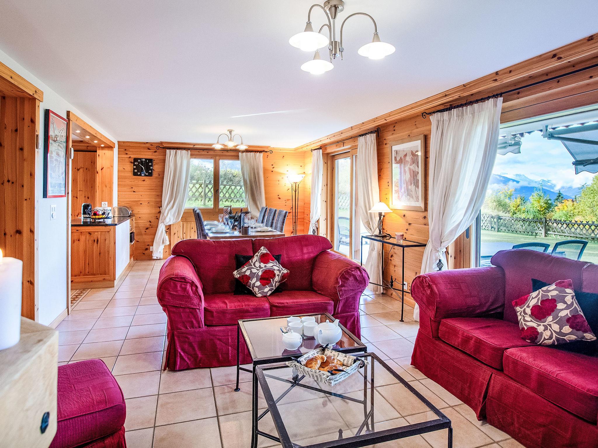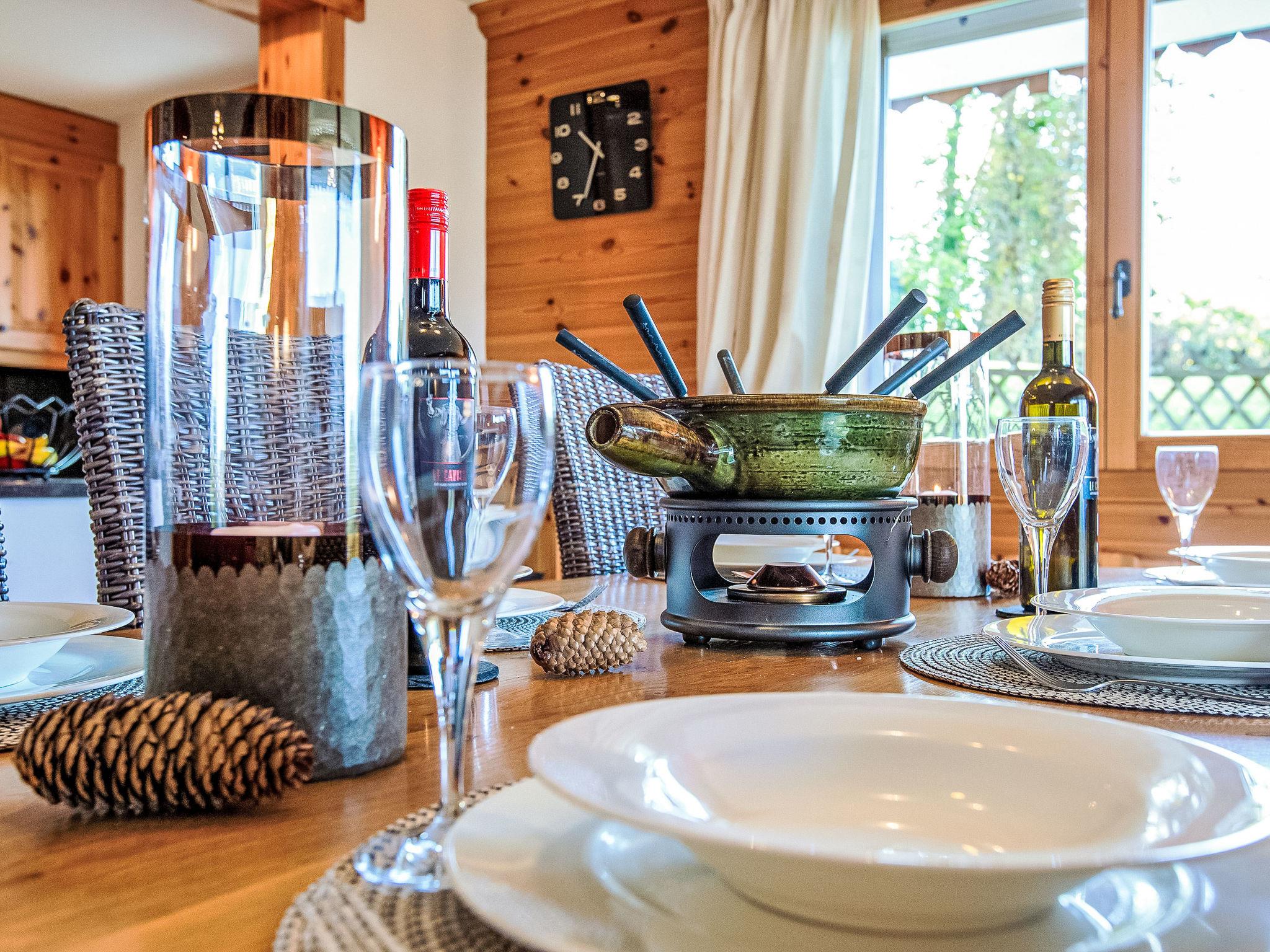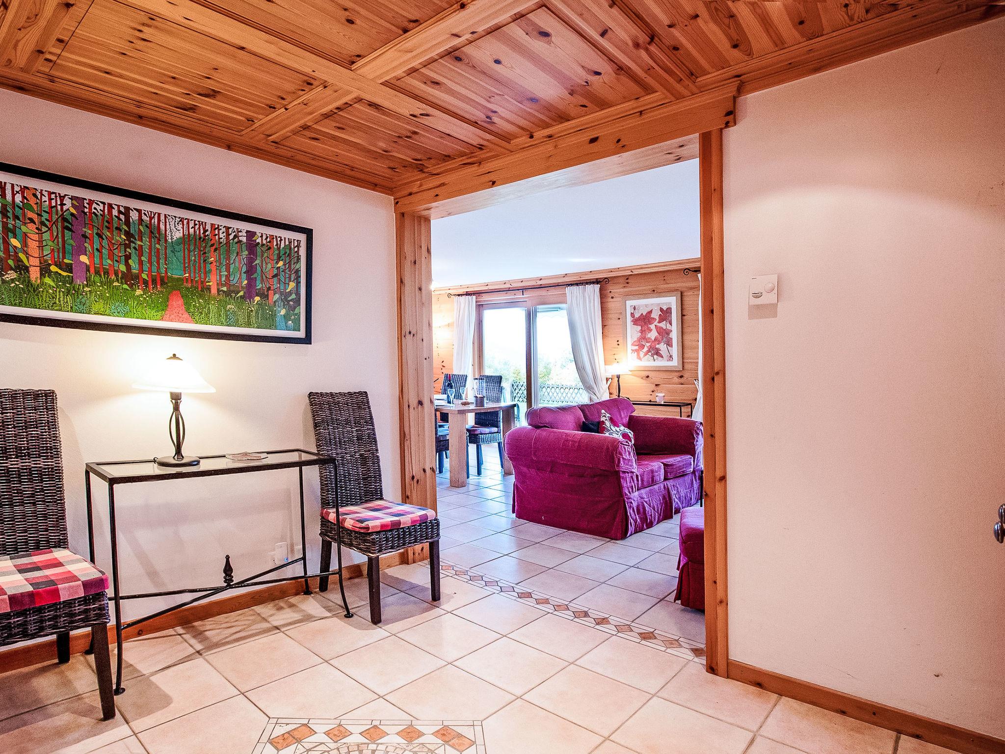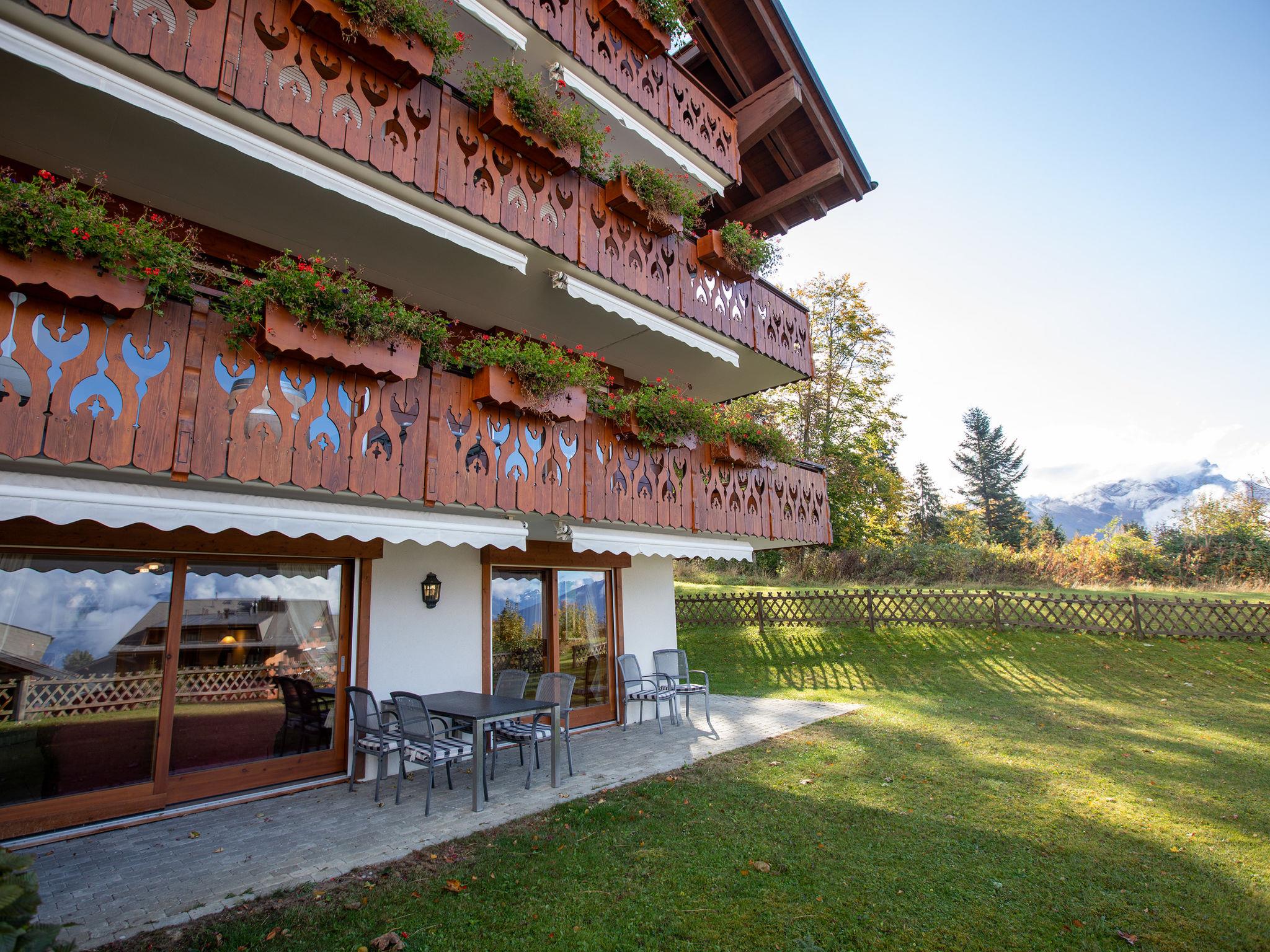 "Ambre 4", 4-room apartment 98 m2 on 1st floor, south facing position. Comfortable and tasteful furnishings: living/dining room with open-hearth fireplace, dining table and TV (flat screen). Exit to the garden, south facing position. 1 room with 2 beds (90 cm, length 200 cm). Exit to the garden, east facing position. 1 room with 2 beds (90 cm, length 200 cm). Exit to the patio, north facing position. 1 room with 2 x 1 bunk beds (90 cm, length 200 cm). Open kitchen (oven, dishwasher, 4 ceramic glass hob hotplates, toaster, kettle, microwave, electric coffee machine, raclette grill, fondue Set (cheese)). Exit to the garden, east facing position. Bath/WC, shower/WC, double hand-basin. Small patio, north facing position, large garden, south facing position and, east facing position. Terrace furniture, barbecue. Very beautiful view of the mountains. Facilities: children's high chair, hair dryer. Internet (WiFi, free). Garage space n 22 (1 car). Please note: non-smokers only.