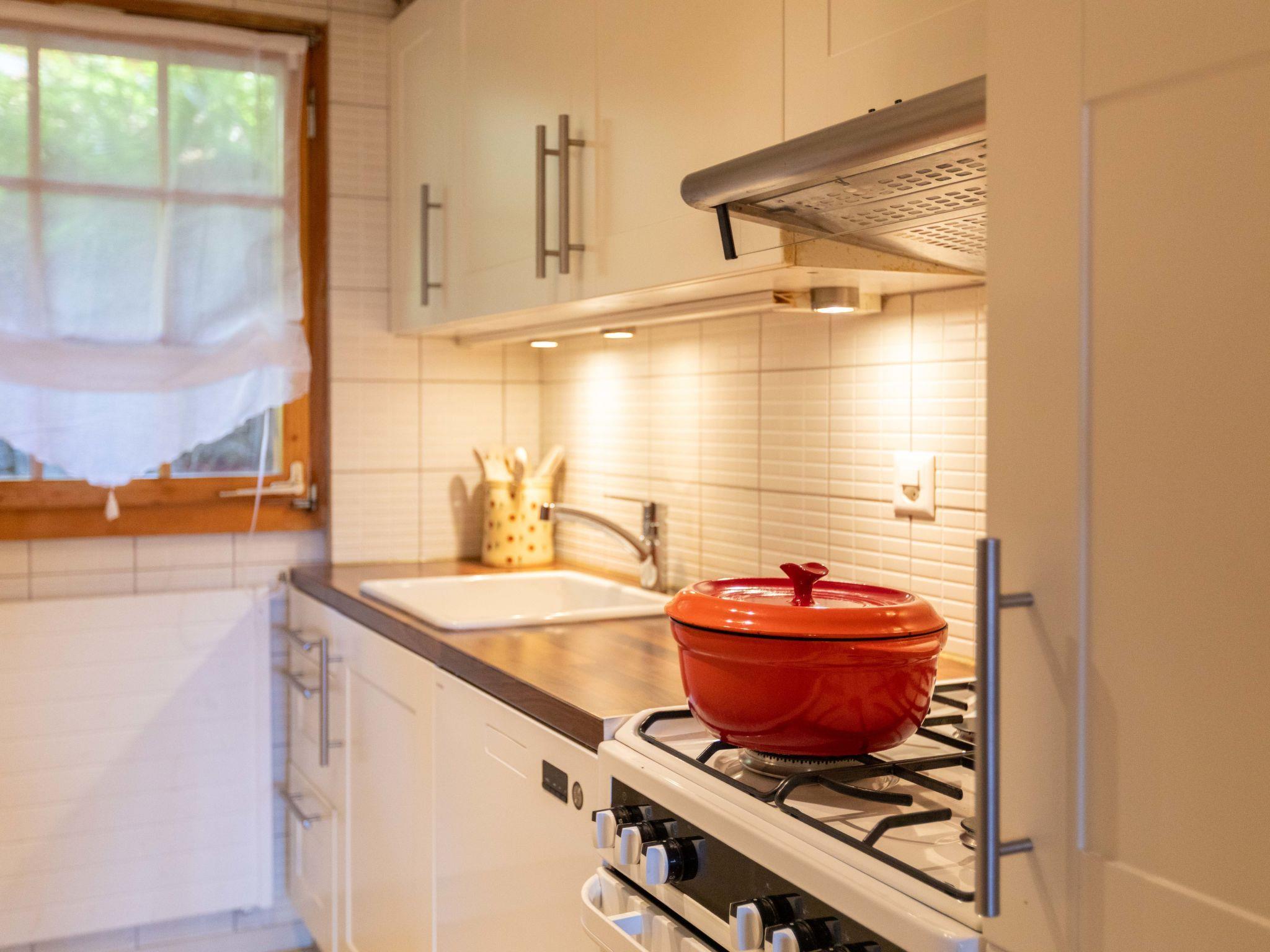 "Les Hespérides 2", 3-room apartment 85 m2 on 2 levels, on the ground floor, south-west facing position. Comfortable and tasteful furnishings: living/dining room with open-hearth fireplace, dining table and TV (flat screen), DVD. Exit to the balcony, south facing position and west facing position. 1 room with 1 double bed (180 cm, length 200 cm), TV (flat screen). Kitchen (4 hot plates, oven, dishwasher, Gas stove, toaster, microwave, freezer, electric coffee machine, Capsules for coffee machine (Nespresso) extra, raclette grill, fondue Set (cheese)). Shower/WC, hydro massage bath. On the lower ground floor: living/sleeping room with 1 x 1 bunk beds (90 cm, length 200 cm), 1 french bed (1 x 140 cm, length 200 cm), TV (flat screen). Exit to the terrace, to the patio, south facing position and west facing position. Bath/WC. Balcony 20 m2, terrace. Balcony furniture, barbecue (portable). Beautiful view of the mountains and the countryside. Facilities: hair dryer. Internet (WiFi, free). Garage. Please note: non-smokers only.