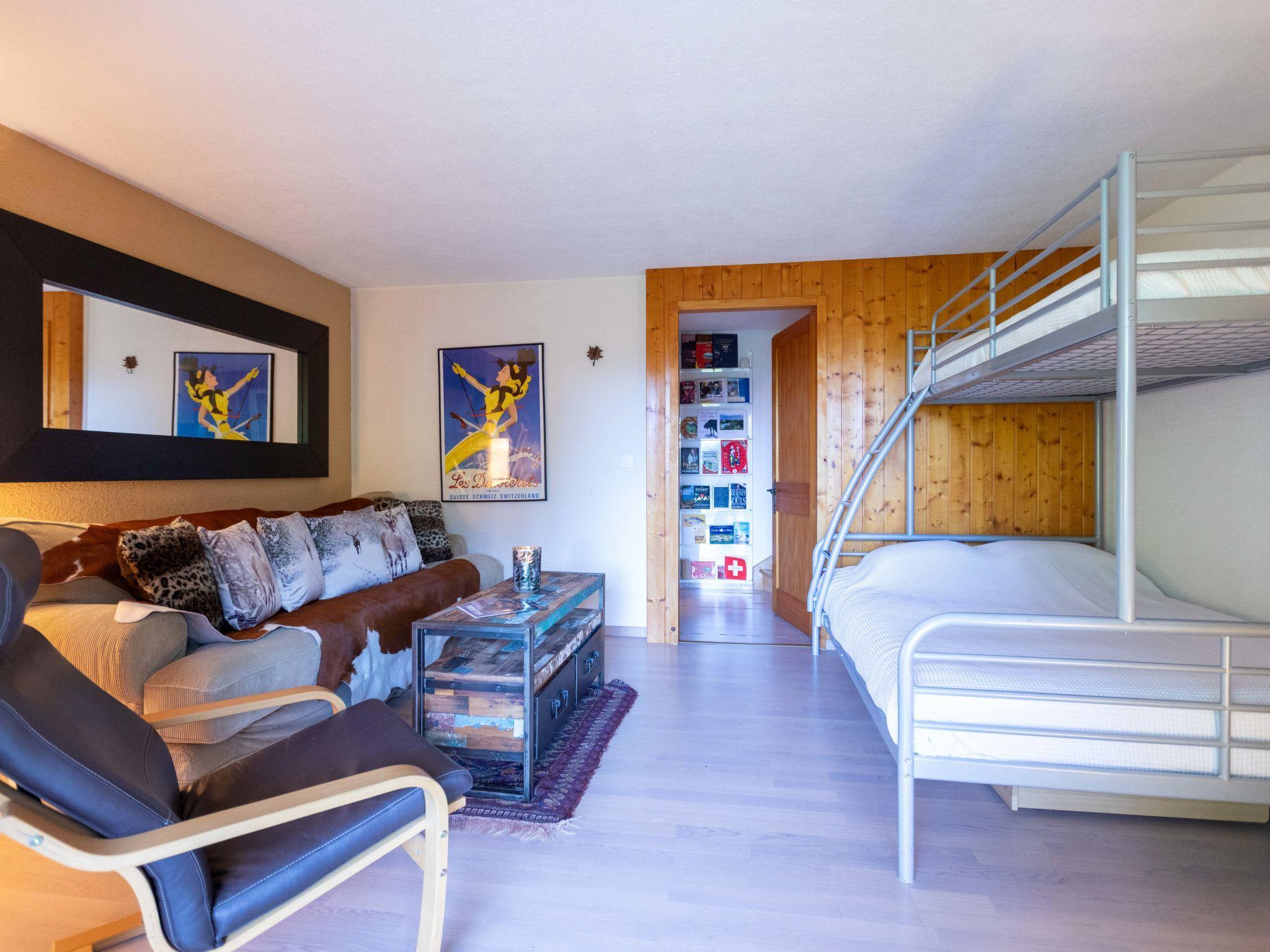 Villars-sur-Ollon: Chalet "Les Hespérides", 3 storeys, surrounded by trees and meadows. In the district of La Résidence 2 km from the centre of Villars, 200 m from the skiing area, in a cul-de-sac. For shared use: garden with lawn. In the house: storage room for skis, washing machine, tumble dryer (for shared use), drying room. In Winter: please take snow chains, 4x4 car recommended in winter. Stepped path (15 steps) to the house. Parking (limited number of spaces) at the house at 50 m. Shop 2.1 km, grocery 800 m, restaurant 2 km, bar 900 m, 17 minute walk to the centre, bus stop 1.5 km, railway station "Villars-s-Ollon" 2.5 km, indoor swimming pool 1.4 km, thermal baths "Lavey-les-Bains" 19 km. Sports harbour 25 km, golf course (18 hole) 8 km, indoor tennis centre 2.5 km, sports centre 2.5 km, mountain railway 2.5 km, ski lift 2 km, gondola lift, ski bus stop 800 m, ski school 2.4 km, children's ski school 2.5 km, ice rink 1.4 km, children's playground 2.6 km. Please note: not suitable for small children. Free ski bus service to the ski region Villars.