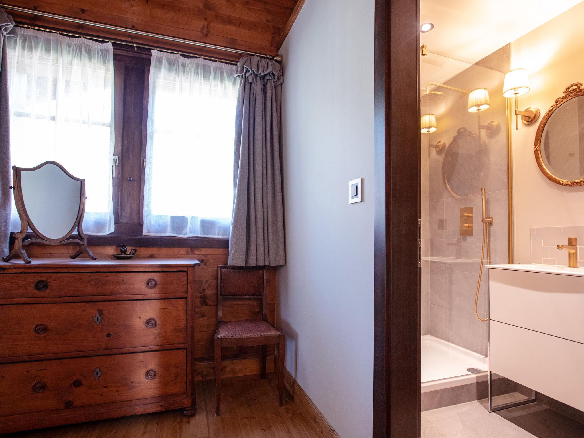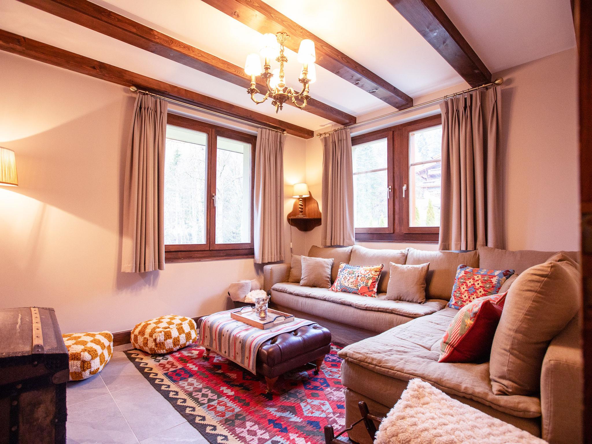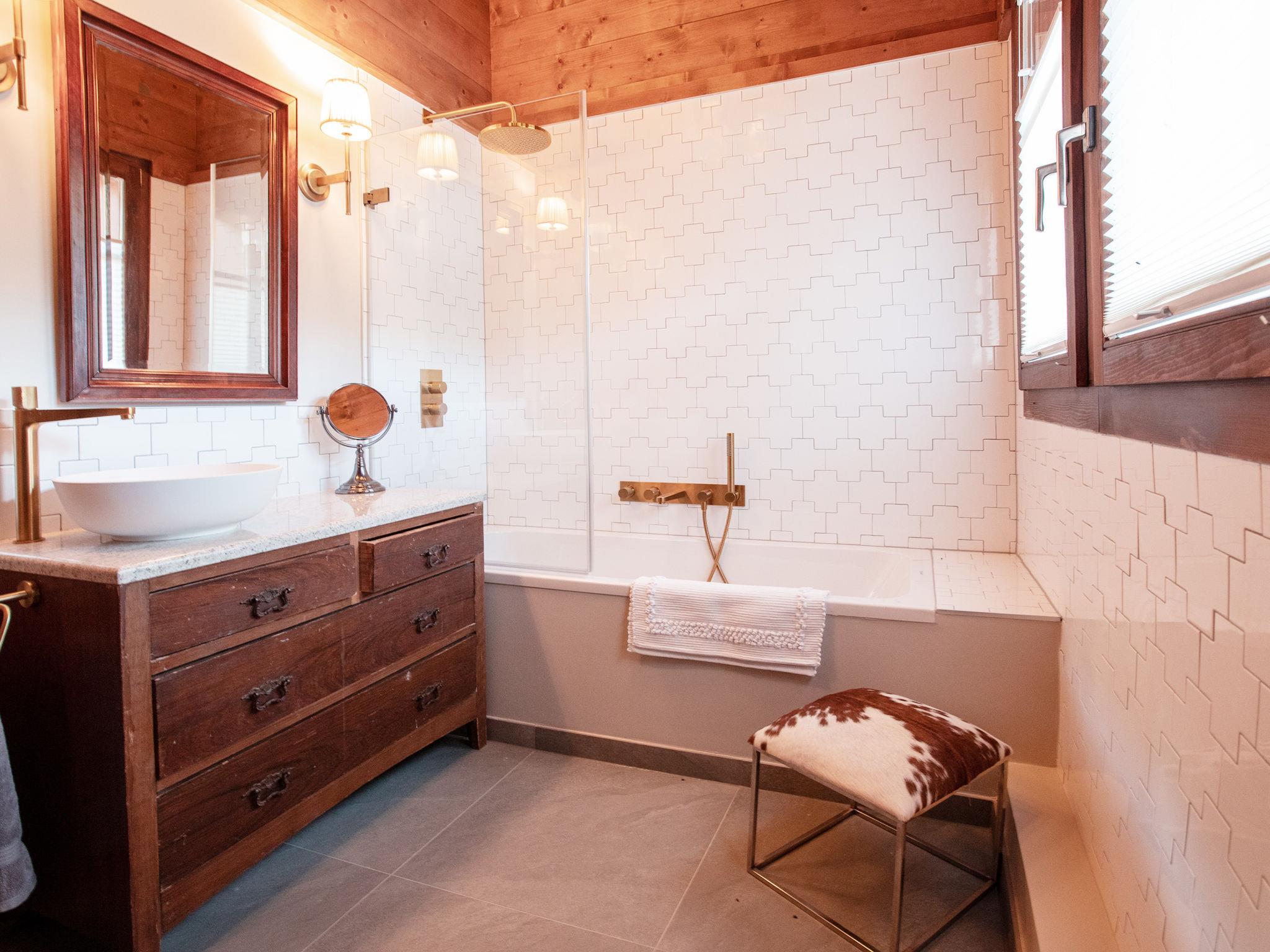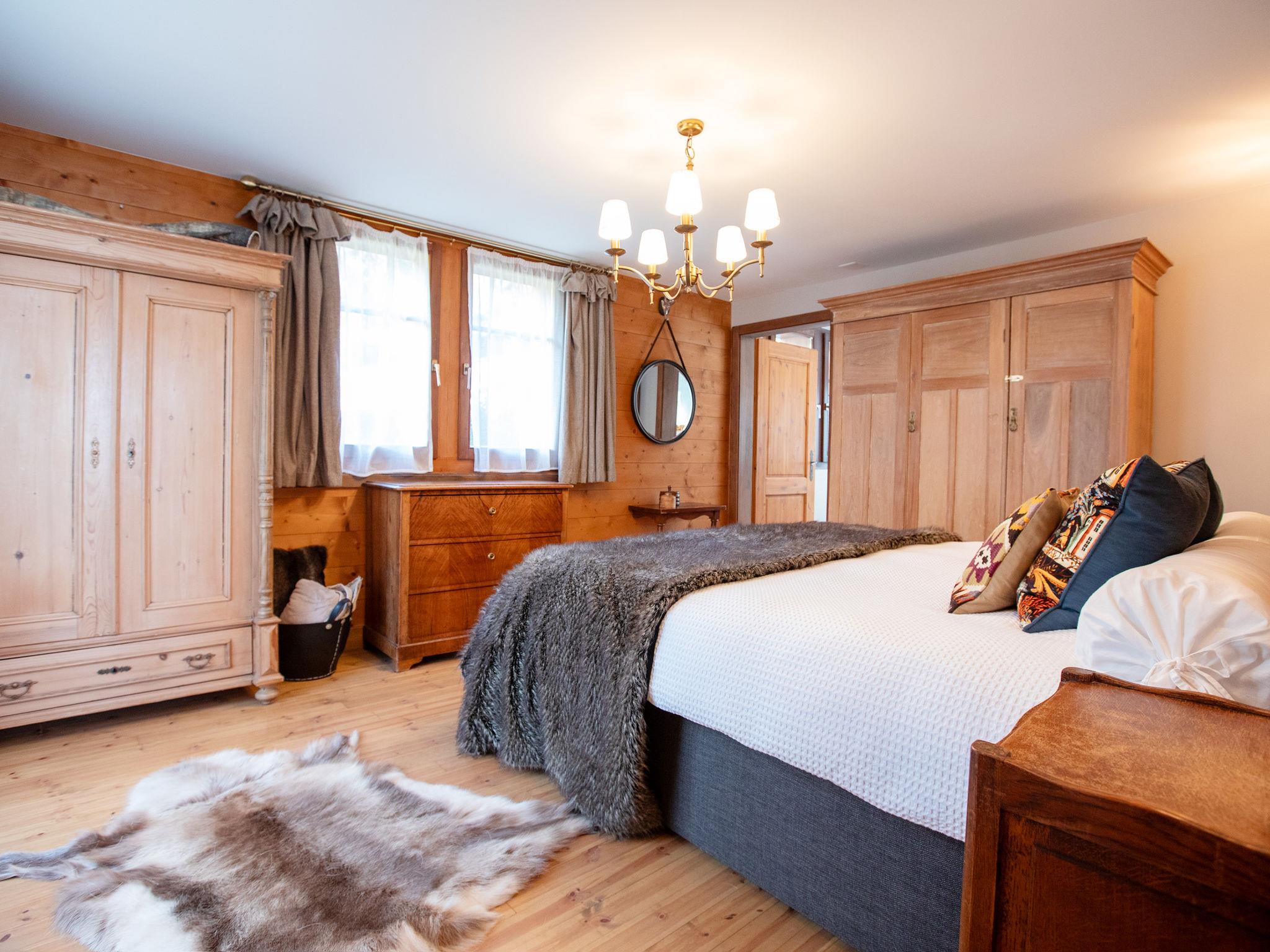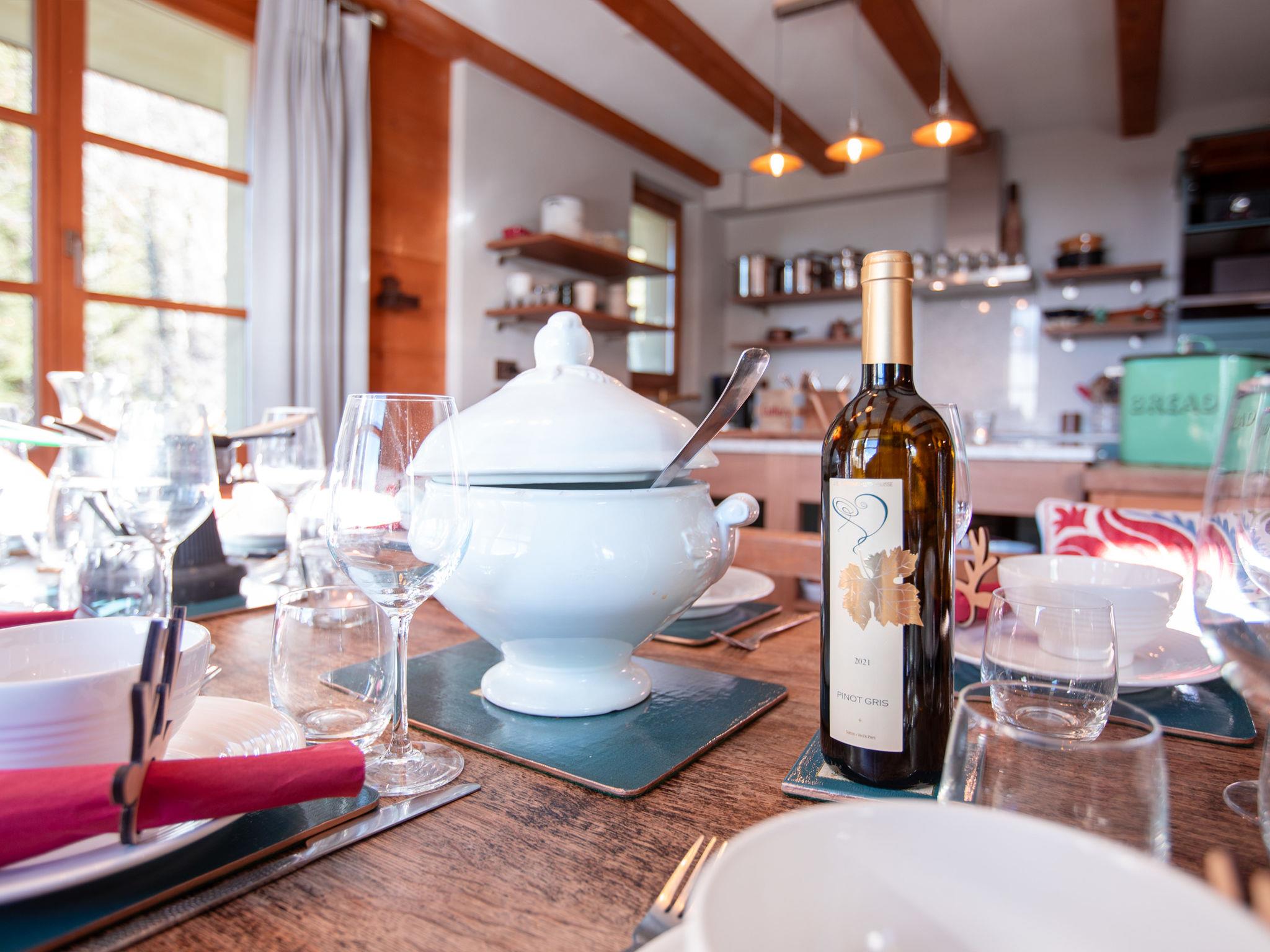 "Chalet Tetras", 8-room chalet 220 m2 on 3 levels, south facing position. Very comfortable and tasteful furnishings: small living room with TV (flat screen). 1 room with 1 french bed (160 cm, length 200 cm), bathroom. Exit to the garden, south facing position. Large kitchen (oven, dishwasher, 4 induction hot plates, toaster, kettle, microwave, electric coffee machine, Capsules for coffee machine (Dolce Gusto) extra, raclette grill, fondue Set (cheese)) with dining table. Exit to the garden, south facing position. Sep. WC. Upper floor: large living room with open-hearth fireplace. Exit to the terrace, south facing position and west facing position. 1 double bedroom with 1 french bed (180 cm, length 200 cm), bath/WC and double hand-basin. Exit to the terrace, west facing position. 2nd upper floor: 1 double bedroom with 2 beds (90 cm, length 200 cm). Exit to the balcony, south facing position. 1 double bedroom with 2 beds (90 cm, length 200 cm). Exit to the balcony, south facing position. 1 double bedroom with 2 beds (90 cm, length 200 cm), hand-basin and shower/WC. Bath/shower/WC. Small balcony, south facing position, terrace, south facing position and west facing position, small garden, south facing position. Terrace furniture. Partial view of the mountains. Facilities: washing machine, dryer. Internet (WiFi, free). Parking (2 cars).
