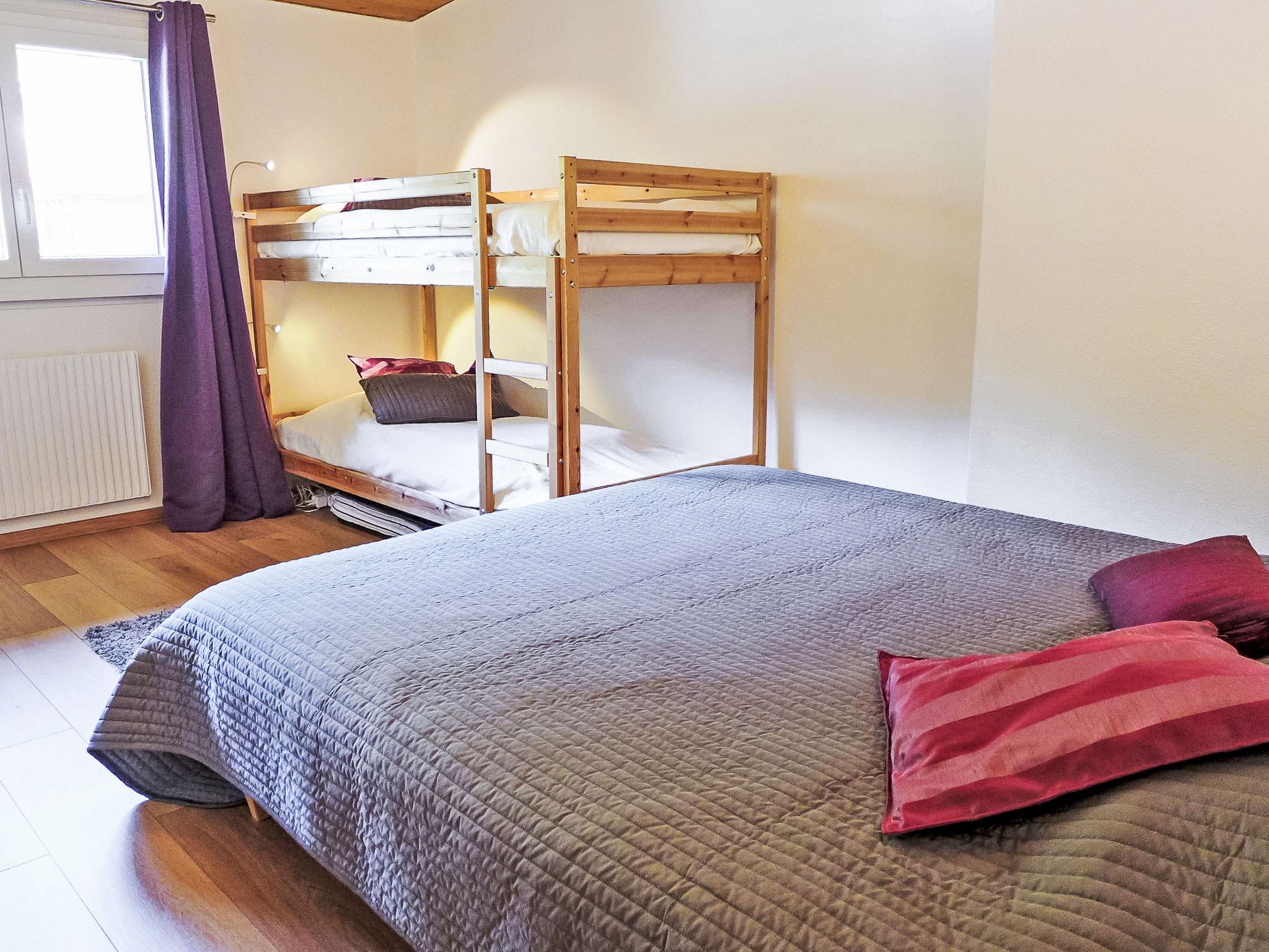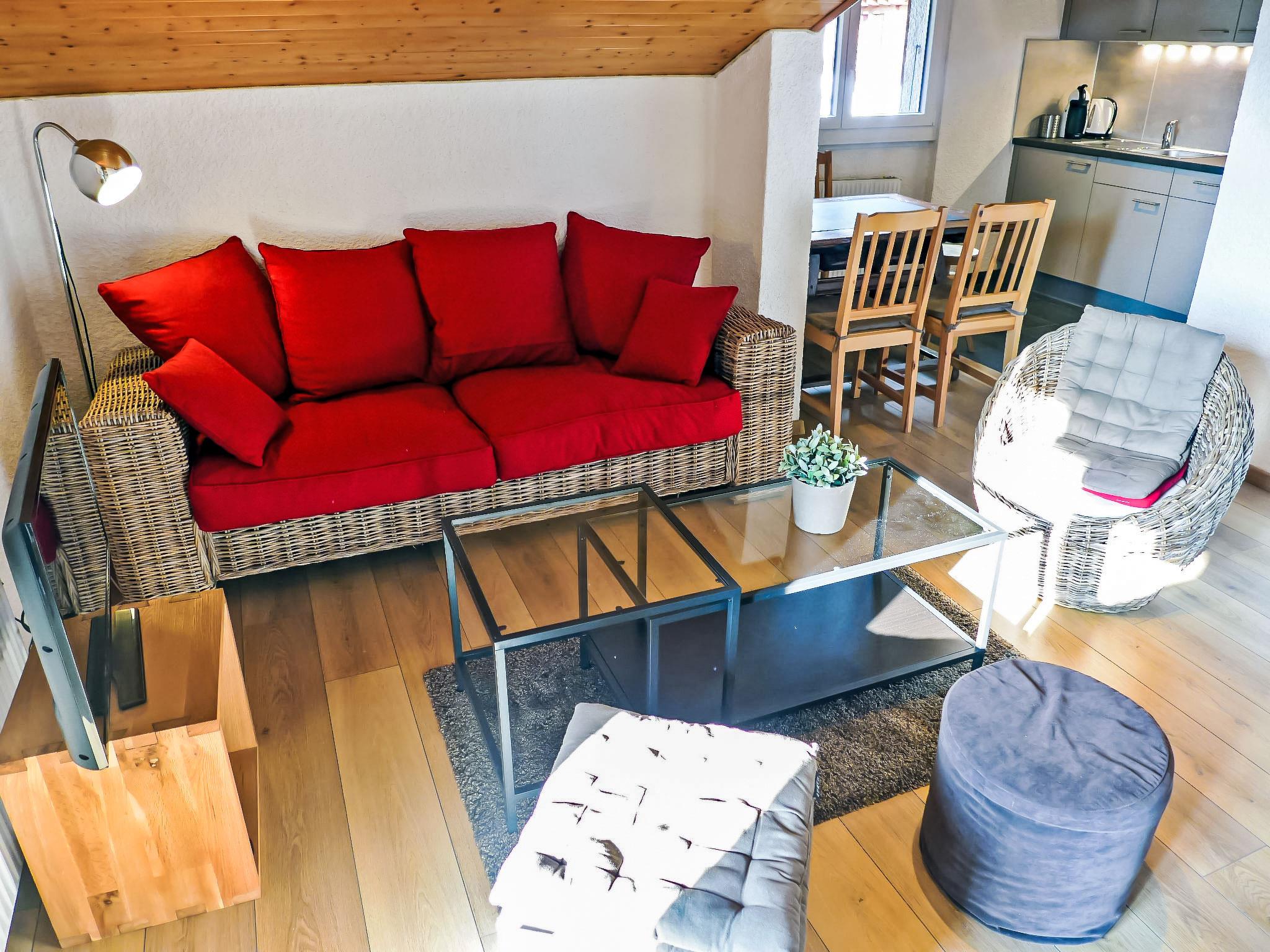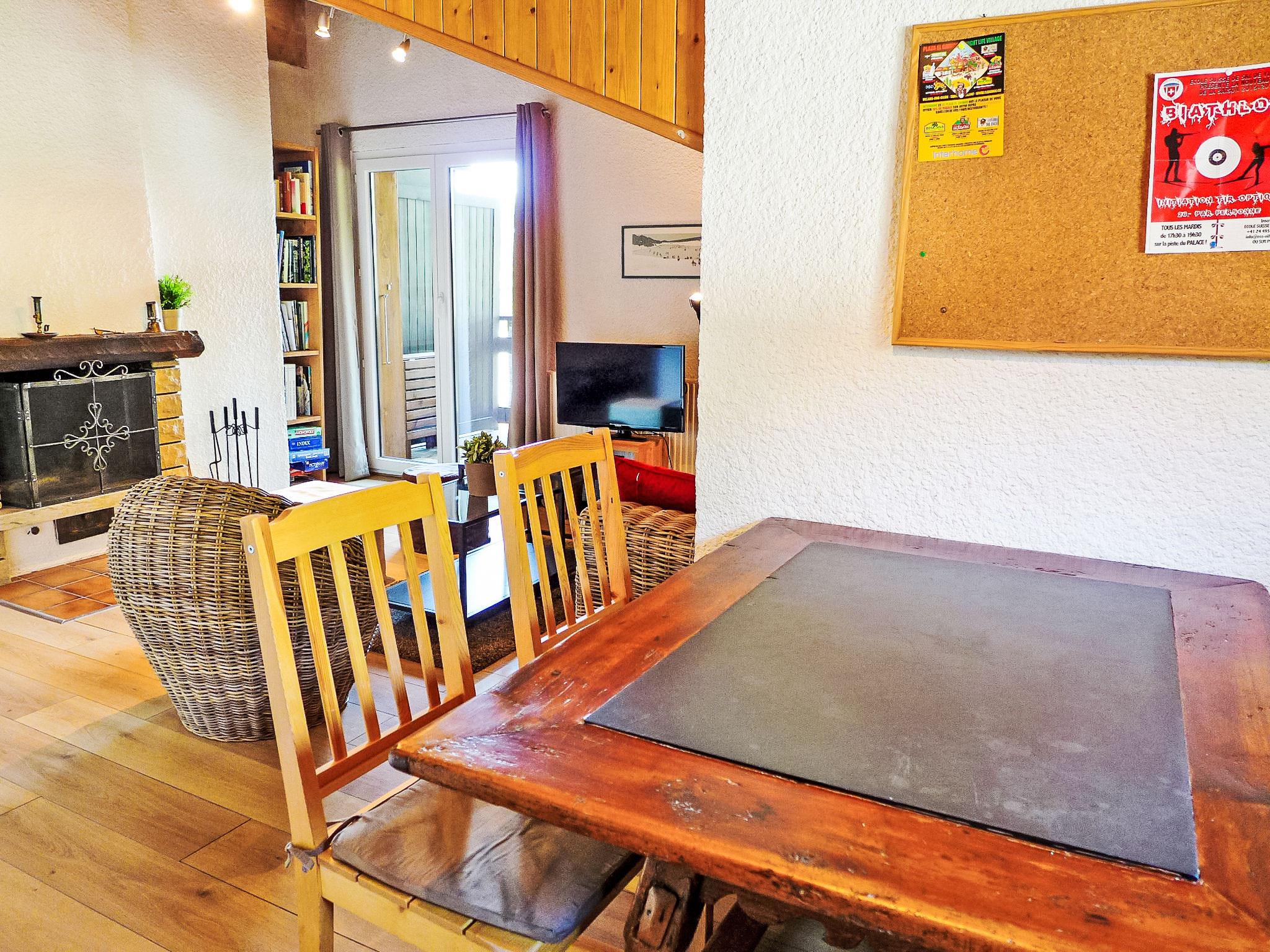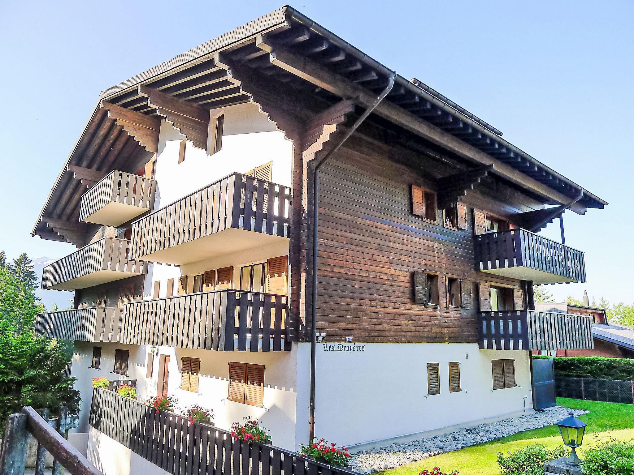"Les Bruyères 25", 2-room penthouse 42 m2 on 2nd floor. Comfortable and beautiful furnishings: living/dining room with open-hearth fireplace (only for decoration), TV (flat screen), DVD. Exit to the balcony, south facing position. 1 room with 1 x 2 bunk beds, 1 double bed (160 cm). Open kitchen (oven, dishwasher, 4 ceramic glass hob hotplates, toaster, kettle, microwave, electric coffee machine, Capsules for coffee machine (Dolce Gusto) extra, raclette grill, combination microwave, fondue Set (cheese)). Bath/WC. Small balcony 6 m2. Balcony furniture. Very beautiful view of the mountains. Facilities: hair dryer. Internet (WiFi, free). IPod docking station. Garage space n 25.