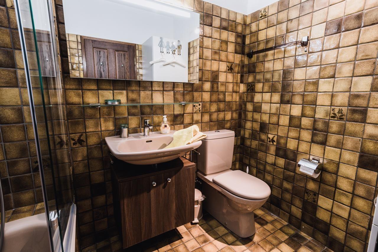 Bathroom with bathtub and shower curtain, hairdryer, cleaning cupboard with hoover and damp mop, toilet paper, broom, small broom and shovel, shoe polish brushes, cleaning products.