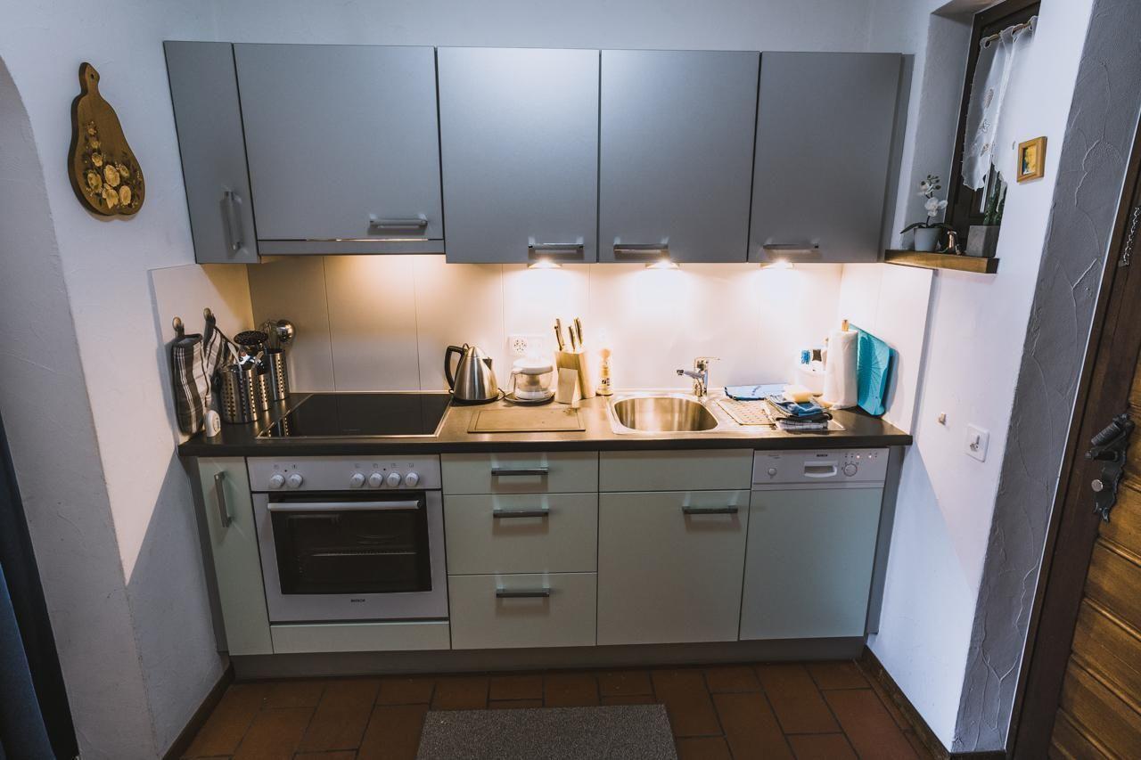 Kitchen in the entrance area with dishwasher, cooker with ceramic hob, microwave, extractor bonnet, oven, large fridge with freezer compartment, kettle, filter coffee machine (suitable filter paper is available), toaster, moka maker, elect. Press for citrus fruits, crockery, glasses and cutlery for 4 persons, 3 pans, 2 frying pans, knife block, 2 rubbish bags, washing-up liquid, liquid hand soap, tabs for dishwasher, household paper, aluminium foil, cling film, salt, pepper, sugar sticks, paper napkins and candles.