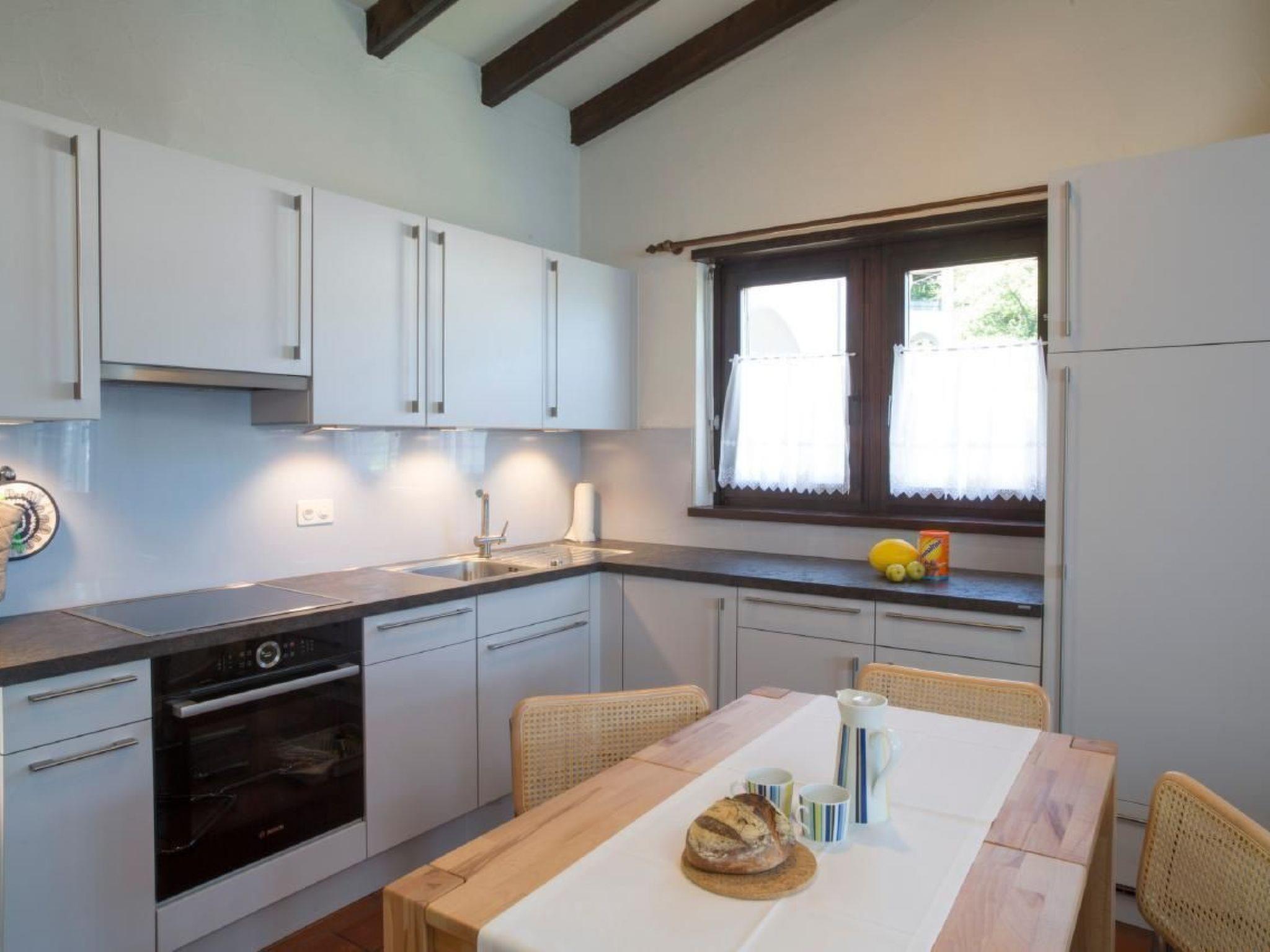 Fully equipped kitchen with induction hob, oven, dishwasher and large fridge with freezer compartment.