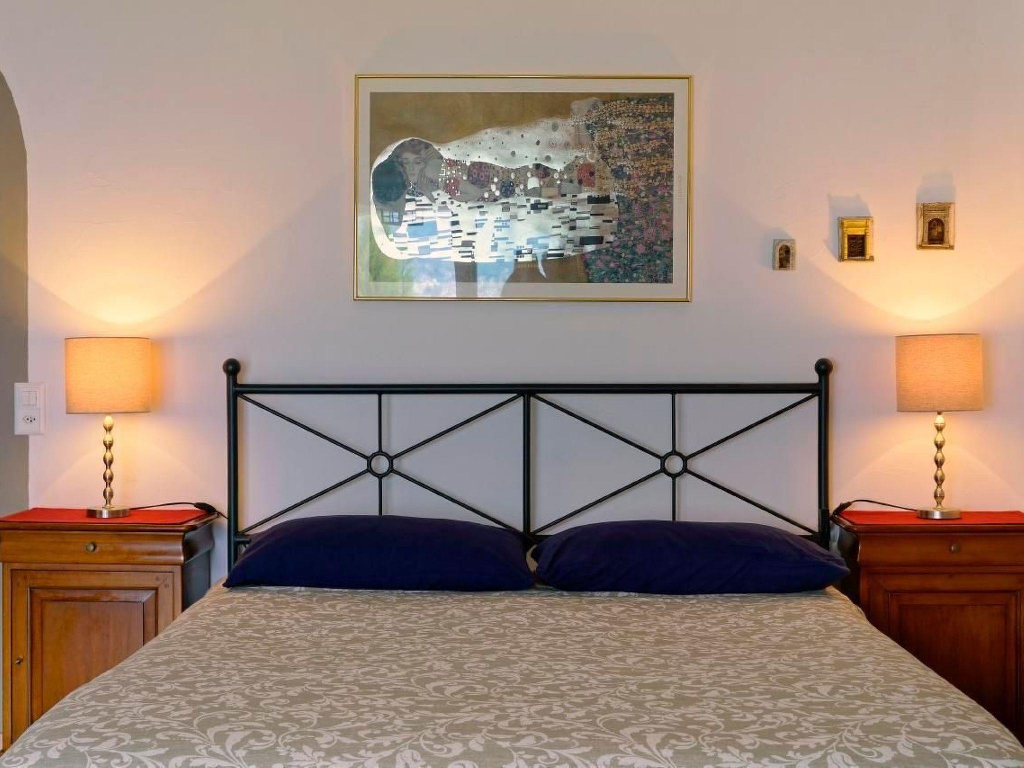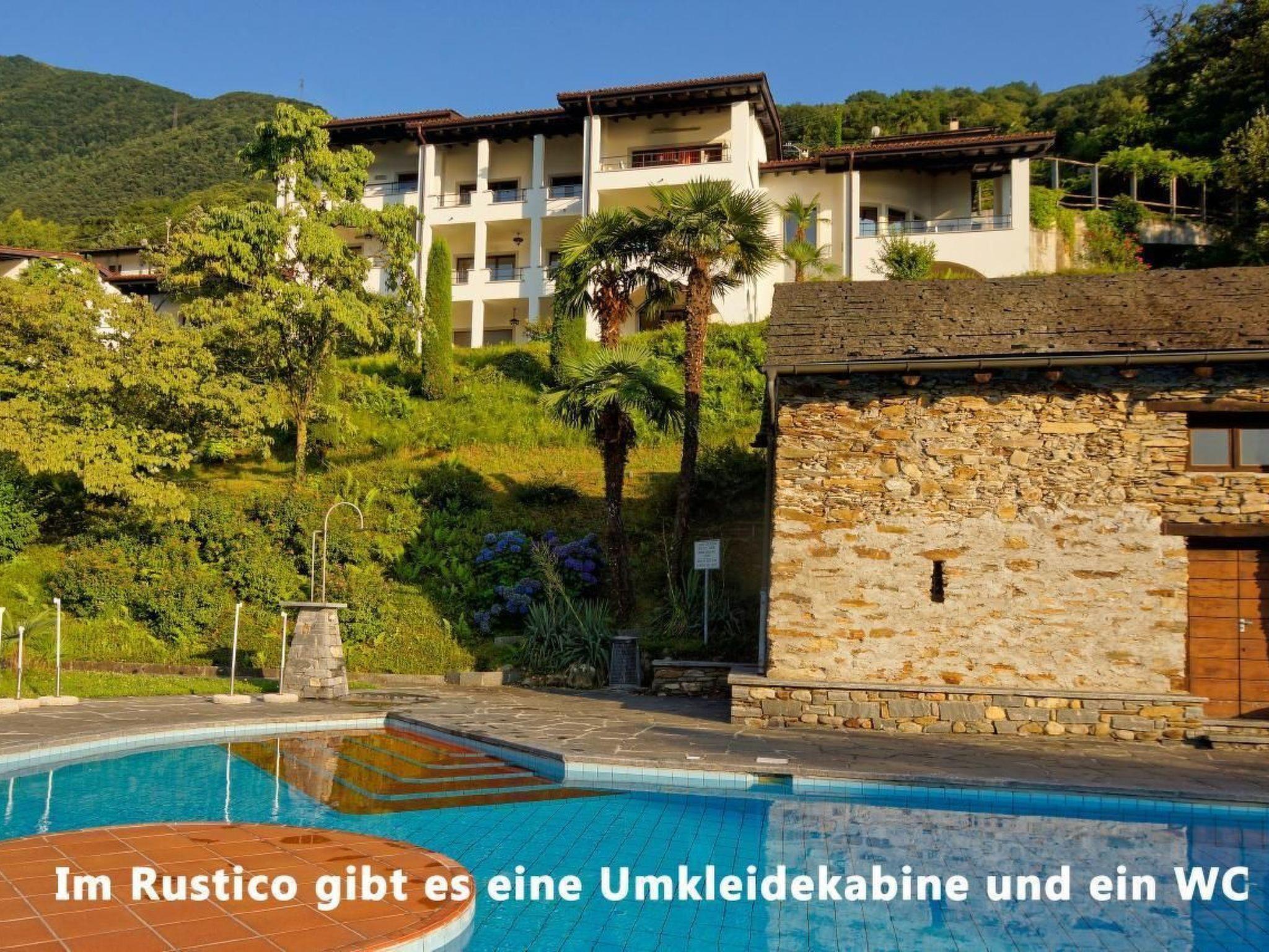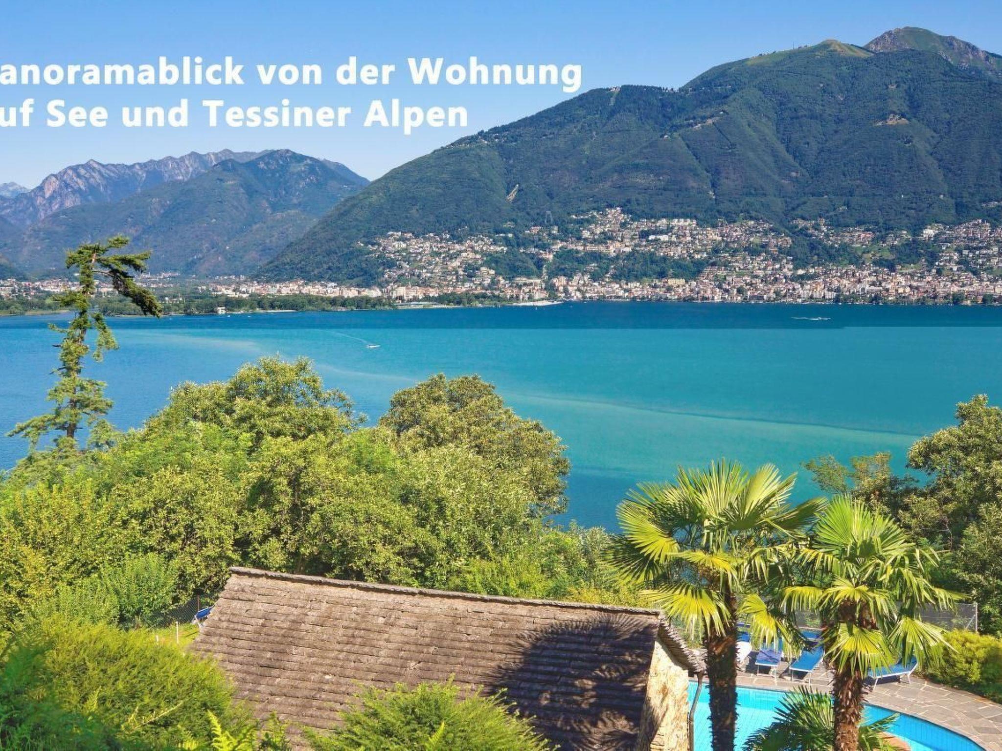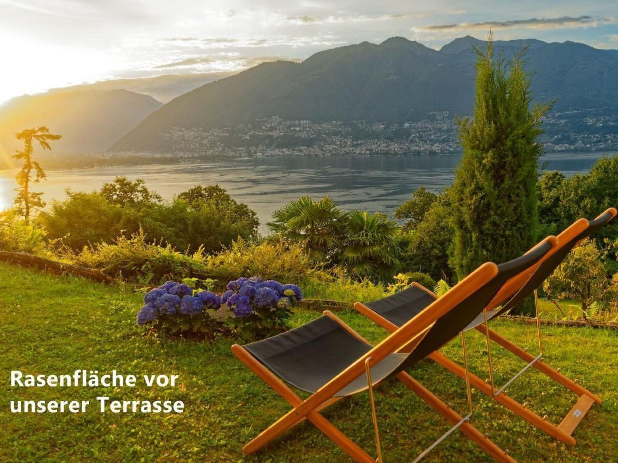 The flat in Casa Aurelia is part of a well-maintained holiday residence. Six houses are generously spread out on a lushly planted hillside plot of around 16,000 square metres. As the holiday flat is on the ground floor, you can also sit on the large terrace surrounded by greenery, directly between palm trees and flowering shrubs. Under the cosy round arches, you can enjoy the lake and mountain panorama from outside in almost any weather. And in summer, the evening sun shines on our terrace for a long time while the opposite side of the lake with Locarno and Ascona is already in the shadow of the mountains. This is how you live: