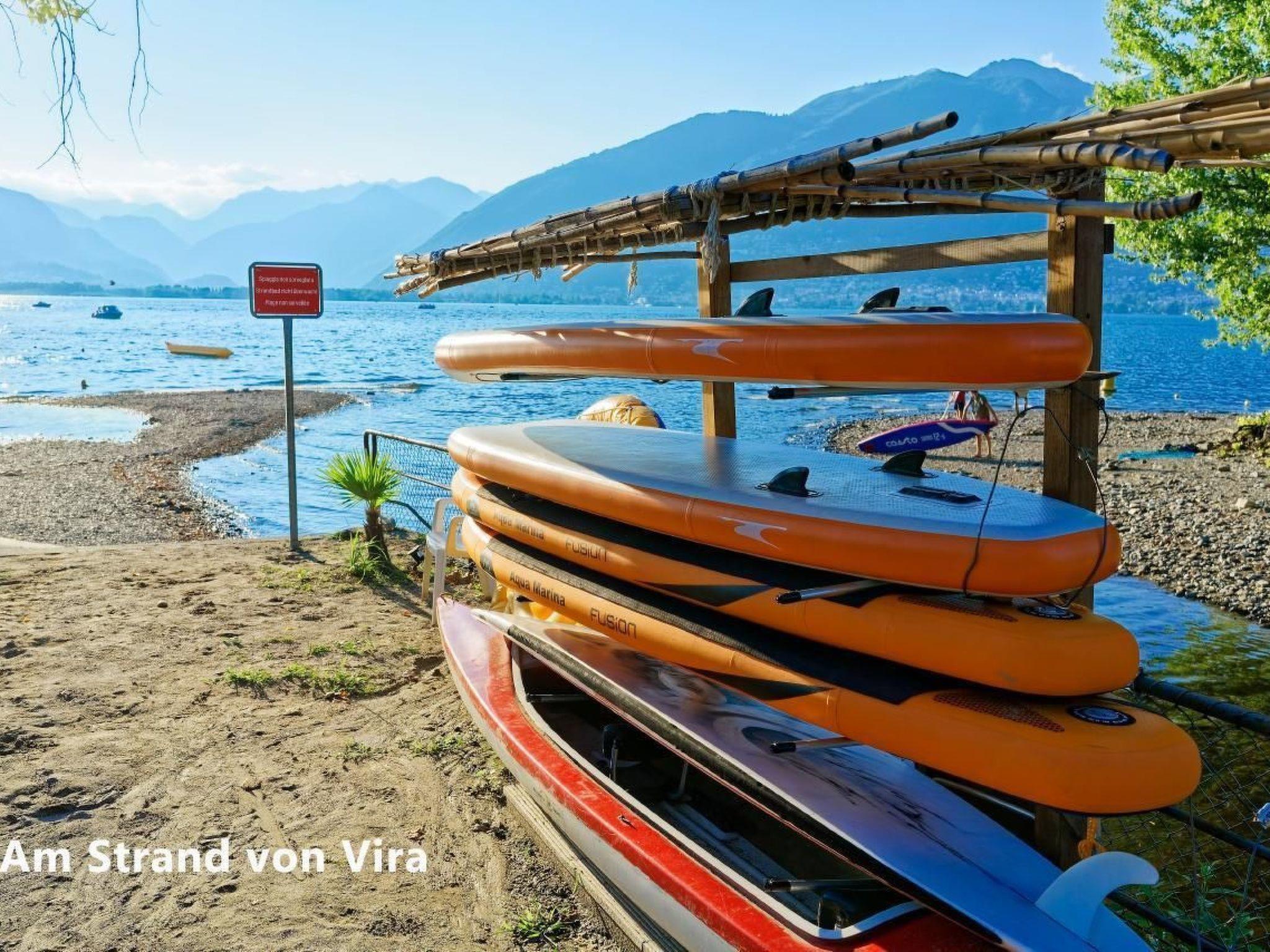 Our holiday flat is located around 150 metres above the lake in the popular holiday resort of Vira (Gambarogno) at the eastern end of Lake Maggiore, just before the border with Italy. The famous Swiss holiday resorts of Locarno and Ascona are within sight and only a stone's throw away by car. The idyllic villages of the Riviera del Gambarogno with romantic Ticino houses in winding alleyways and numerous beautiful beaches are also right on the doorstep. Since 2021, there have even been free sun loungers and parasols on the beaches run by the municipality of Gambarogno. SUP boarders will also find ideal conditions here.