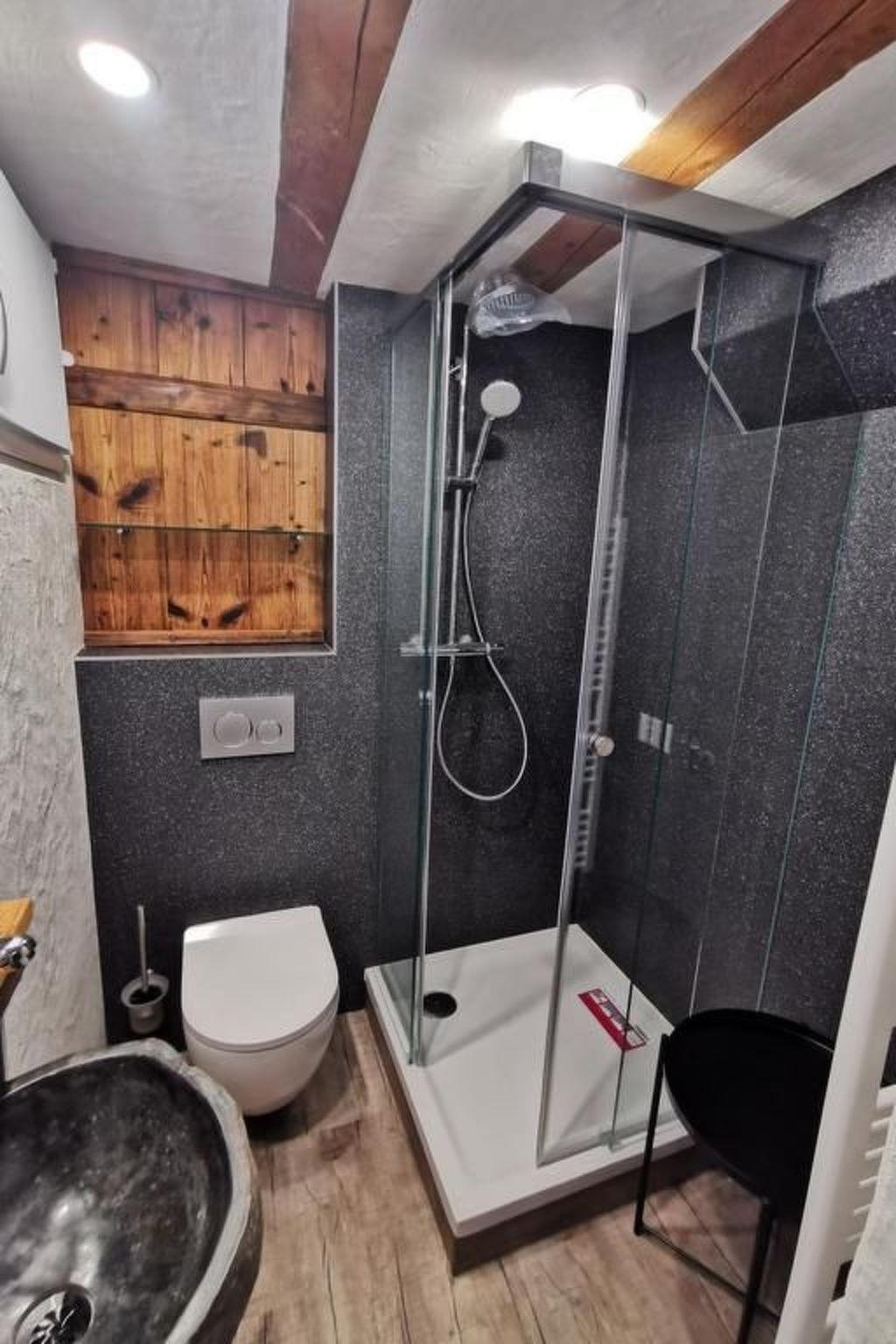 There is a kitchen with dining room, living room with double bed and bathroom with shower and WC.