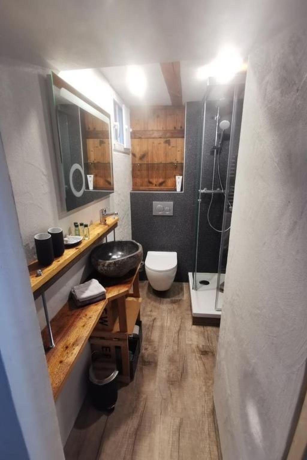 Living room / bedroom: Cosy separate seating area, charging stations for standard electronics. Double bed with small bedside tables.