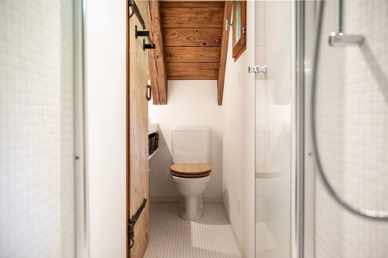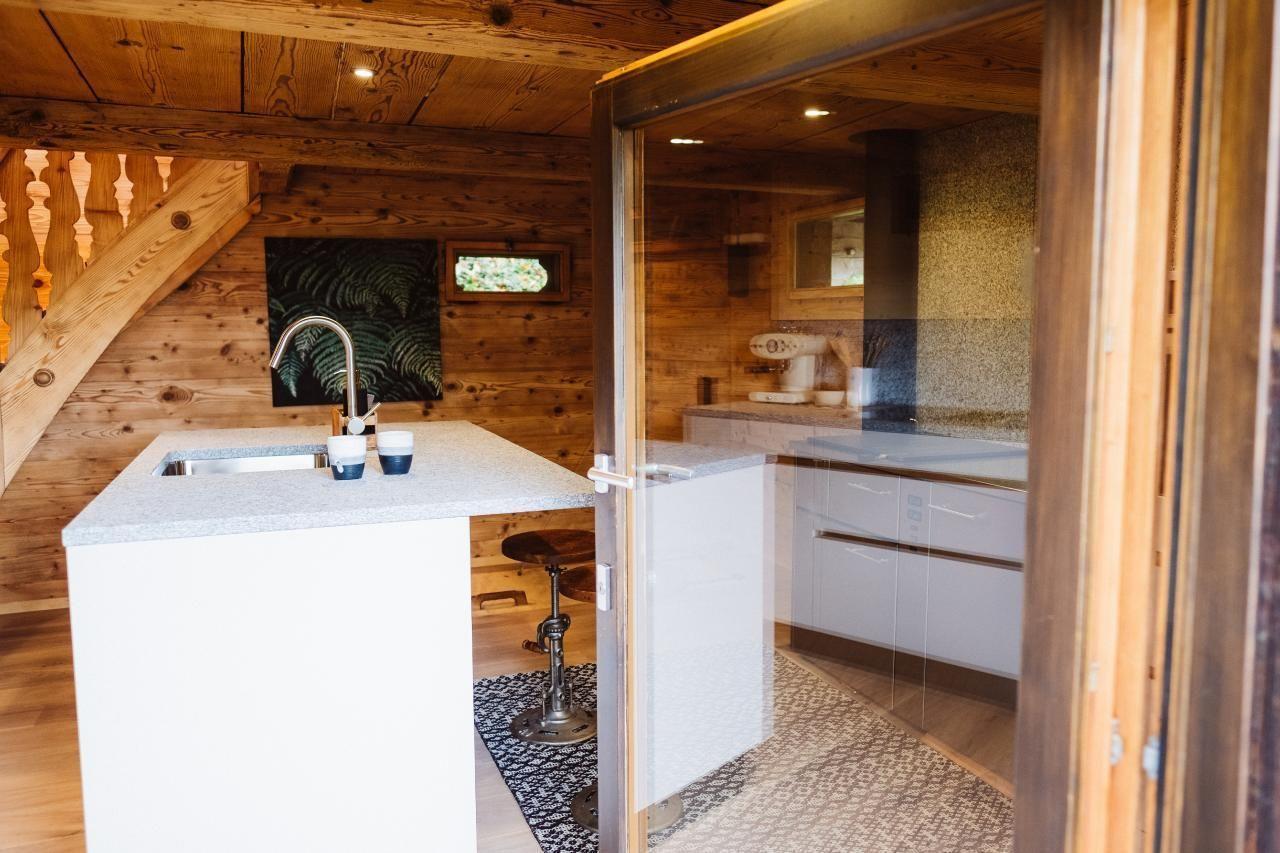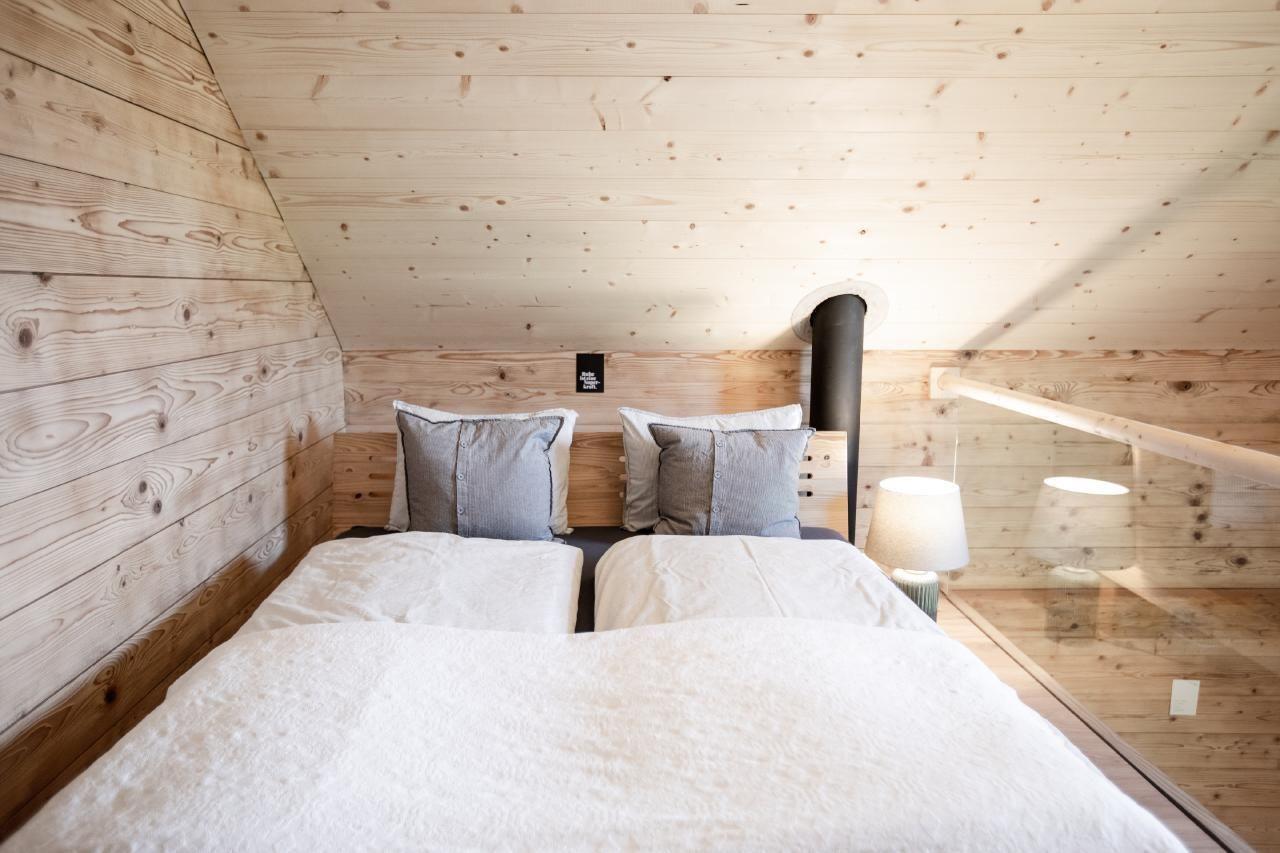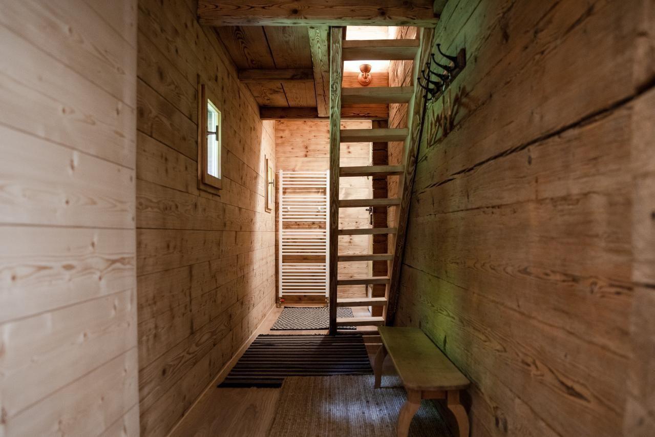 Furthermore, a narrow and slightly steep staircase leads to a sleeping gallery and a bathroom. From the gallery, you can enjoy a charming view of the open-plan living area.