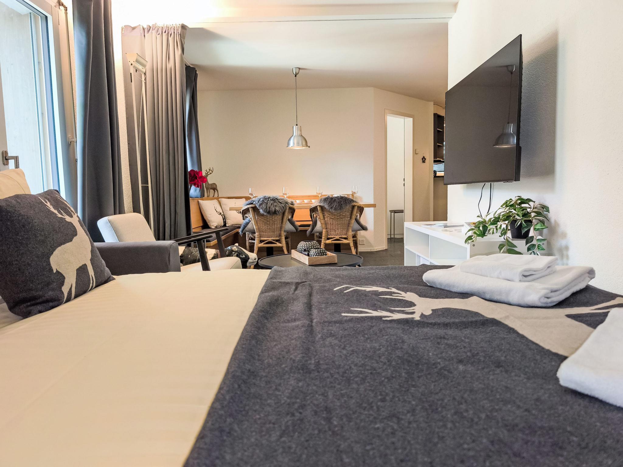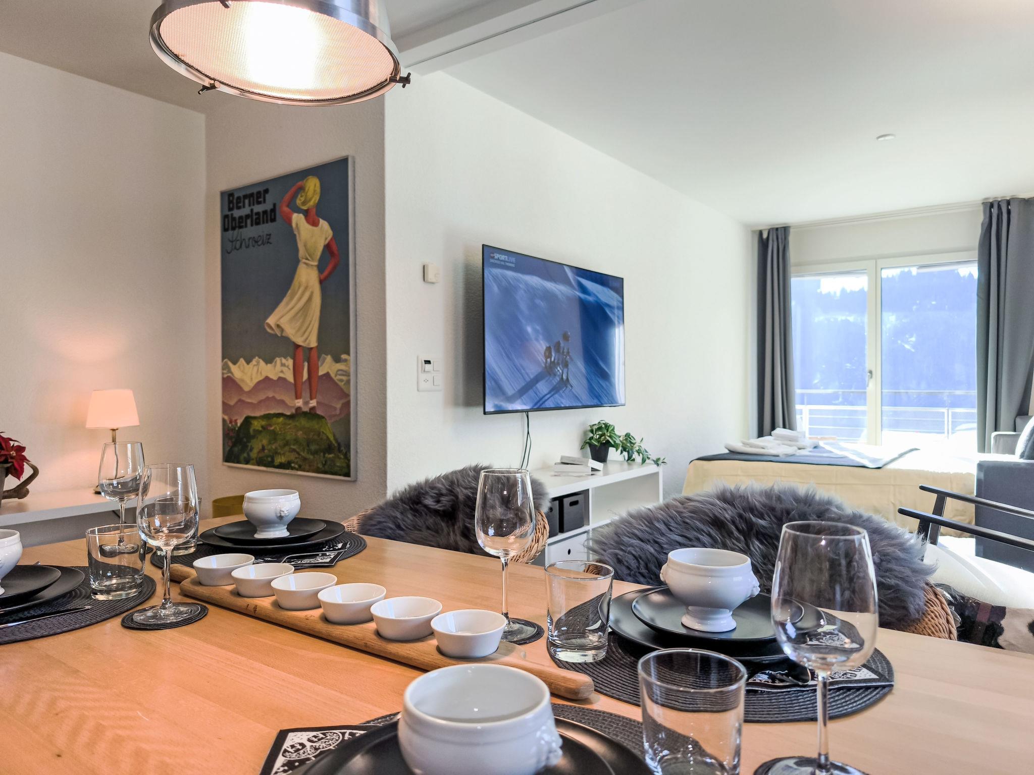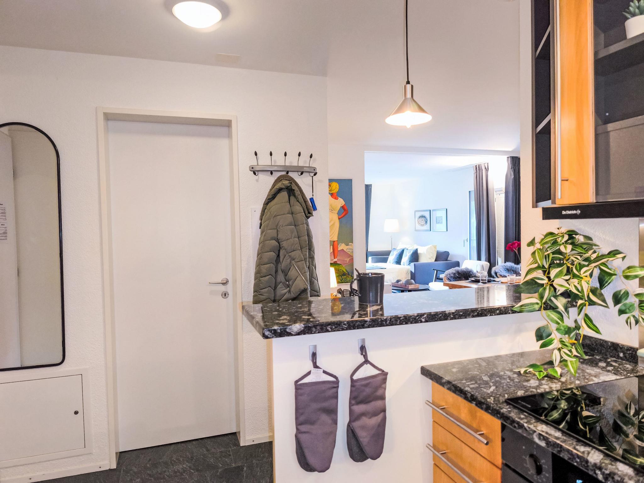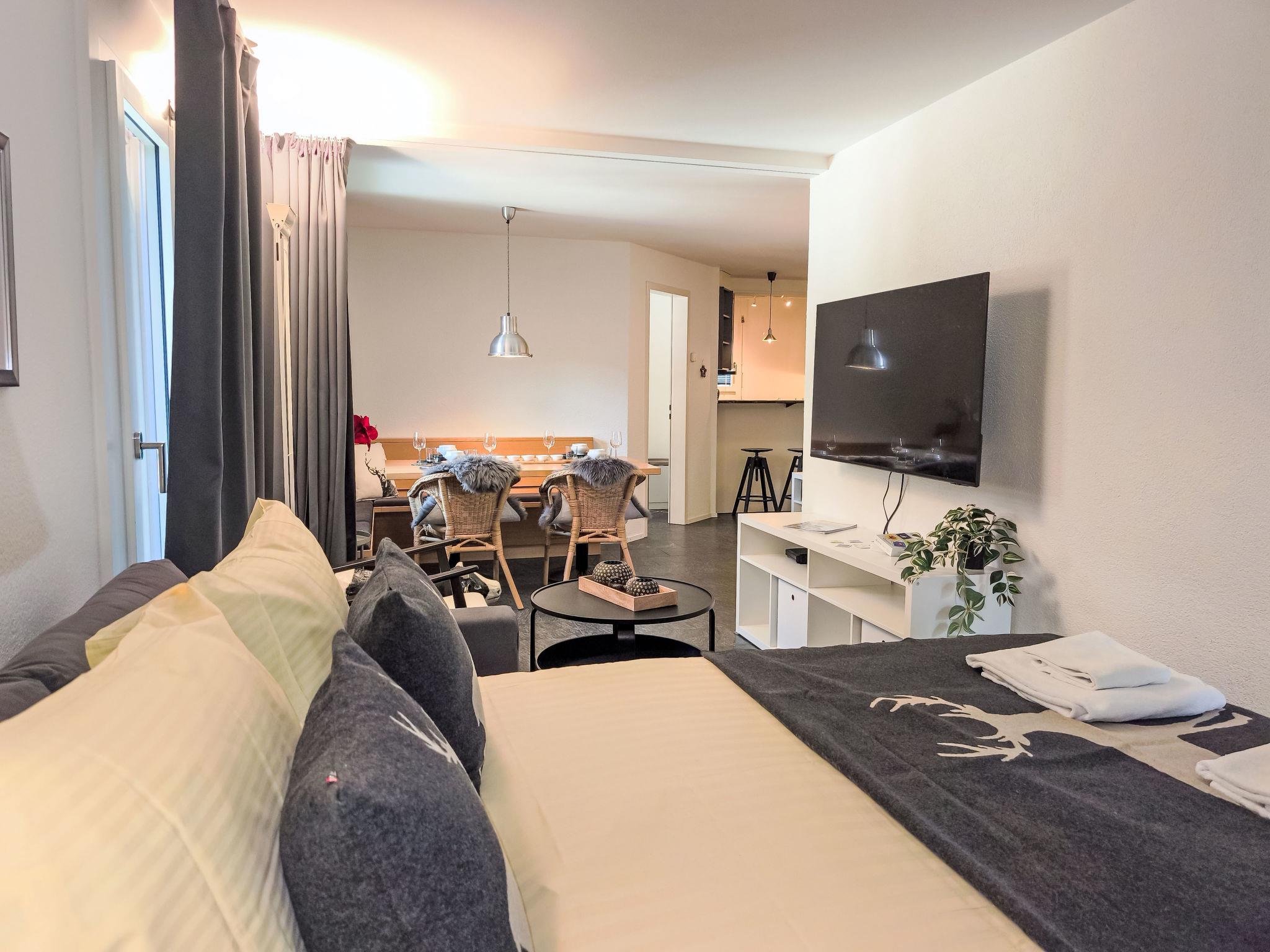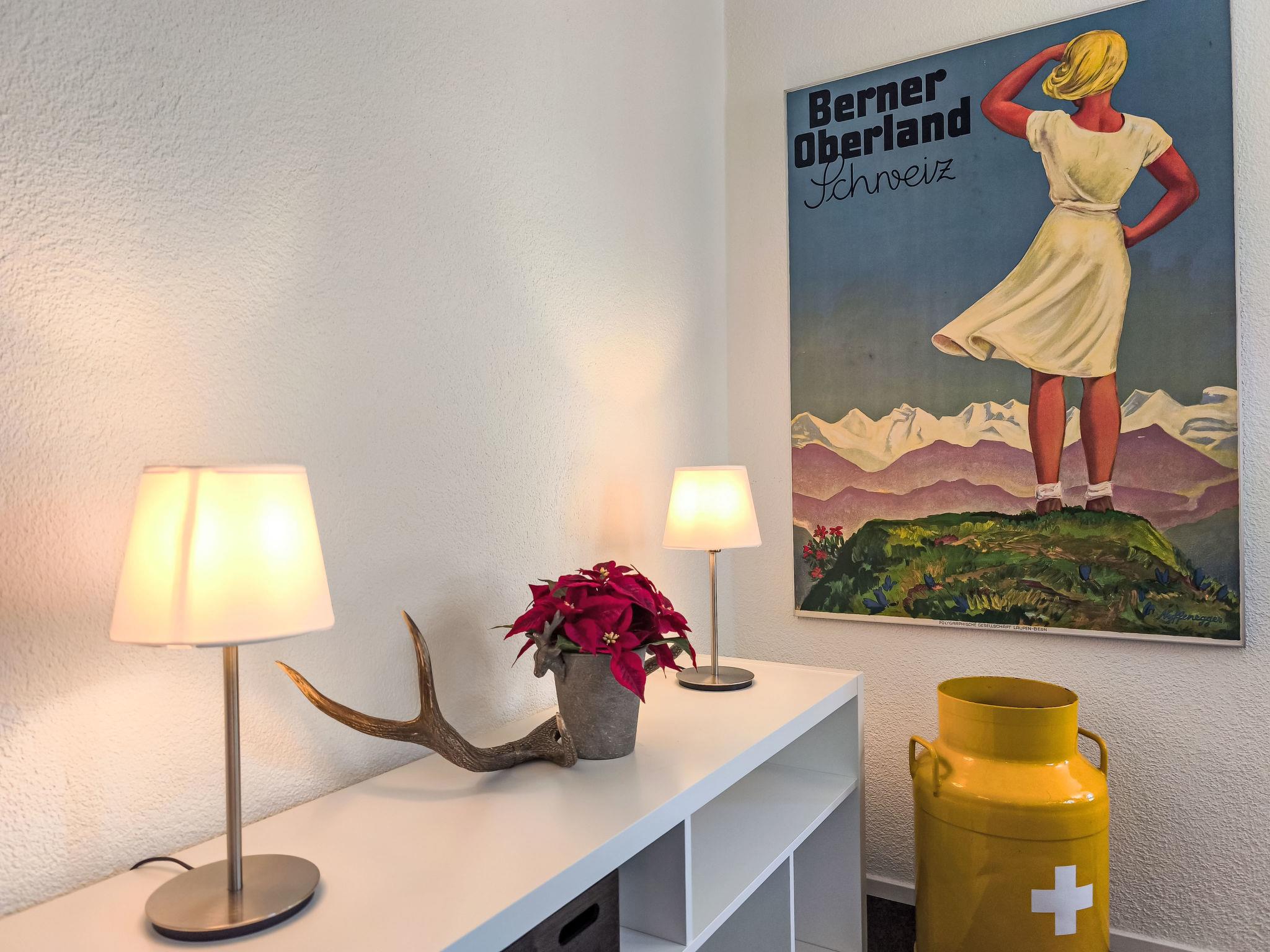 "Silence, Apt. P", 2-room apartment on 1st floor. Object suitable for 2 adults + 2 children. Comfortable and cosy furnishings: living/dining room with 1 sofabed (140 cm, length 200 cm), dining table and cable TV. Exit to the balcony. 1 room with 1 double bed (2 x 90 cm, length 200 cm). Open kitchen (oven, dishwasher, 4 induction hot plates, toaster, kettle, electric coffee machine, Capsules for coffee machine (Nespresso) extra, raclette grill, fondue Set (cheese)). Bath/WC. Underfloor heating. Large balcony, south facing position and west facing position. Balcony furniture. Marvellous panoramic view of the mountains, the valley and Staubbach. Facilities: hair dryer. Internet (WiFi, free). Please note: non-smokers only.