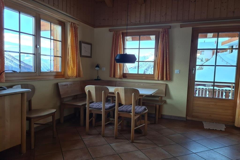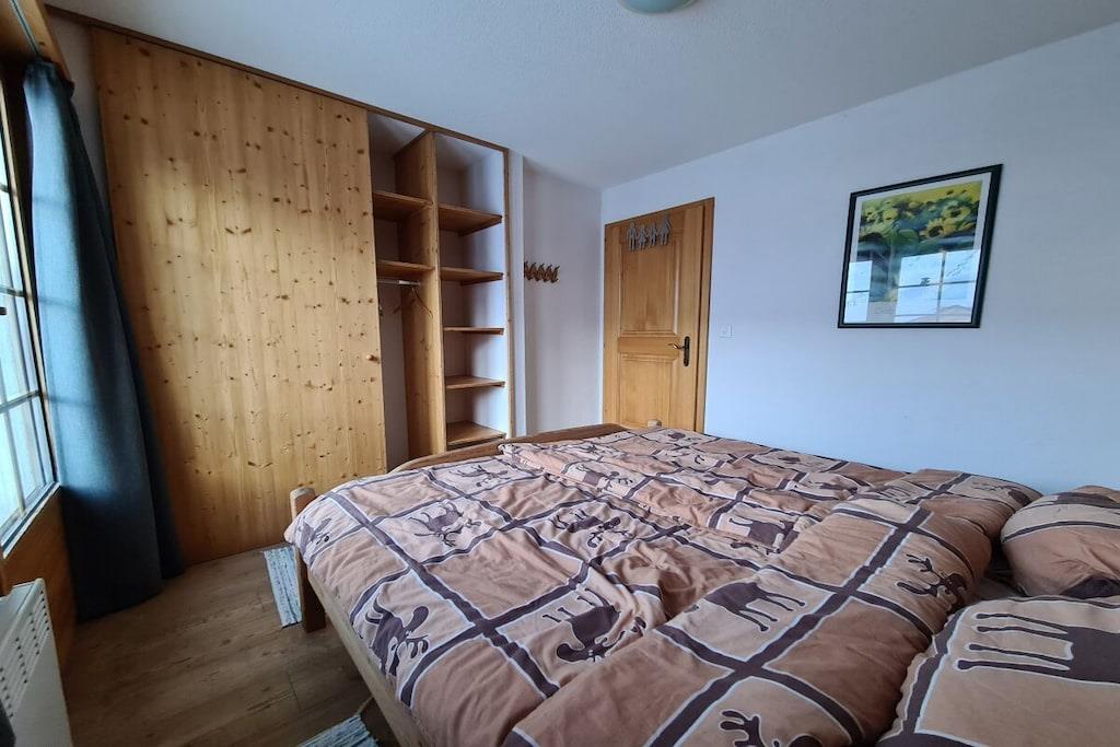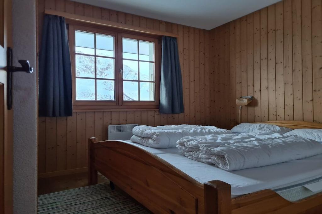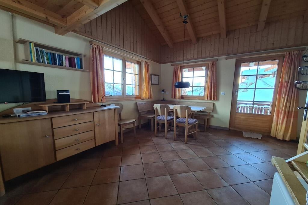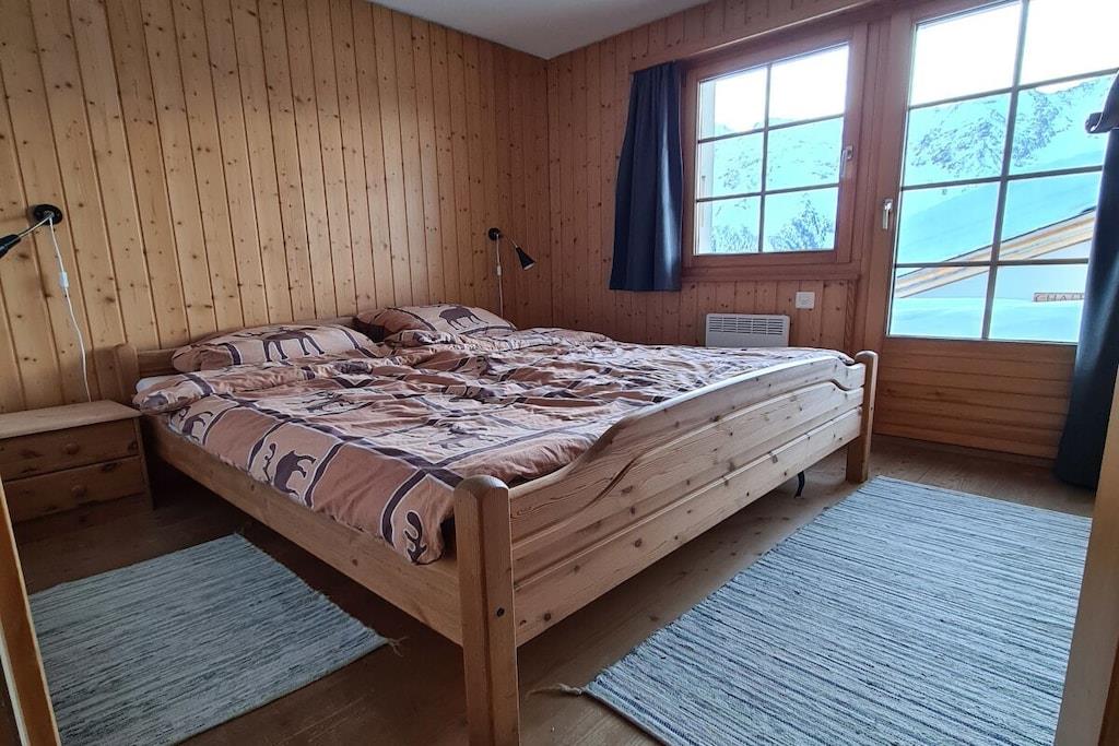 "Chalet Paul" was newly built in 2001. It offers ideal conditions for a relaxing holiday in summer or winter for up to five people. The ground floor features three bedrooms and a bathroom with a bathtub/shower and underfloor heating. The sauna is accessible from the bathroom. From the bright and welcoming living room on the upper floor, and especially from the balcony, which faces south and west on two sides, you can enjoy impressive views of the Valais mountains. The dining area with a corner bench and the seating area with a fireplace guarantee cozy hours whatever the weather. A 32-inch Smart TV with a Swisscom Internet TV Box (more than 100 channels from Switzerland, Germany, and Austria), a Bose Soundtouch internet music system with radio station buttons, and a telephone complete the furnishings.
