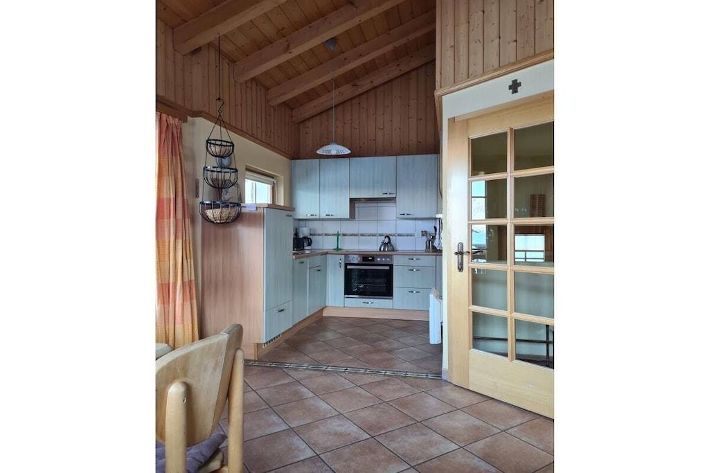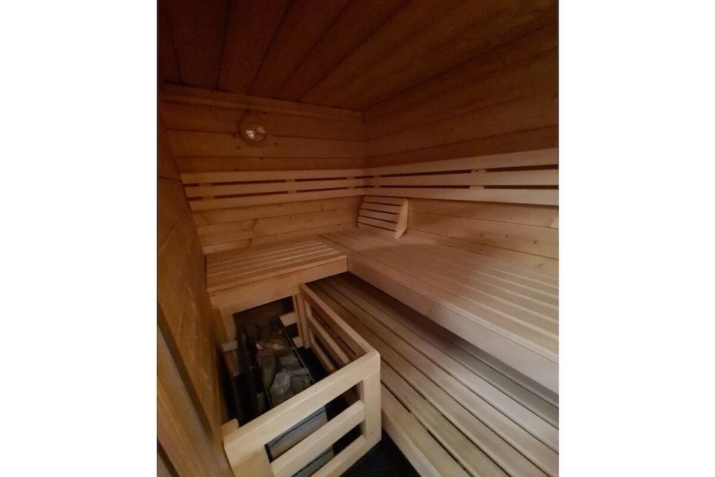 Ground floor: (Living/diningroom(Sofa, TV, dining table, stove)) Hot Water, Internet Access DSL, Vacuum Cleaner, Kitchen(Tea Towels, oven, grill, microwave, dishwasher, fridge, freezer, freezer), bedroom(Bed Linen, cot, children's bed), bedroom(Bed Linen, cot, children's bed), bedroom(Bed Linen, cot, children's bed), bathroom(toilet, bath tub, shower, washbasin, washing machine), guest toilet, relaxation area(sauna), Internet access, Internet access, washing machine, balcony(Sun Umbrella, garden furniture, sun loungers), terrace(garden furniture, sun loungers), garden, parking, iron, telephone