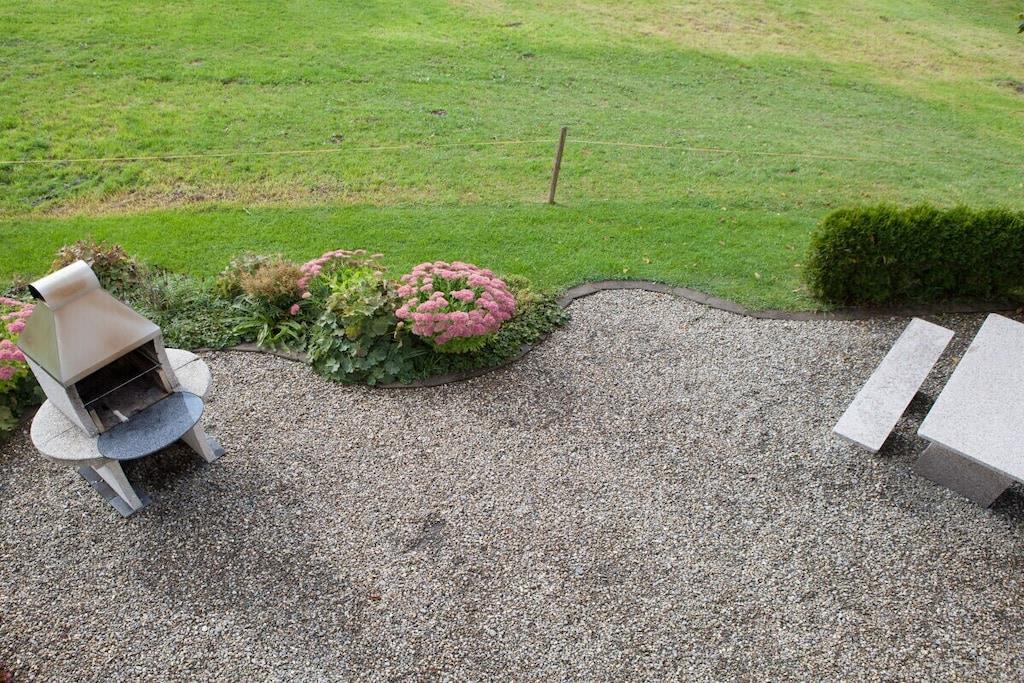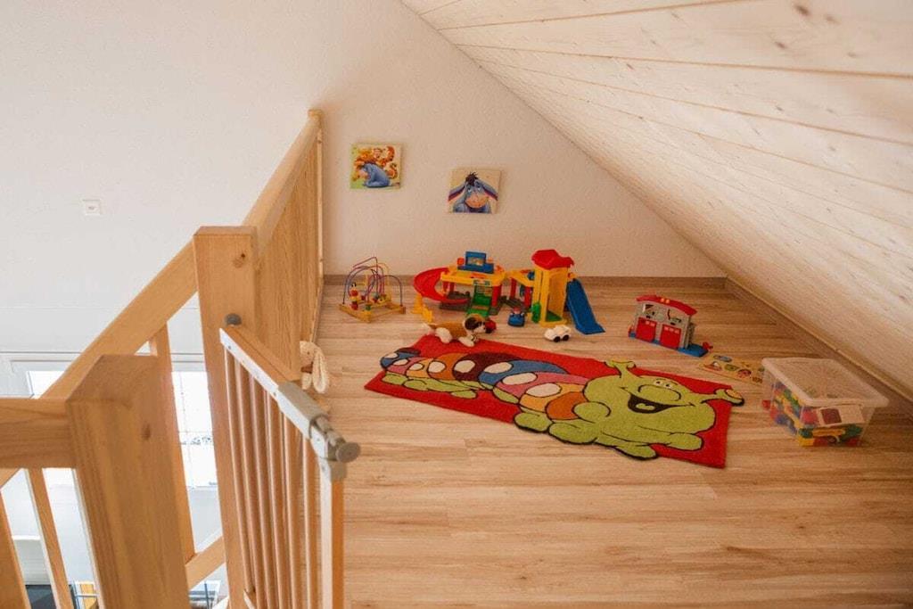 Mezzanine: (bedroom(Bed Linen, single bed, double bed, children's bed)) On the 1st floor: (open kitchen(Spices, Tea Towels, Kitchenette, TV, radio, hob, electric kettle, toaster, cooker, coffee machine, microwave, fridge, freezer), Living/diningroom(TV, dining table, radio), bedroom(Bed Linen, double bed, cot), bathroom(toilet, tumble dryer, shower, washbasin, hairdryer), storage(tumble dryer, washing machine)) Hot Water, Vacuum Cleaner, Internet access, balcony(garden furniture, sun loungers), heating, terrace(Barbecue center, grill, garden furniture, sun loungers), garden, parking, stair gate, drying cabinet