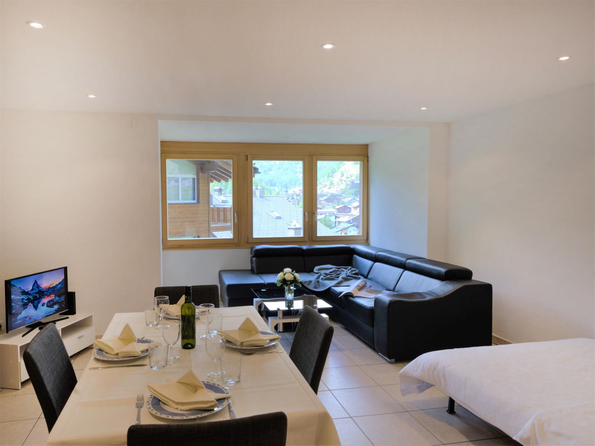 2-room apartment 45 m2 on 1st floor, south facing position. Simple and cosy furnishings: living/sleeping room with 1 double sofabed (1 x 150 cm, length 200 cm), dining table and TV. Exit to the balcony. 1 room with 1 double bed (160 cm, length 200 cm). Open kitchen (oven, dishwasher, 4 induction hot plates, toaster, kettle, freezer, electric coffee machine, fondue Set (cheese)). Shower/WC, hydro massage shower. Small balcony, south facing position. Balcony furniture. Beautiful view of the Matterhorn. Facilities: hair dryer. Internet (WiFi, free). Please note: non-smokers only. ZZLMRC55A10E514S