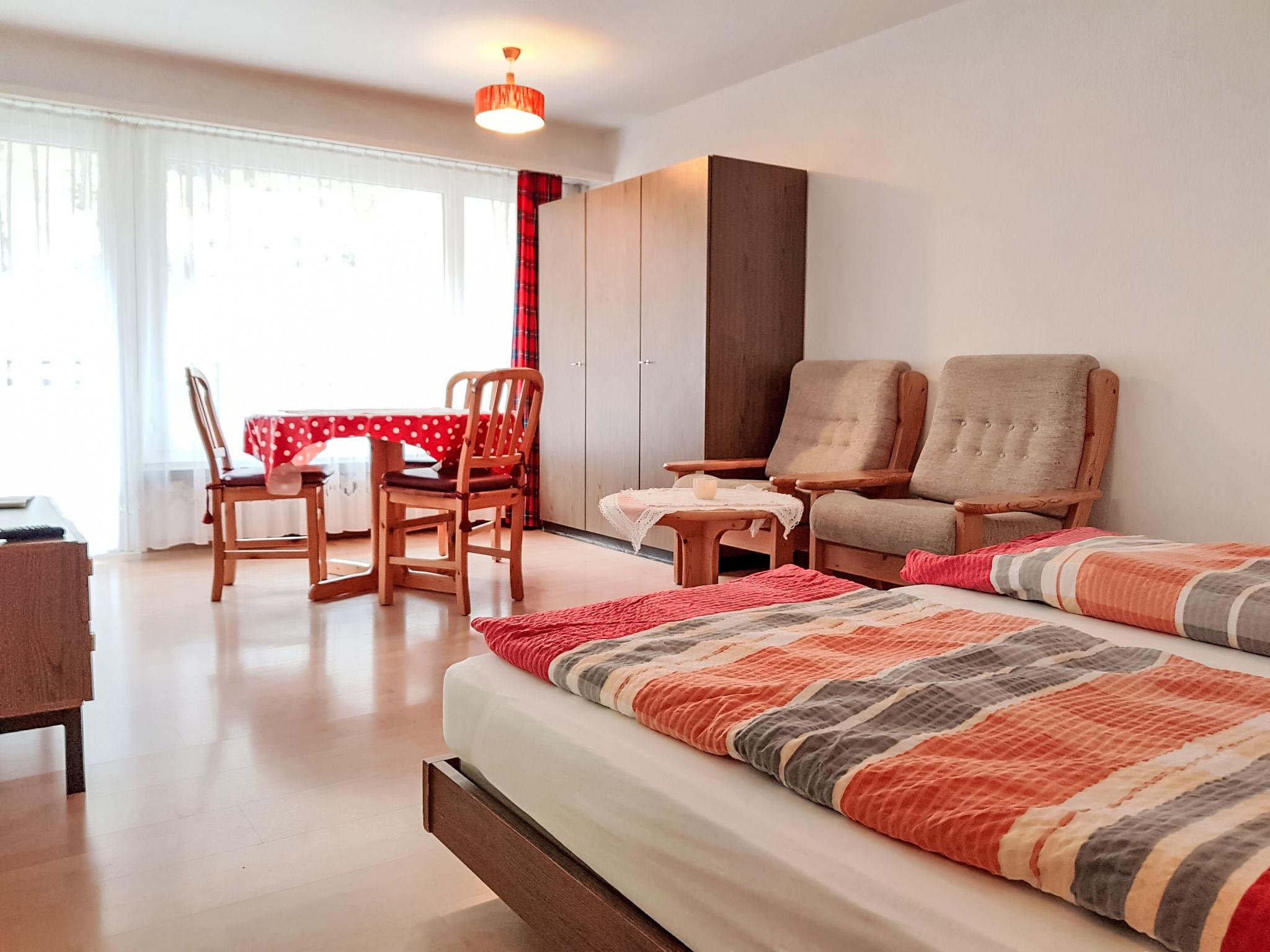1-room apartment 30 m2, on the ground floor. Simple and practical furnishings: living/sleeping room with 1 double bed (2 x 90 cm, length 200 cm), dining table, cable TV and radio. Exit to the balcony. Kitchen (3 hot plates, toaster, kettle, freezer, electric coffee machine, fondue Set (cheese)). Bath/WC. Balcony 8 m2, east facing position. Balcony furniture. View of the mountains. Facilities: hair dryer. Internet (WiFi, free). Please note: non-smokers only. Maximum 1 pet/ dog allowed.