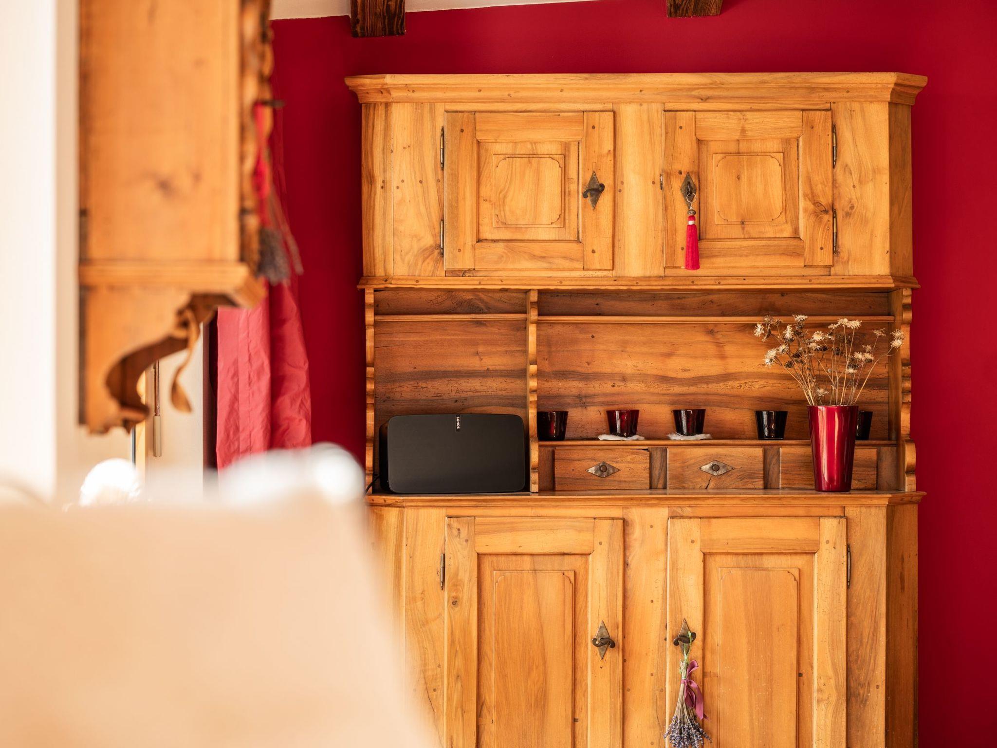 - Large living room with fireplace stove, large flat-screen TV with Swisscom TV and video-on-demand; DVD; WLAN; stereo system (with iPod / iPhone / iPad connection via USB and Bluetooth, DAB+)