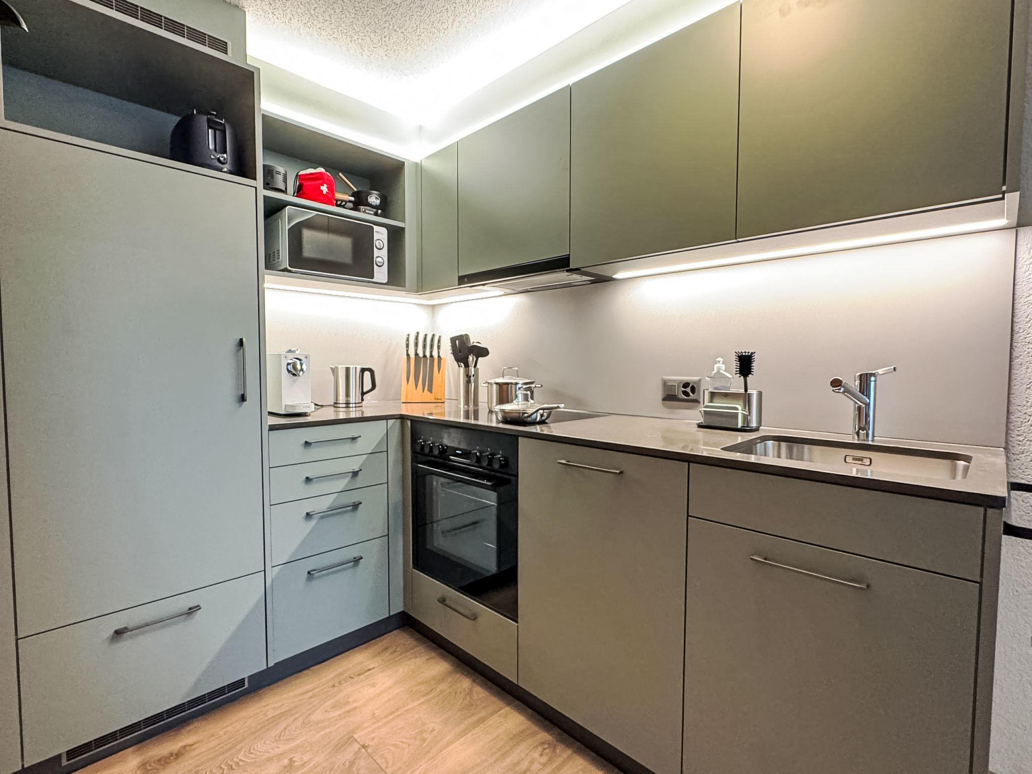 "Juliana 825", 1-room apartment 21 m2 on 2nd floor. Fully renovated in 2025, beautiful and stylish furnishings: living/sleeping room with 1 double bed (2 x 90 cm, length 200 cm), dining table and digital TV. Exit to the balcony. Open kitchen (oven, dishwasher, 4 ceramic glass hob hotplates, toaster, kettle, microwave, freezer, electric coffee machine, raclette grill, fondue Set (cheese)). Shower/WC. Balcony, west facing position. Balcony furniture. View of the mountains. Facilities: hair dryer. Internet (WiFi, free). Please note: non-smokers only.
