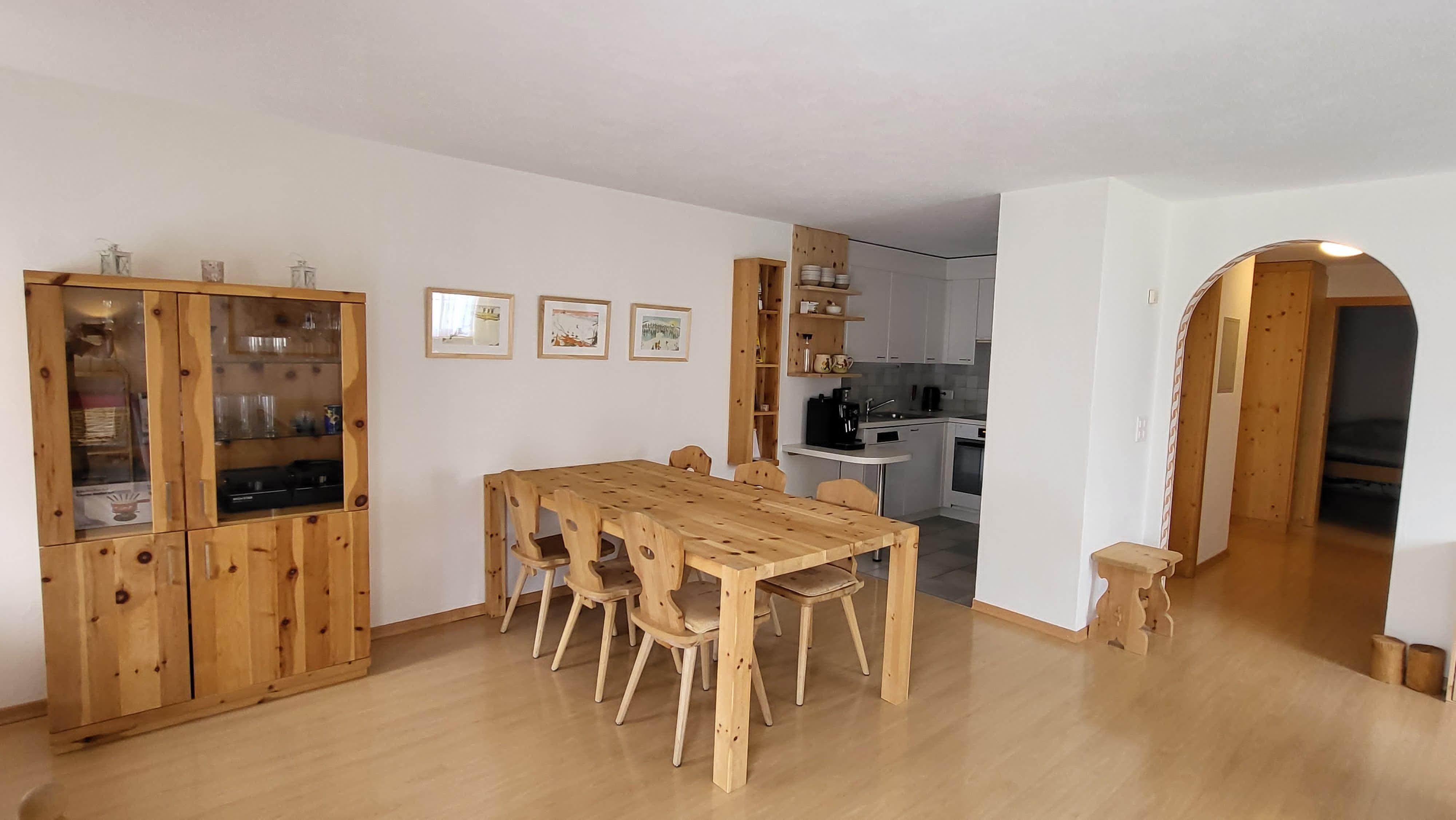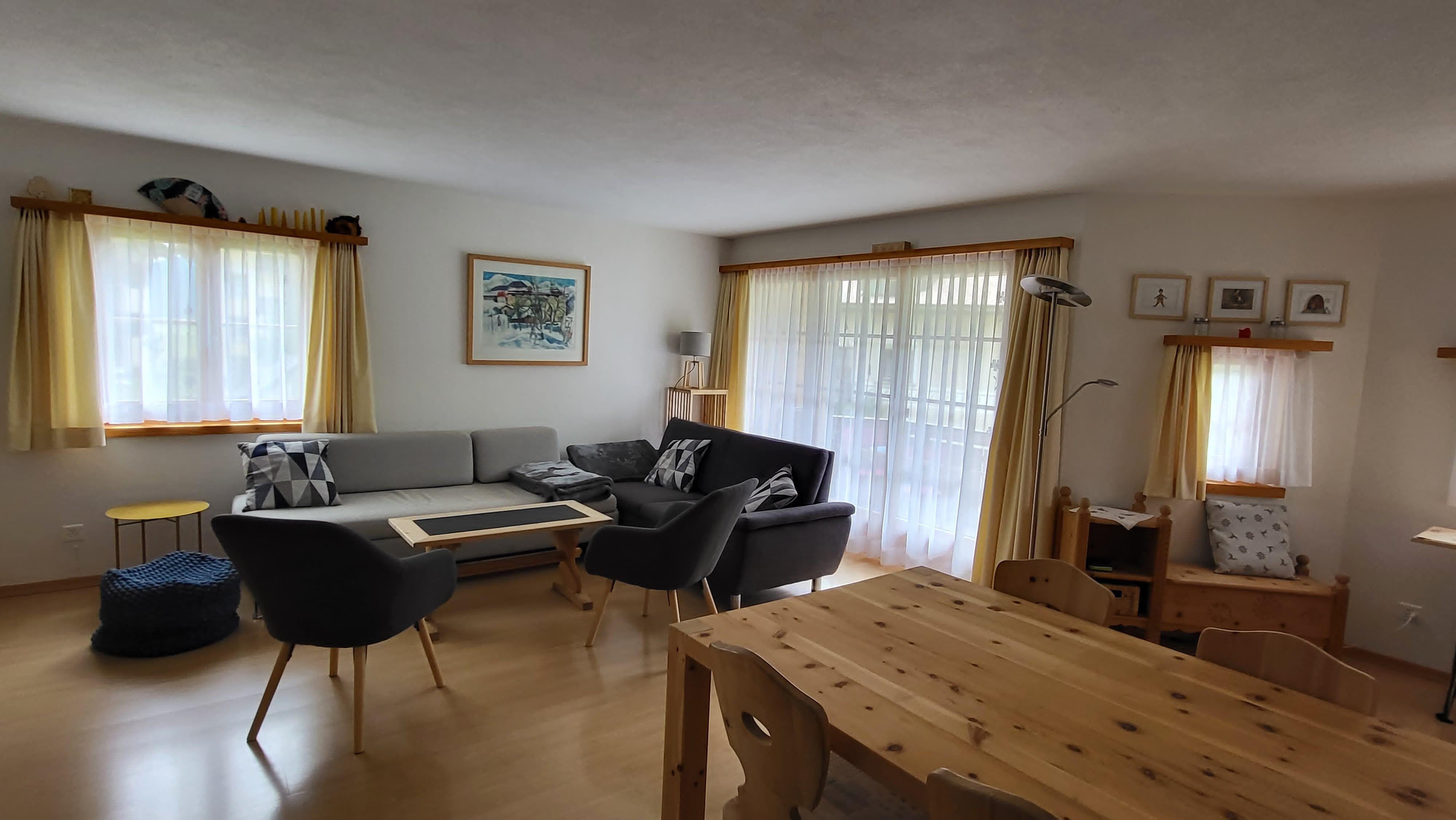 Our holiday flat in Zuoz in the beautiful Engadine (Graubünden) is a friendly, bright and well-kept 4.5-room flat with a cosy atmosphere. The ground-floor flat has a balcony from which you can enjoy a marvellous view of the surrounding mountains. The train station and various shopping facilities are just a three-minute walk away, and the charming village centre is also very close by. The region offers numerous leisure activities: In summer, you can go jogging, cycling, golfing or explore nature on the many hiking trails - the nearby national park is also ideal for excursions. In winter, ideal conditions await you for skiing, snowboarding, ice skating, tobogganing and cross-country skiing on perfectly groomed trails. The surrounding area is particularly child-friendly, and thanks to the good transport links, the neighbouring villages are easily accessible by public transport or car. Here you will find the perfect place for a relaxing holiday surrounded by nature, combined with a wide range of leisure activities right on the doorstep.