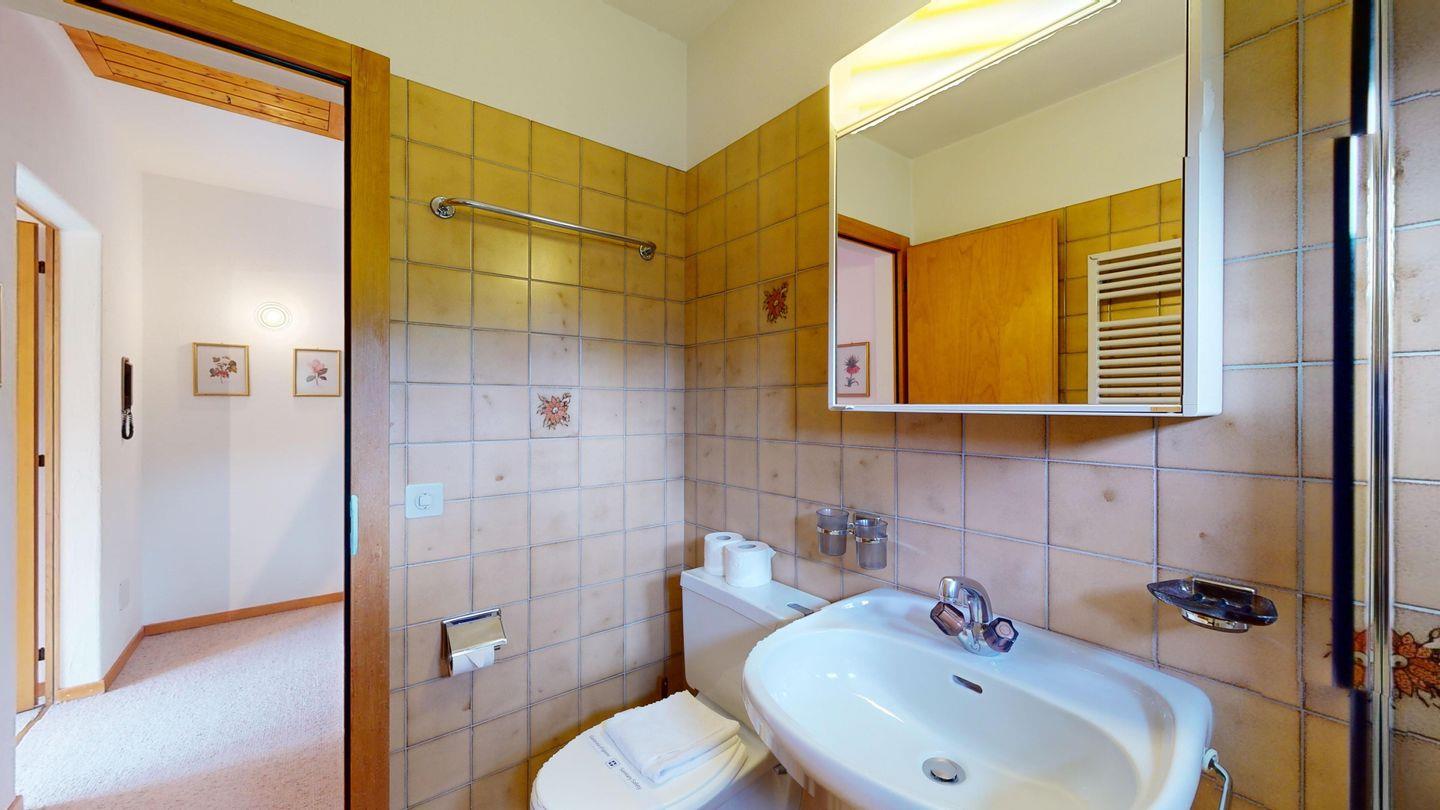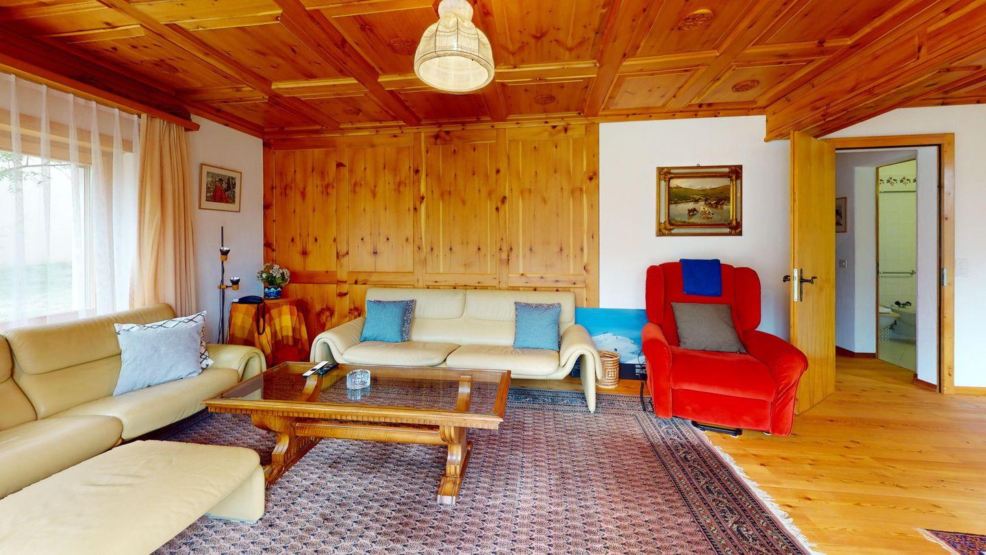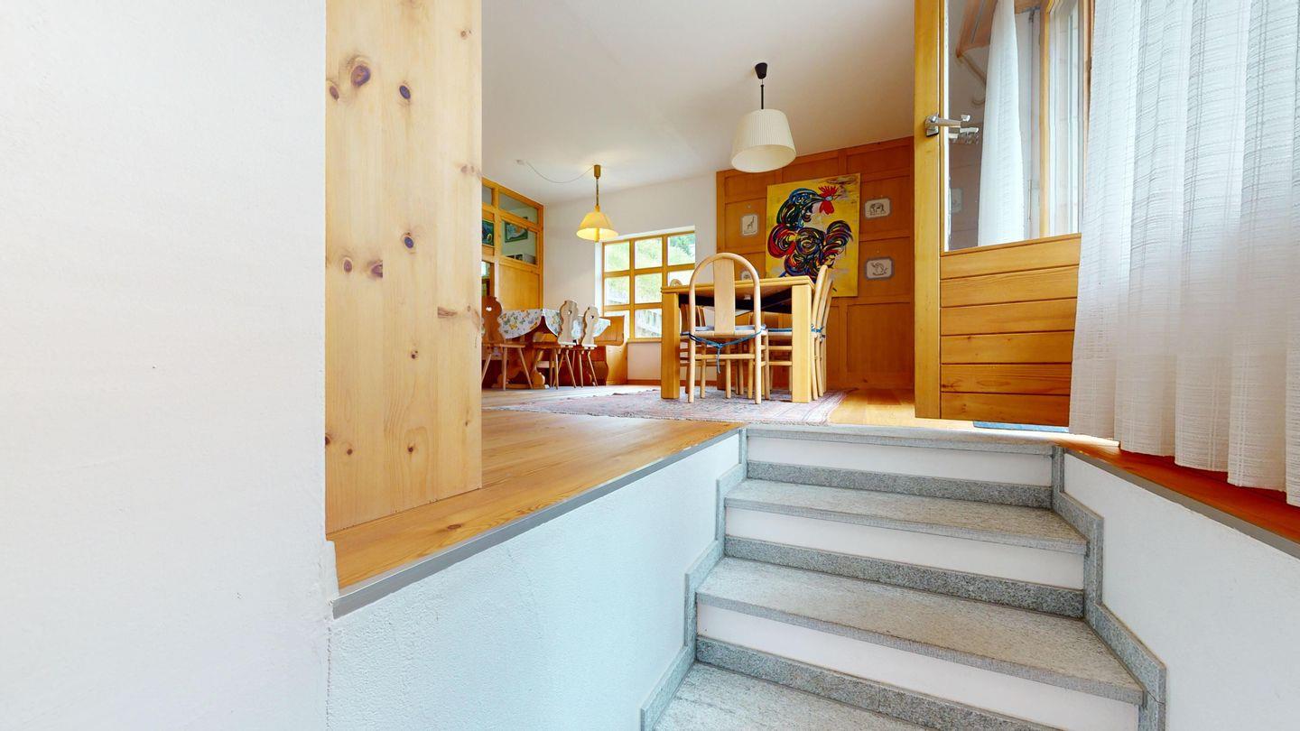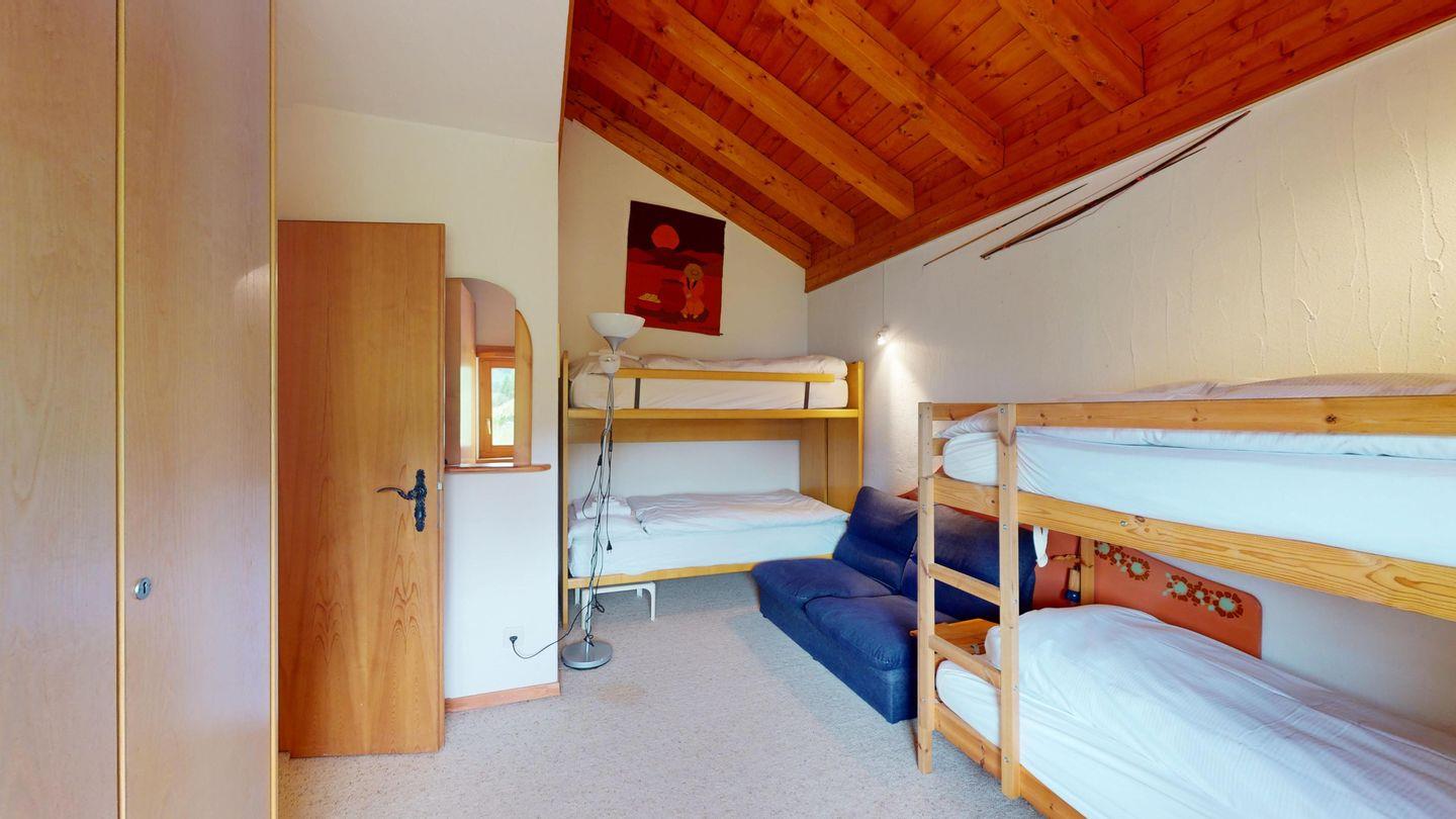 5-½ Zimmerwohnung an sonniger Lage, mit herrlicher Sicht ins Tal und auf mehreren Etagen verteilt. Eingang mit Garderobe und Badezimmer mit Wanne, WC, Bidet und Waschbecken. Wohnzimmer mit TV, Kamin, Terrasse und Garten. Küche mit Herd, Ofen, Kühlschrank und Geschirrspüler. Esszimmer mit zwei Esstischen und Terrasse. Gäste-WC. Ein Einzelschlafzimmer. Ein Doppelschlafzimmer mit eigenem Badezimmer (Dusche, WC, Bidet und Lavabo). Ein Doppelschlafzimmer, und ein Schlafzimmer mit zwei Etagenbetten. Badezimmer mit Wanne, WC, Bidet und Waschbecken. Gemeinsame Waschküche und Skiraum. Zwei gedeckte Parkplätze. Haustiere sind nicht erlaubt. Nichtraucherwohnung.