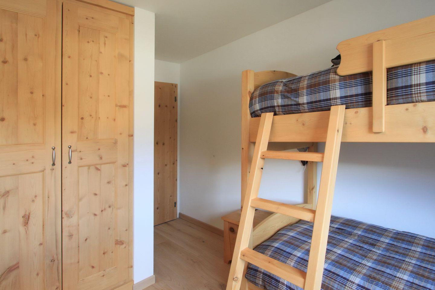 Das grosszügige Wohnzimmer lädt zum Verweilen ein und Satelliten-TV sowie WLAN-Internet stehen zur Verfügung. Die offene Küche ist komplett ausgestattet und verfügt über einen Esstisch. Vom Wohnzimmer gelangen Sie direkt auf den Südbalkon mit viel Sonne und schöner Aussicht. Sie finden ein Schlafzimmer mit einem Doppelbett (160 cm) und eigenem Badezimmer mit Badewanne sowie ein Kinderzimmer mit Etagenbett (2 Schlafplätze) und einem weiteren Badezimmer mit Dusche. Eine Waschküche mit Trockner und ein Skiraum runden das Angebot dieser Wohnung ab. Ein Garagenparkplatz kann kostenpflichtig dazu gebucht werden. Der Kinderstuhl, welcher in den Aufnahmen zu sehen ist, muss vorbestellt werden. Er ist nicht in der Wohnung.