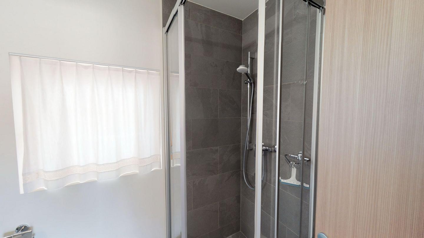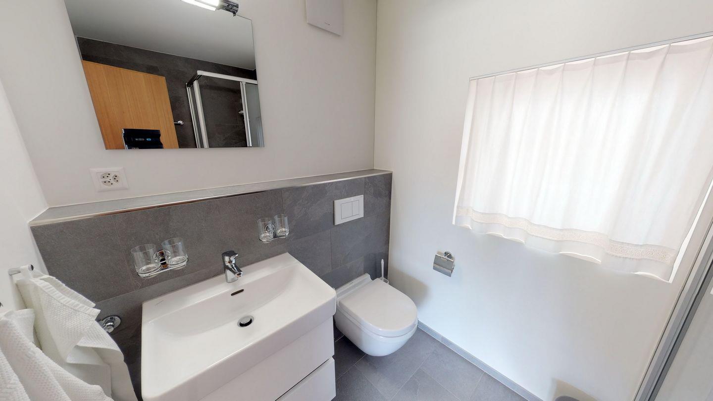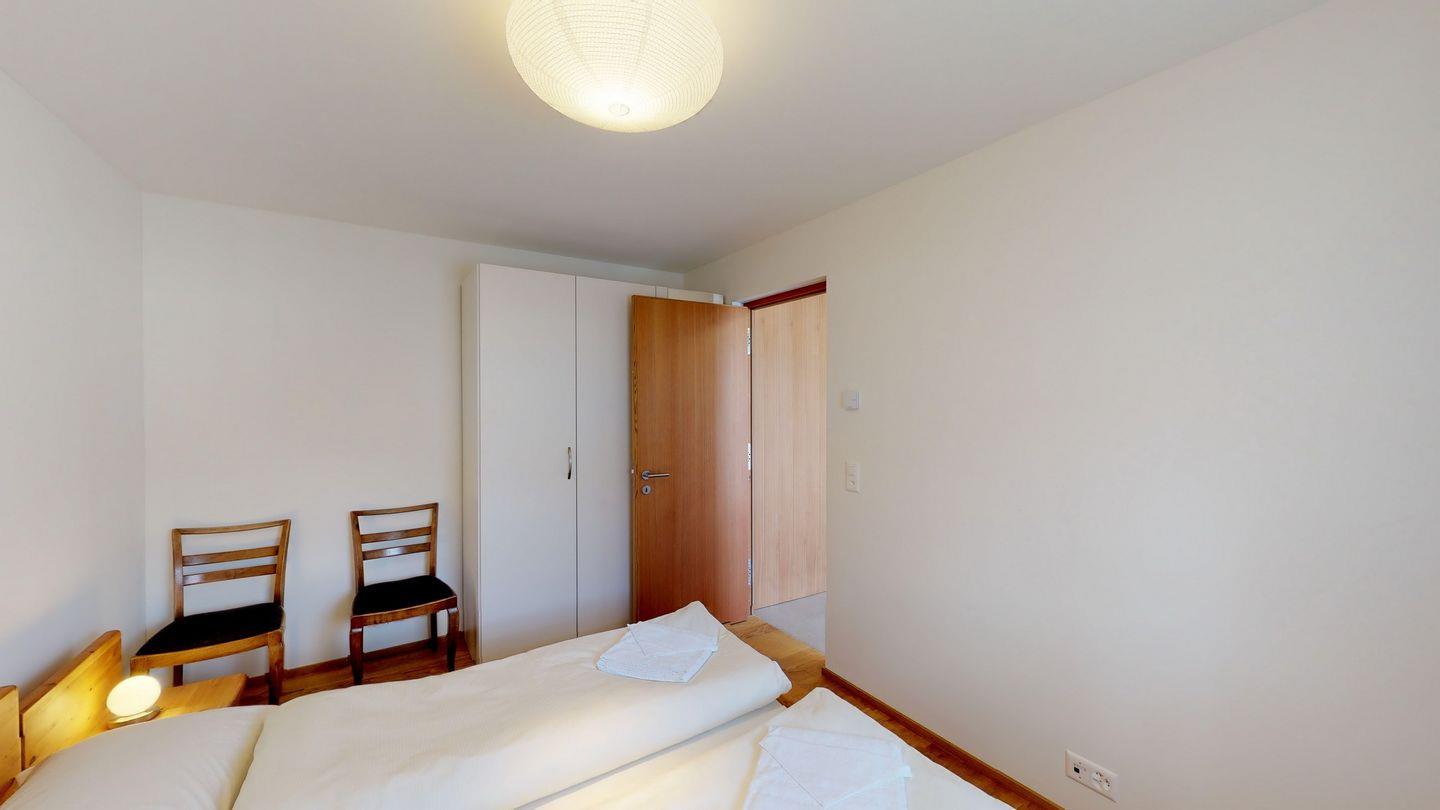 Im Eingangsbereich finden Sie eine Garderobe sowie einen verschliessbaren Abstellraum. Links geht es zum Schlafzimmer mit einem Doppelbett. Rechts geht es zum Wohnbereich mit offener Küche, Esstisch, sowie Sofa und TV. Ein Gang führt zum nächsten Schlafzimmer mit zwei Einzelbetten sowie einem Badezimmer mit Dusche. Vom Wohnzimmer gelangen Sie auf den gemütlichen Gartensitzplatz. Die Waschküche des Hauses kann bei Bedarf nach Absprache mitgenutzt werden. Ein Aussenparkplatz steht zur Verfügung.