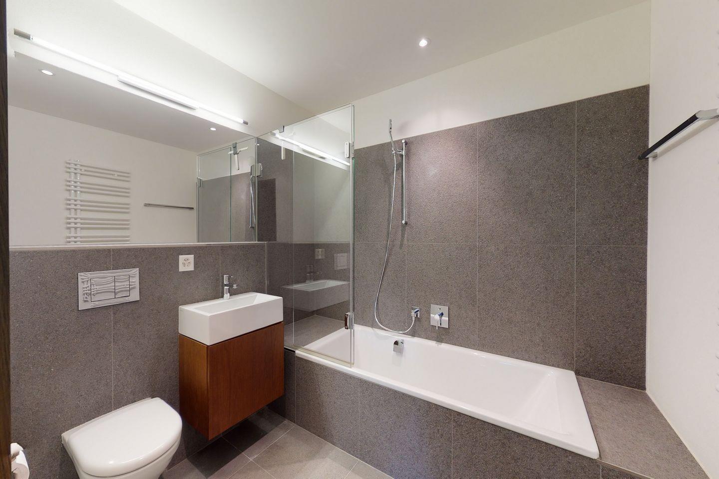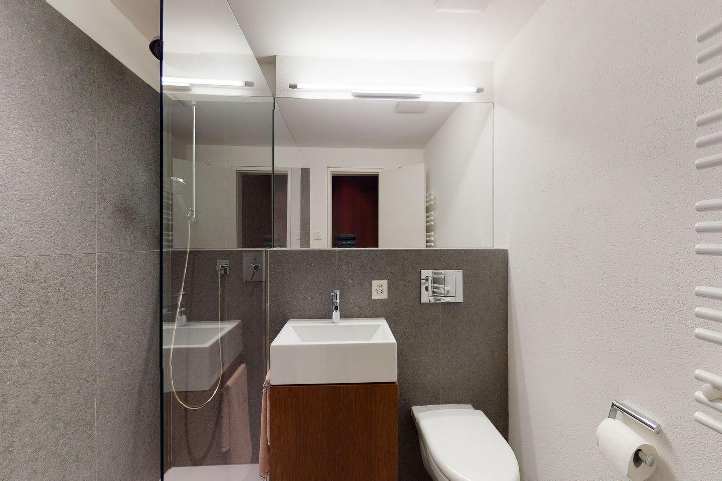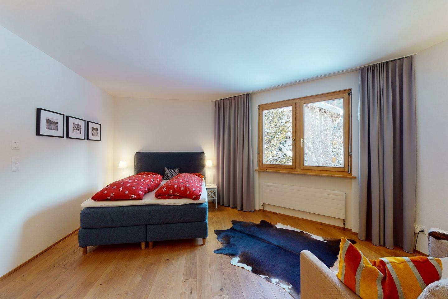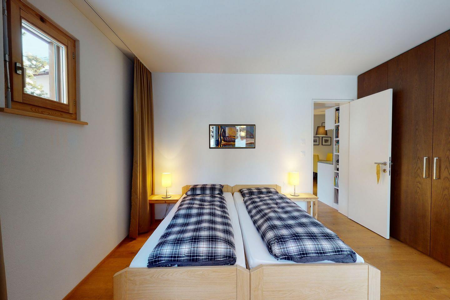 Moderne 3.5-Zimmerwohnung in Zuoz mit Südbalkon, zwei Schlafzimmern mit en suite Bädern und offener Küche. Im Winter steht ein Wellnessbereich mit Sauna, Dampfbad und Fitnessgeräten zur Verfügung. Nahe zum historischen Ortskern, Bahnhof und Sportmöglichkeiten.