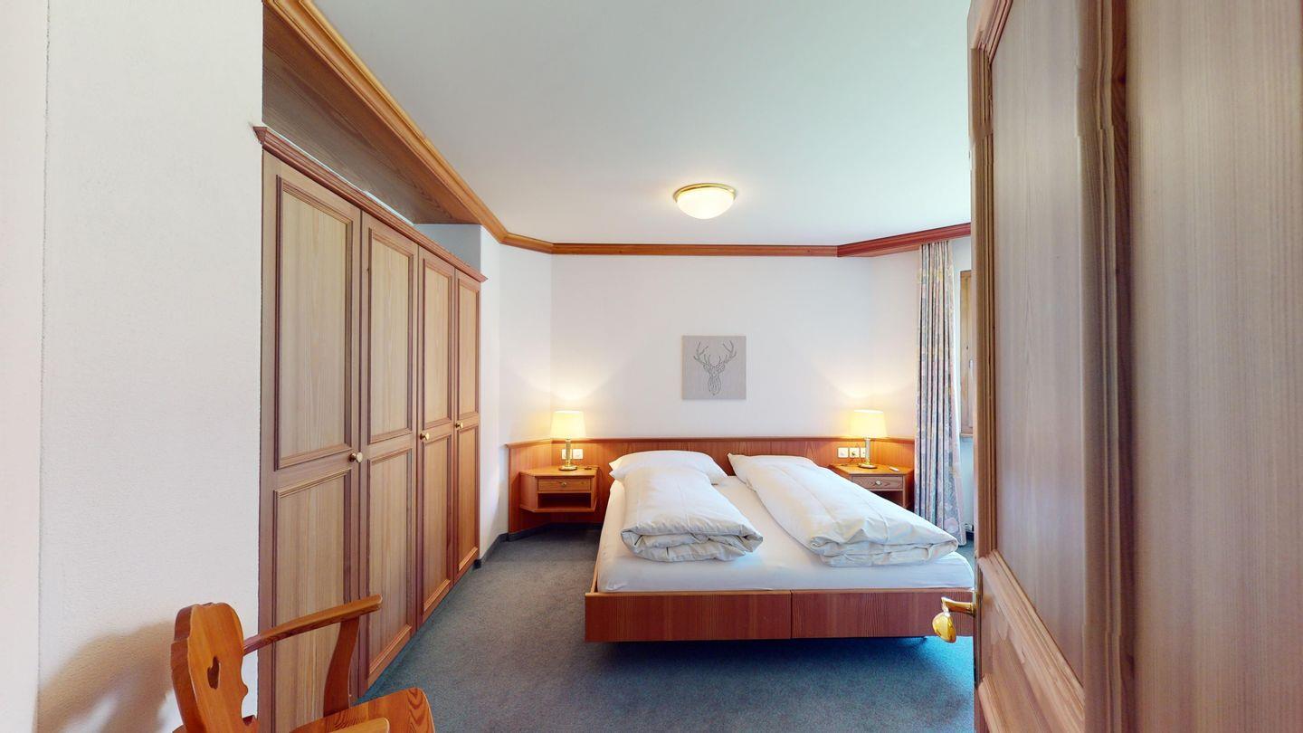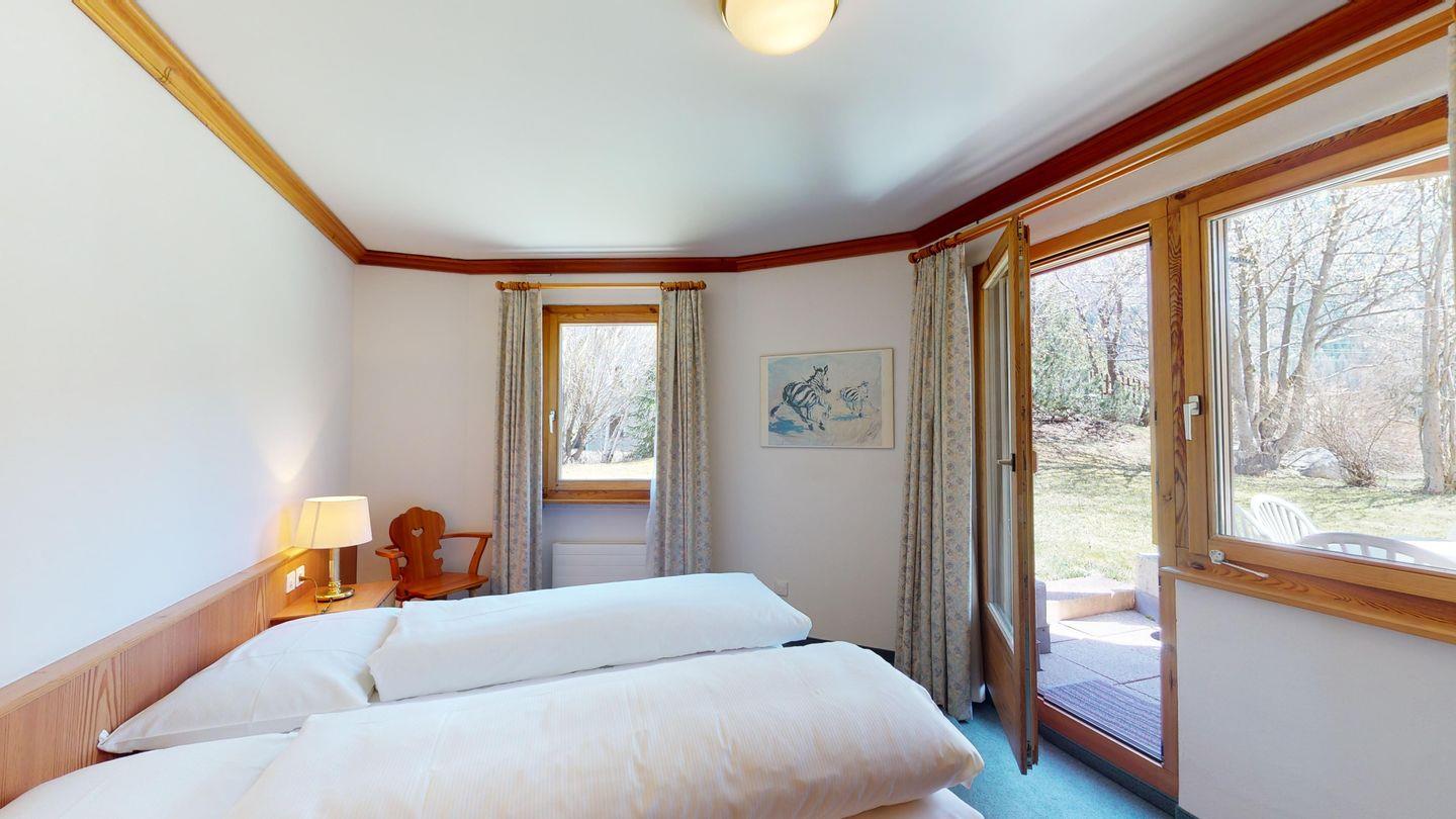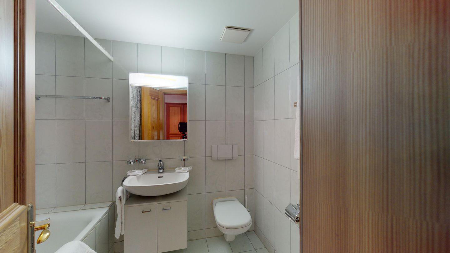 Die Ferienwohnung hat zwei Schlafzimmer mit Doppelbetten. Sie verfügt über ein Badezimmer mit Dusche und ein Badezimmer mit Badewanne. Weiter finden Sie ein geräumiges Wohnzimmer mit Essecke, und einer offenen und komplett eingerichteten Küche. Das ersichtliche Cheminée darf aus Sicherheitsgründen nicht benutzt werden. Vom Wohnzimmer, wie auch vom einen Schlafzimmer gelangen Sie auf den sonnigen Südbalkon. Ein Skiraum steht zur gemeinschaftlichen Nutzung zur Verfügung. Ein Garagenplatz kann kostenpflichtig dazu gebucht werden.