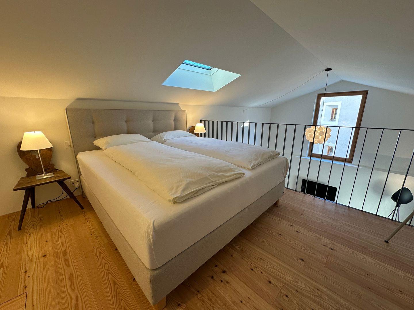 Die Giardin-Wohnung bietet eine romantische Rückzugsmöglichkeit in einem sorgfältig renovierten Engadinerhaus. Der historische Charakter dieses Anwesens, kombiniert mit modernem Wohnkomfort, schafft eine besondere Atmosphäre. Die Wohnung selbst besticht durch ein grosszügiges Wohnzimmer mit offener Küche und mit hohen Decken sowie einer offenen Galerie, auf der sich das komfortable Doppelbett befindet.