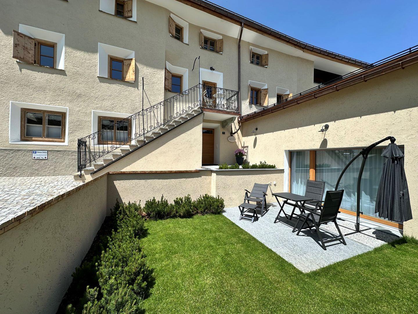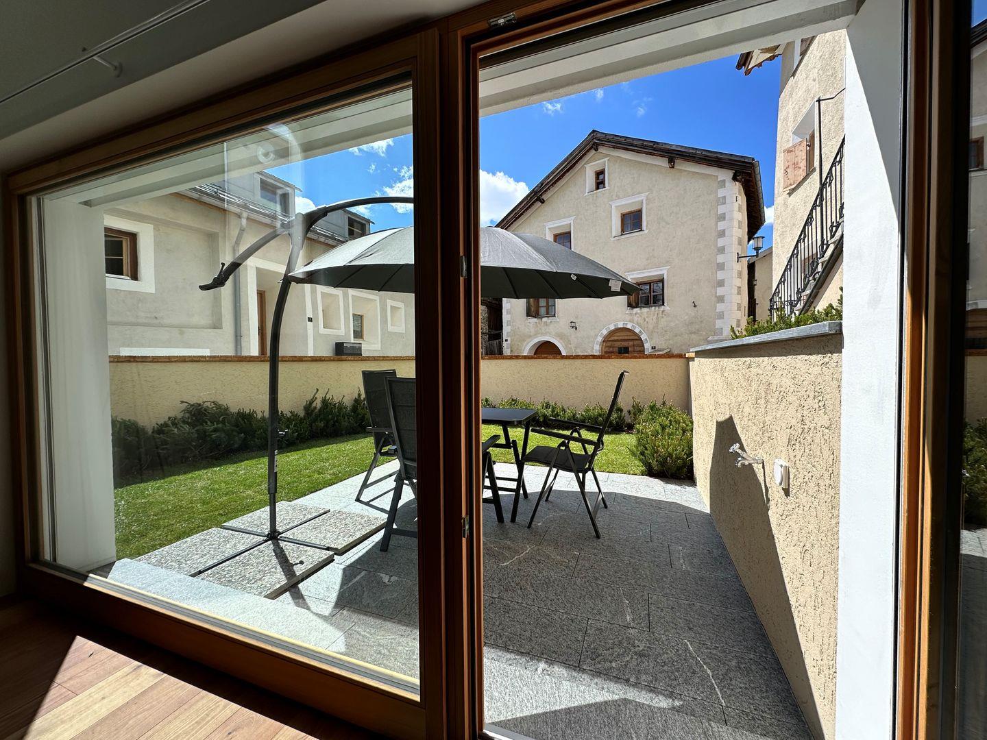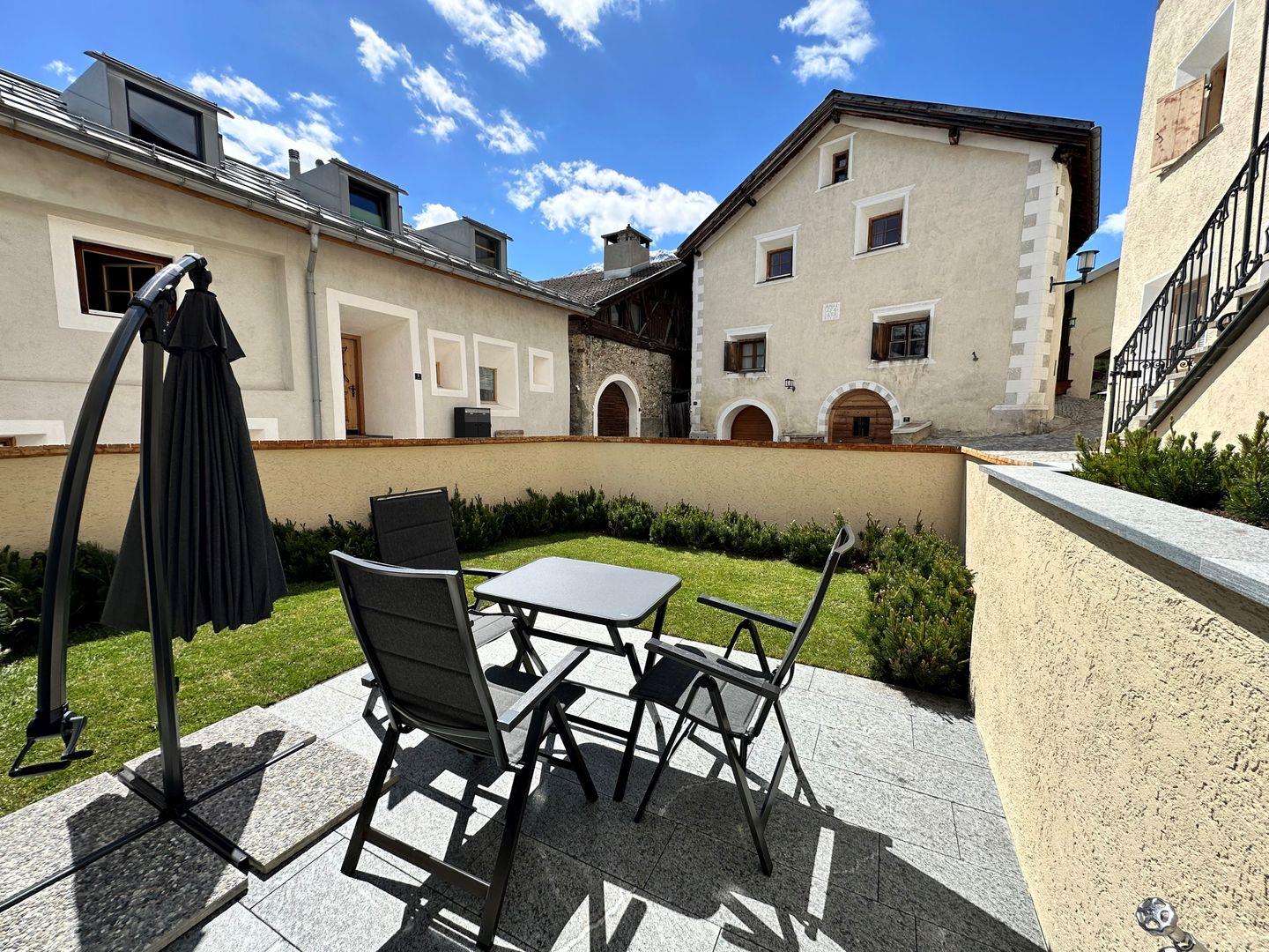 Im Sommer haben Sie direkten Zugang zu einem idyllischen Garten – ideal, um die frische Engadiner Luft zu geniessen. Die voll ausgestattete Küche sowie das moderne Bad mit Dusche bieten alles, was Sie für einen unbeschwerten Aufenthalt benötigen. Ein zusätzliches Bettsofa im Wohnbereich schafft weitere Schlafmöglichkeiten.
