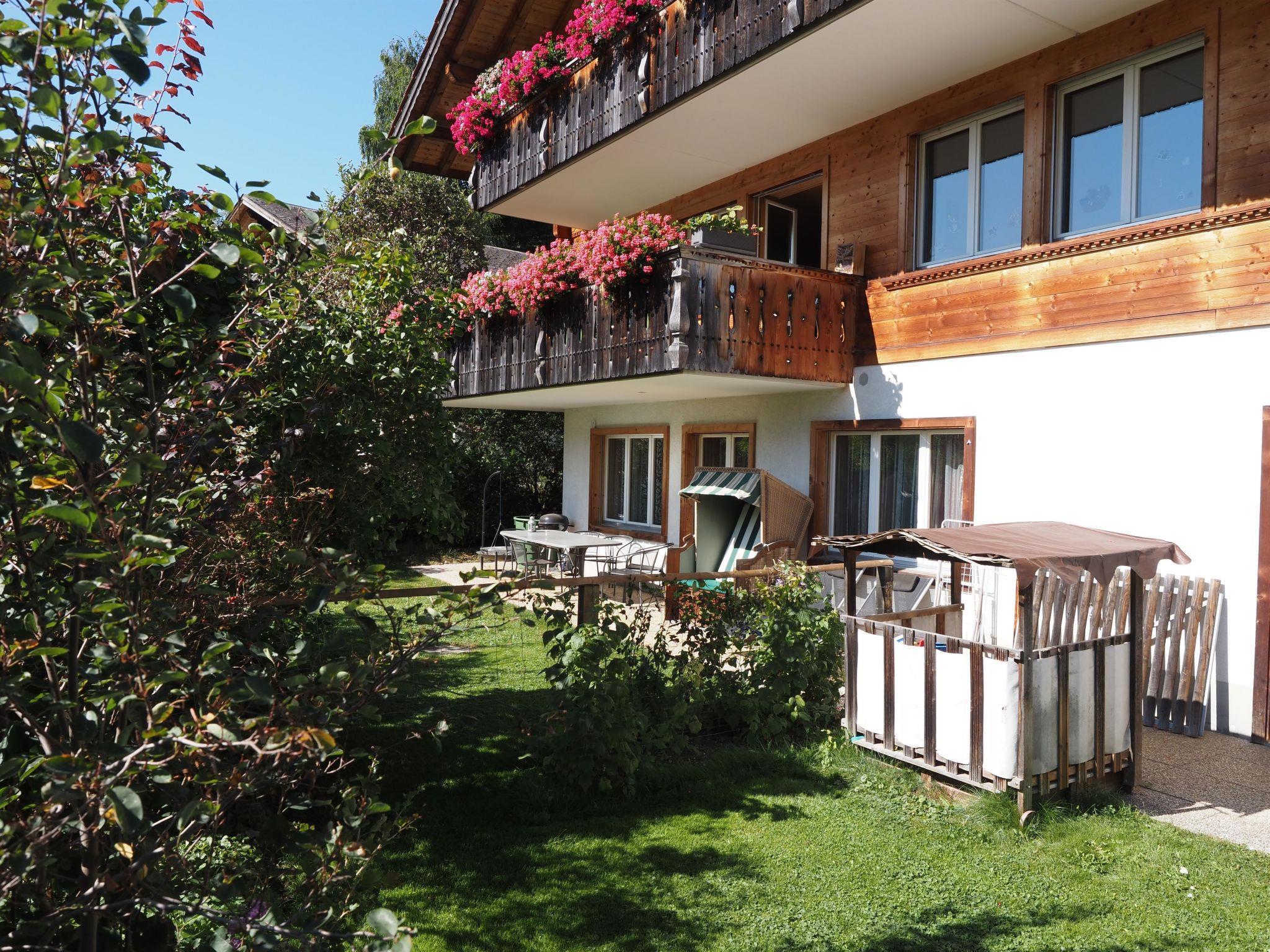 110 m2. More information by the provider: 3 room apartment (110sqm) on the ground floor in a multi-family house built in 1995 and renewed in 2009 (bed rooms and kitchen). The bathroom has been completely renewed in 2011. The building is situated slightly higher on the mountain slope, which guarantees you a beautiful view to the Rinderberg. Access to the chalet by stairs. The terrace includes a sandbox for the kids and a barbecue. Second parking space, washing machine and the tumble dryer available on request. The owner lives in the same building. Enjoy rush of the tiny rivulet (Ryschbach) which is flowing right next to the building. The holiday flat "Hübeli (Kopp)", which is offered by the same owners, is only 20m away.