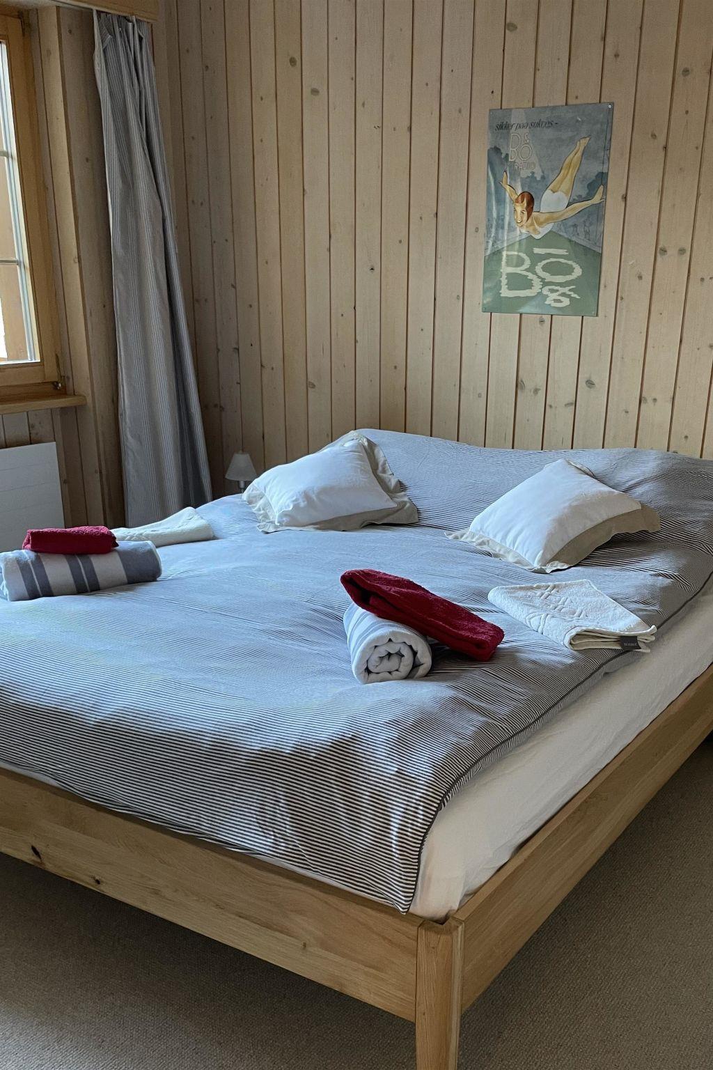 Living/dining room with open-plan kitchen (among other things furnished with hob, oven, microwave, refrigerator with deep-freeze compartment, dishwasher, coffee machine with capsules (Nespresso) as well as a fondue- and raclette set), dining table, seating area and TV system, 1 bedroom with a double bed (160x200cm), 1 bedroom with 2 single beds (2x90x200cm). Bathroom with bathtub/WC. WiFi. High chair available.